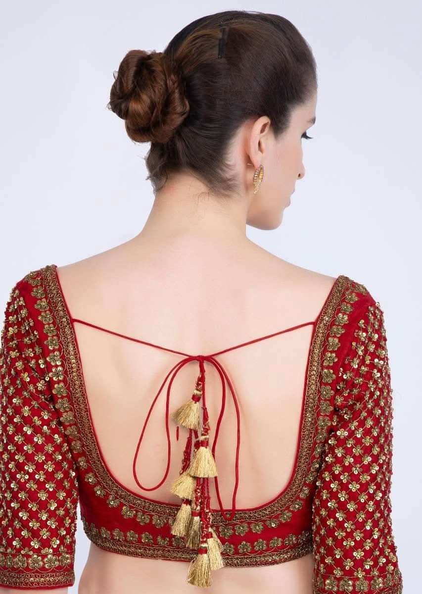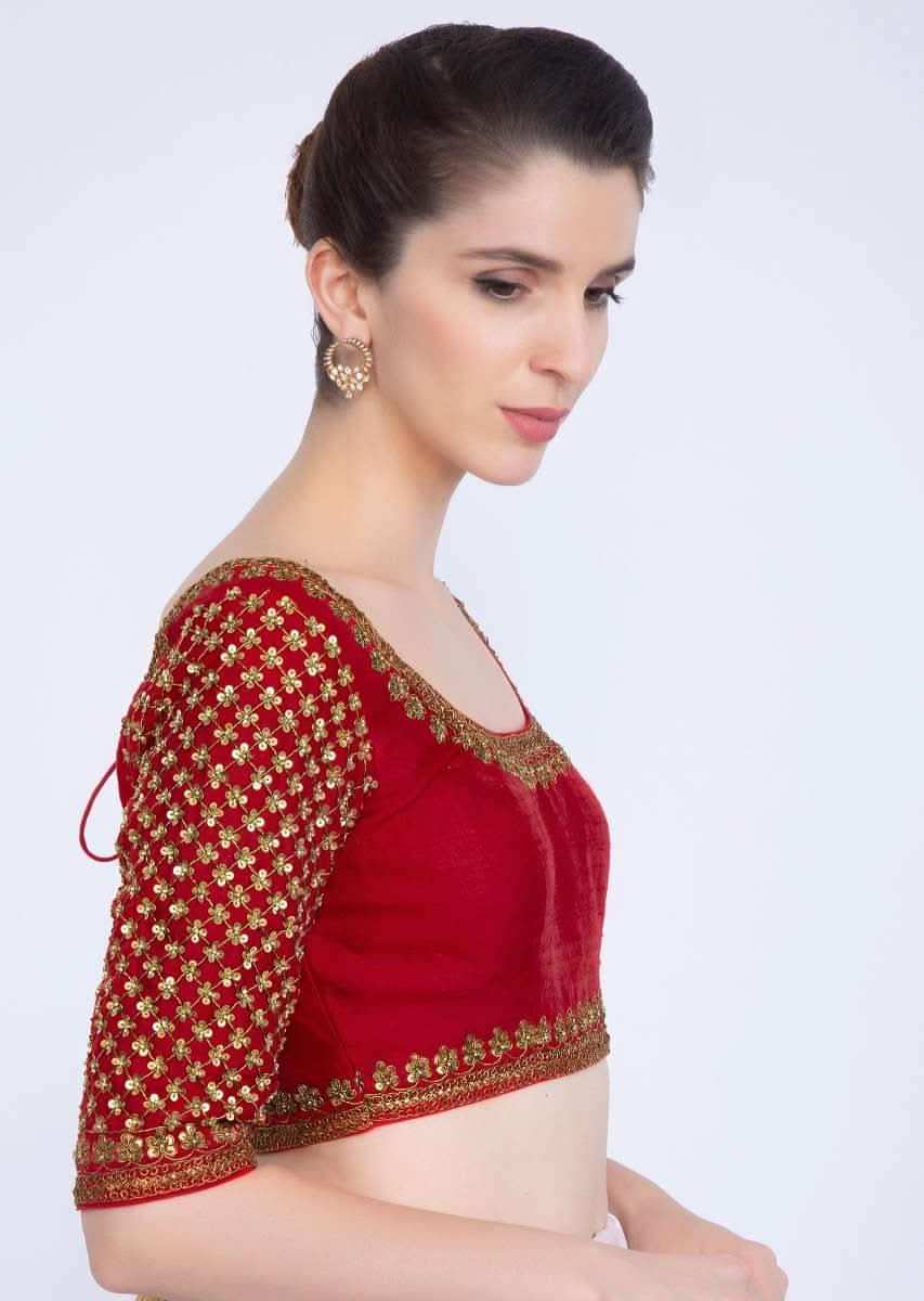 - Red raw silk blouse with checks jaal embroidered sleeves.