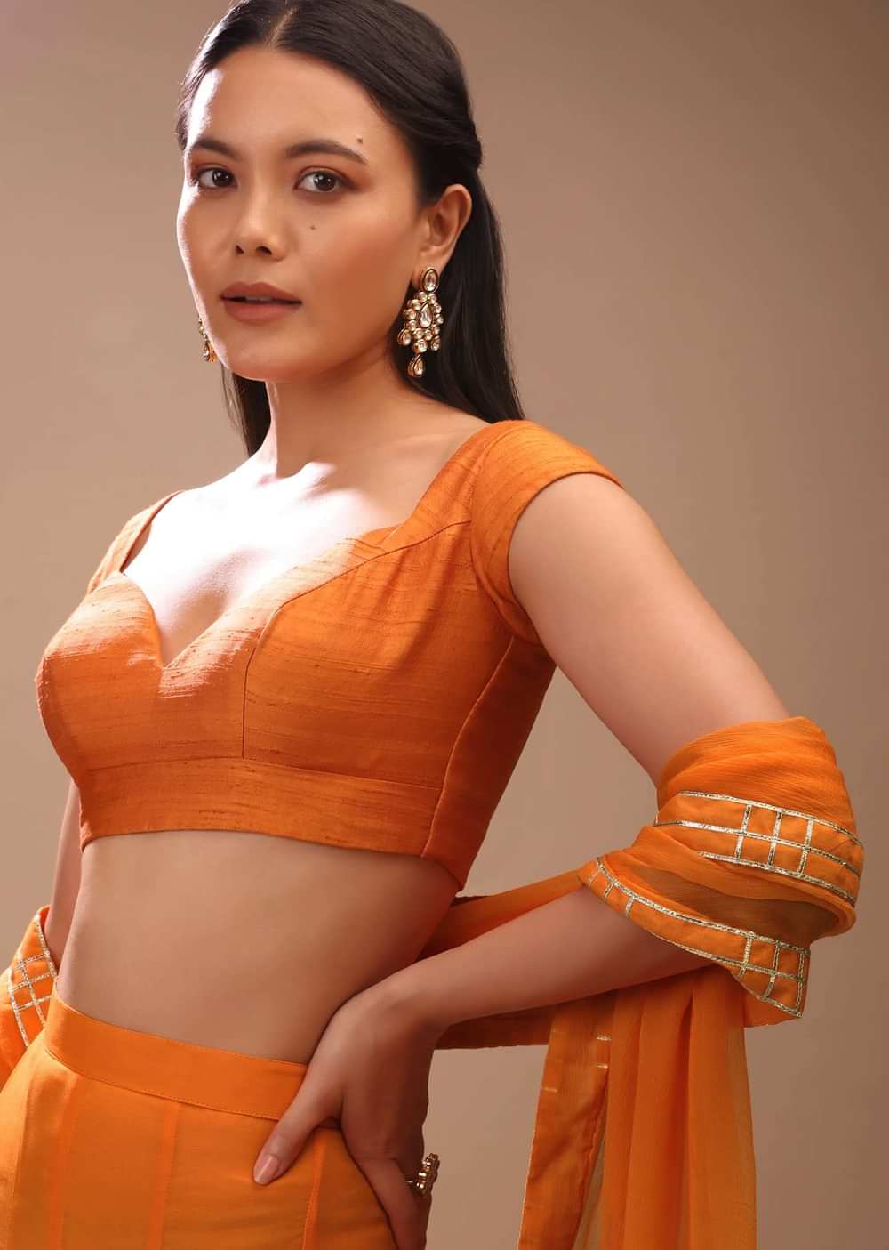 Russet Orange Blouse In Raw Silk With Sweetheart Neckline And Cap Sleeves