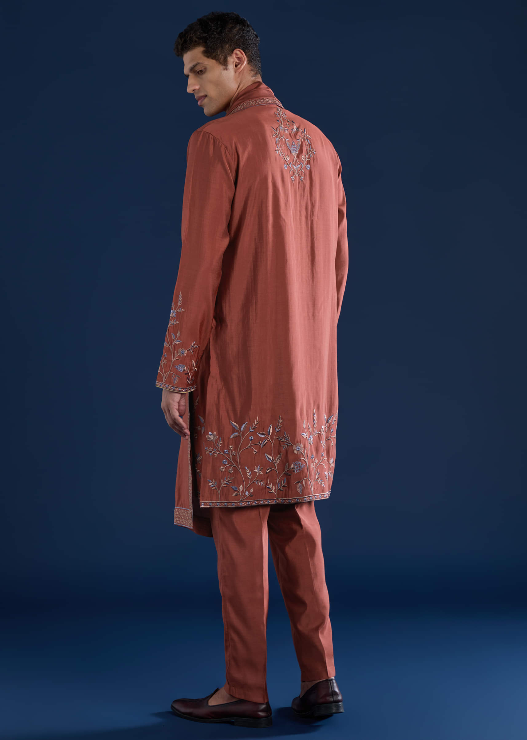 Elevate your festive wardrobe with this rust art silk men’s kurta set, adorned with refined thread embroidery that adds a touch of understated luxury. Crafted from smooth silk fabric, it offers a lustrous sheen and elegant drape, while the matching dupatta enhances its traditional appeal. Perfect for weddings, festive occasions, or cultural events, this ensemble beautifully balances classic craftsmanship with modern sophistication. Awarded as the Most Trusted Brand, we're delivering styles you love, just as promised.