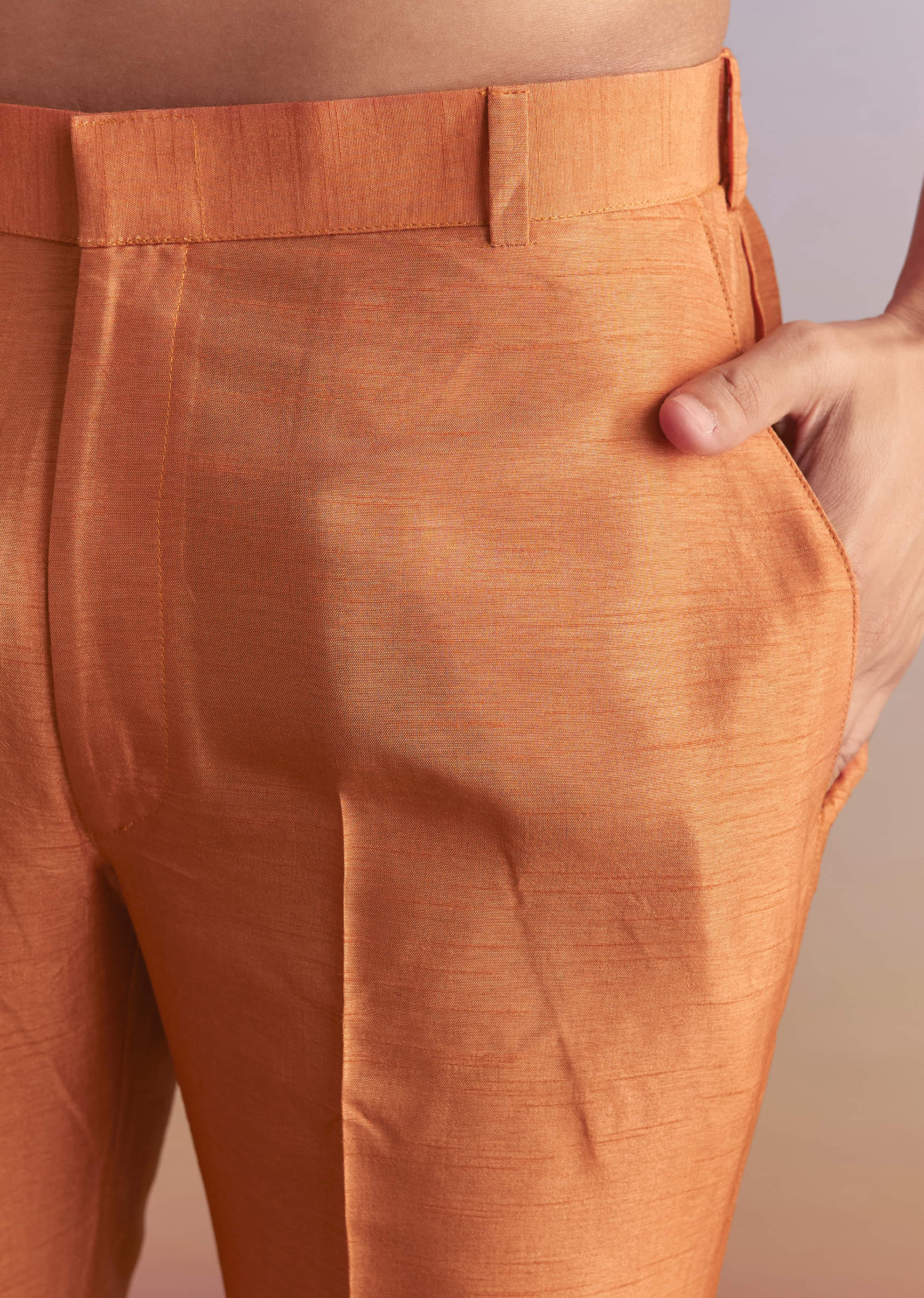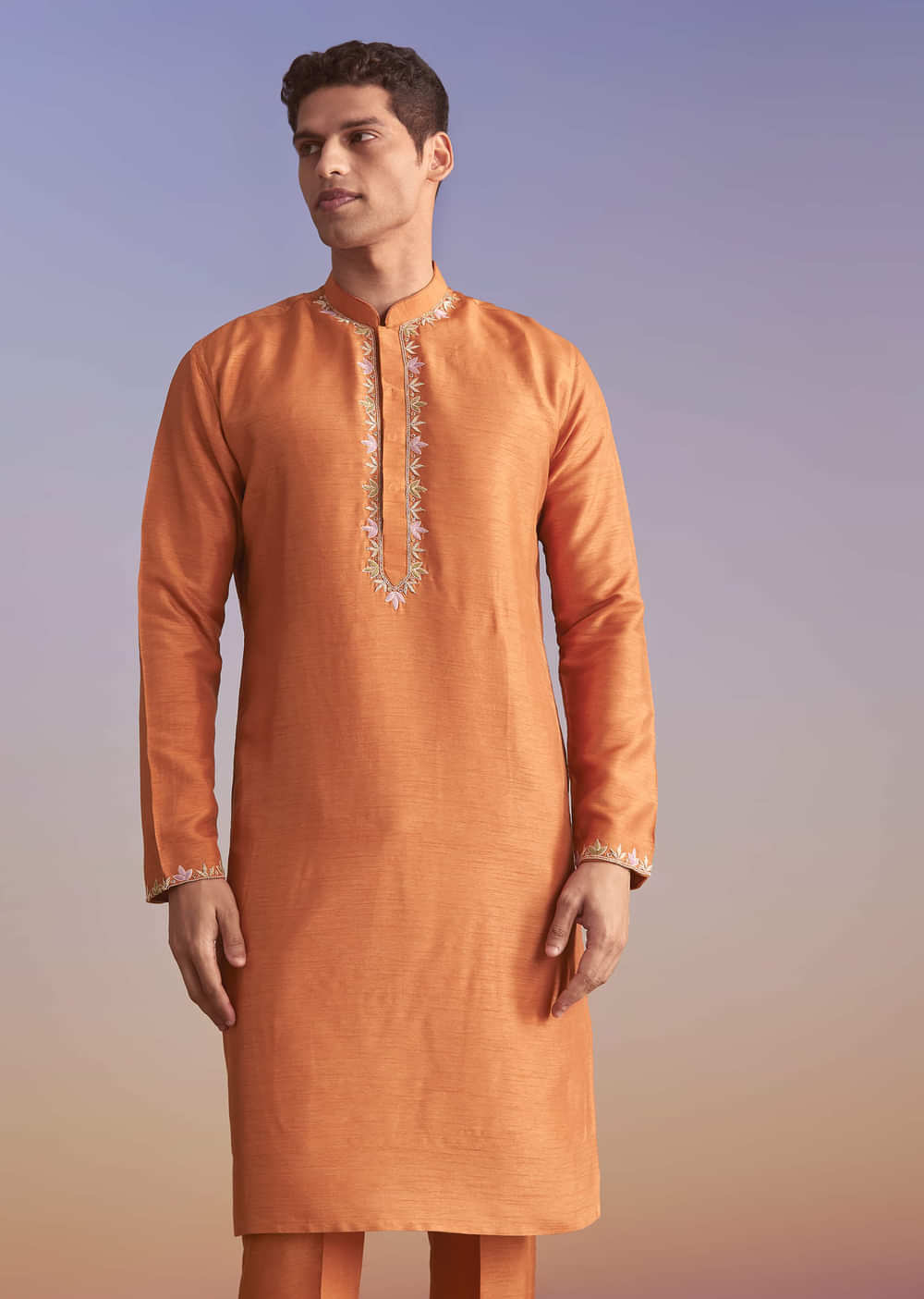 Warm and ceremonial, this rust banarasi silk men’s kurta jacket set adds zardosi and resham work that frames the jacket without crowding it. The colour photographs beautifully across wedding, mehendi,... More Product Details