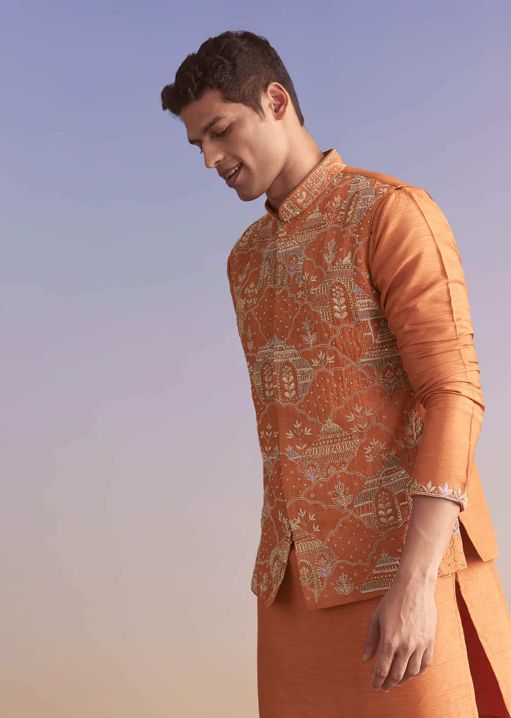 Rust Banarasi Silk Kurta Jacket Set For Men With Embroidery