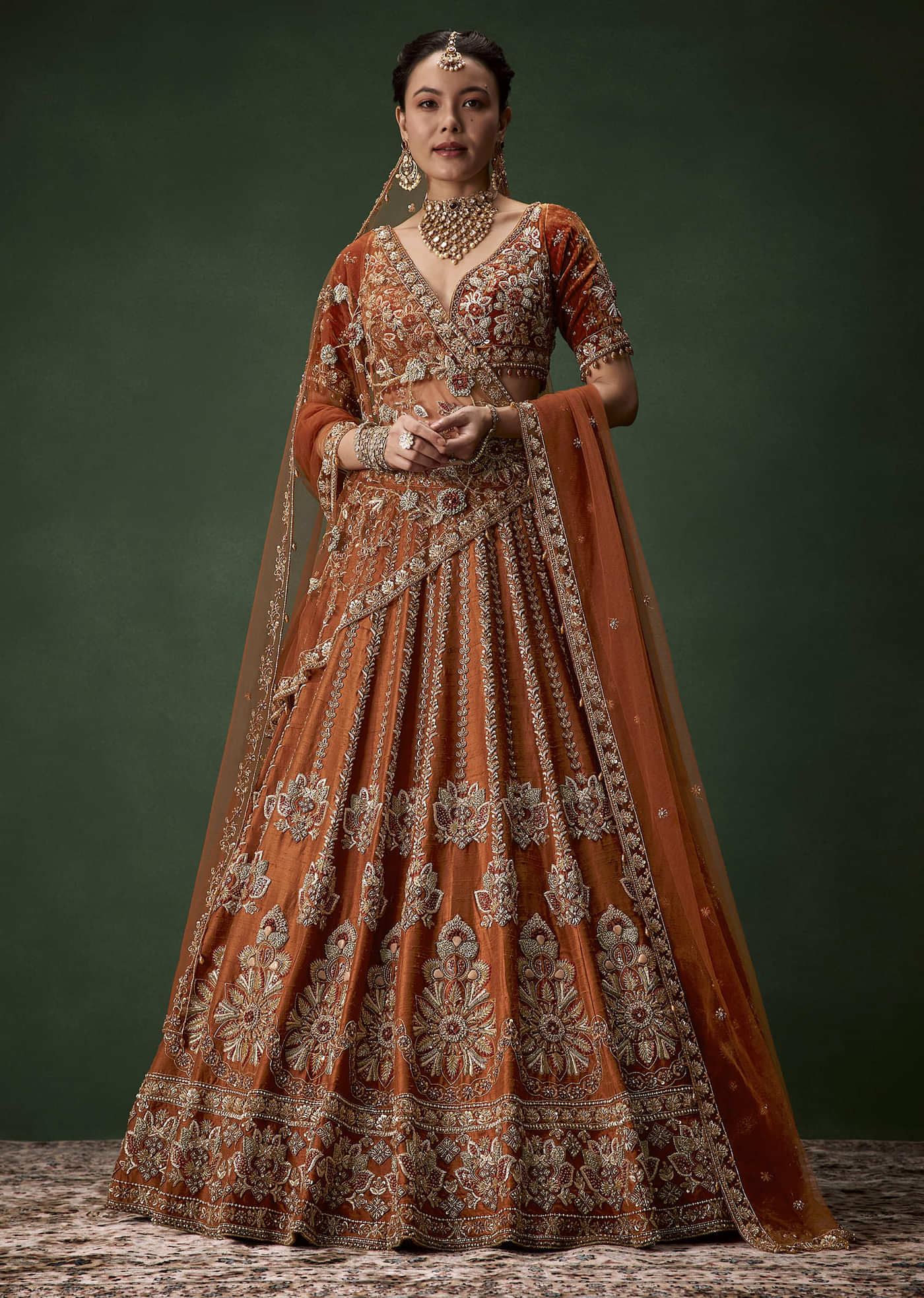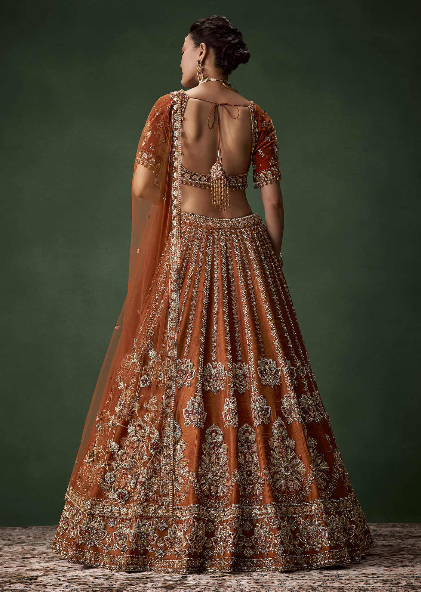 A celebration of regal bridal artistry, this rust raw silk lehenga set brings richness to your wedding look. Meticulously embellished with zardozi and stone detailing, the ensemble showcases intricate craftsmanship... More Product Details