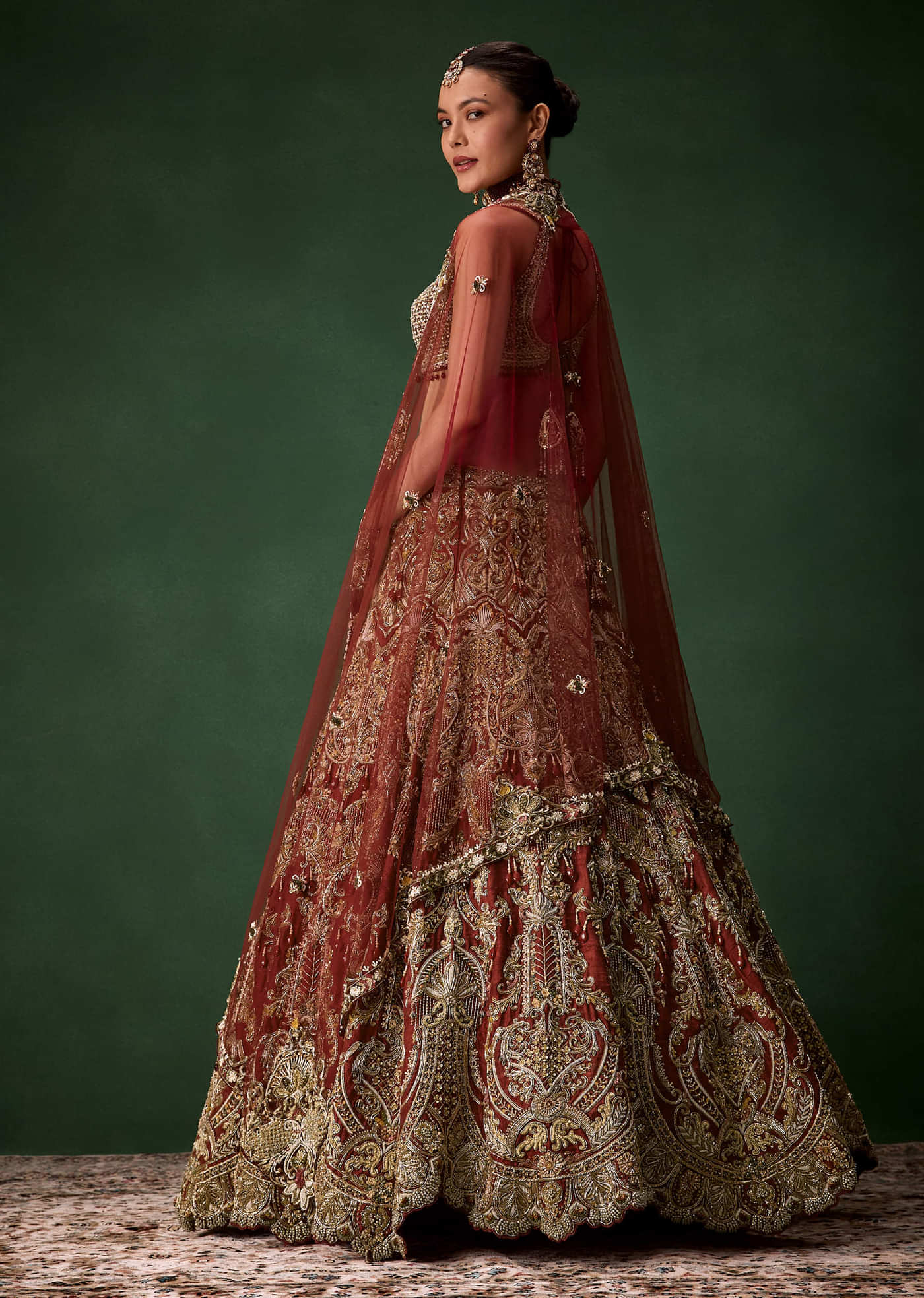 Crafted for the bride who embraces tradition with a bold spirit, this rust silk lehenga set radiates refined celebration glamour. The intricate zardozi, cut dana, sequins, and embroidery work create... More Product Details