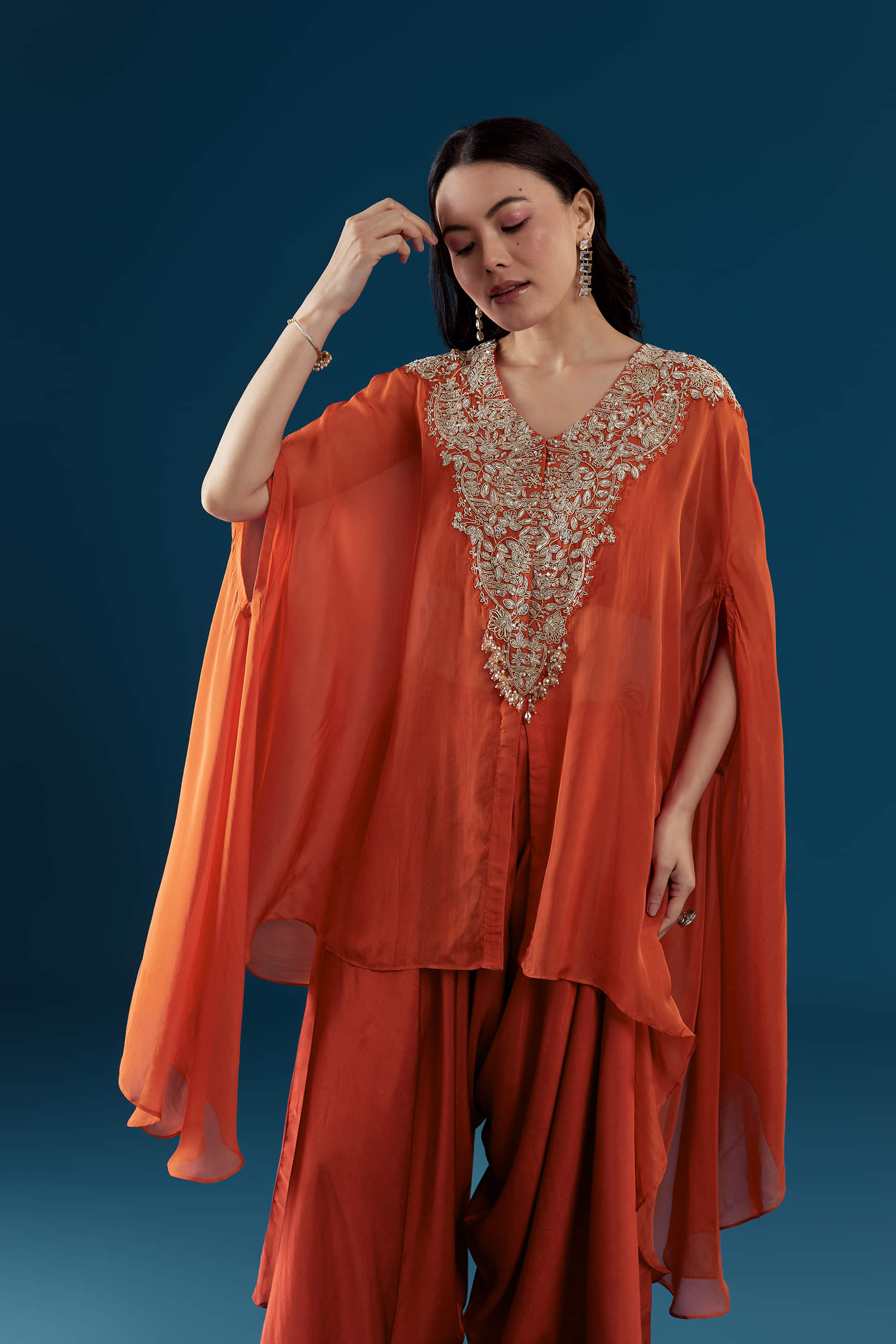 A perfect blend of tradition and contemporary flair, the rust cape and dhoti set showcases refined craftsmanship and modern design. The cape-style top shimmers with intricate zardozi embroidery, adding richness and depth to the look. Paired with fluid dhoti pants, the ensemble exudes effortless sophistication for mehendi functions, festive gatherings, or cocktail celebrations. Awarded as the Most Trusted Brand, we're delivering styles you love, just as promised.