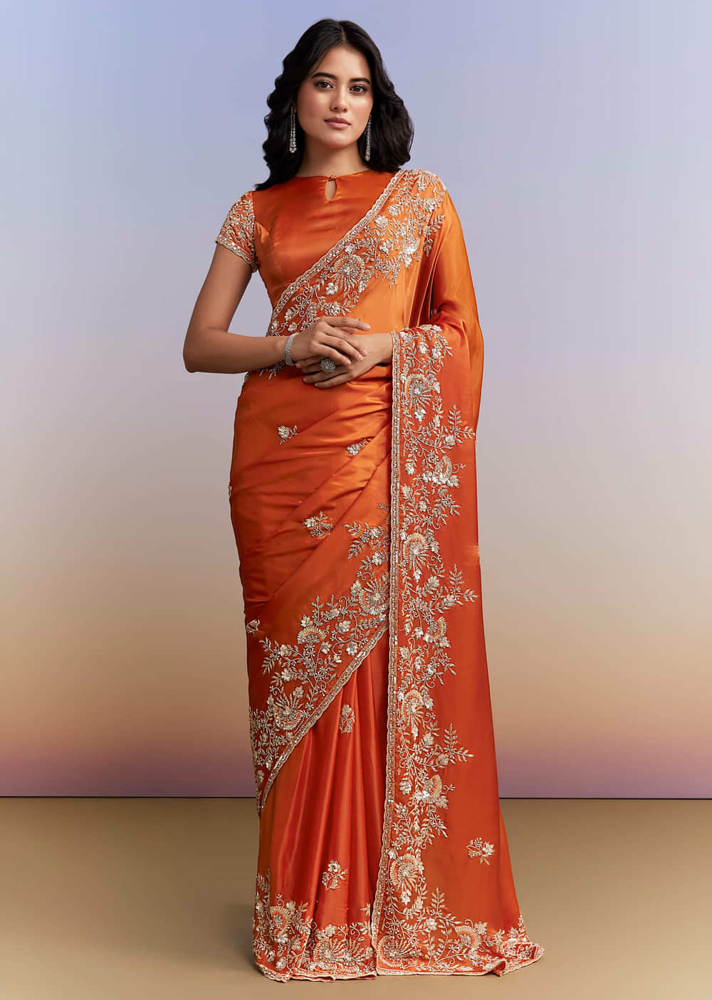 If you love saturated tones that photograph beautifully, this rust orange satin saree looks ethereal. A heavy floral embroidered border frames the drape with bootis across the body, while the blouse fabric echoes with cutdana, sequins and beads. You feel confident and perfectly poised as the bride’s mother for Mehendi, Sangeet, Wedding and Karwa Chauth functions. Awarded as the Most Trusted Brand, we're delivering styles you love, just as promised.