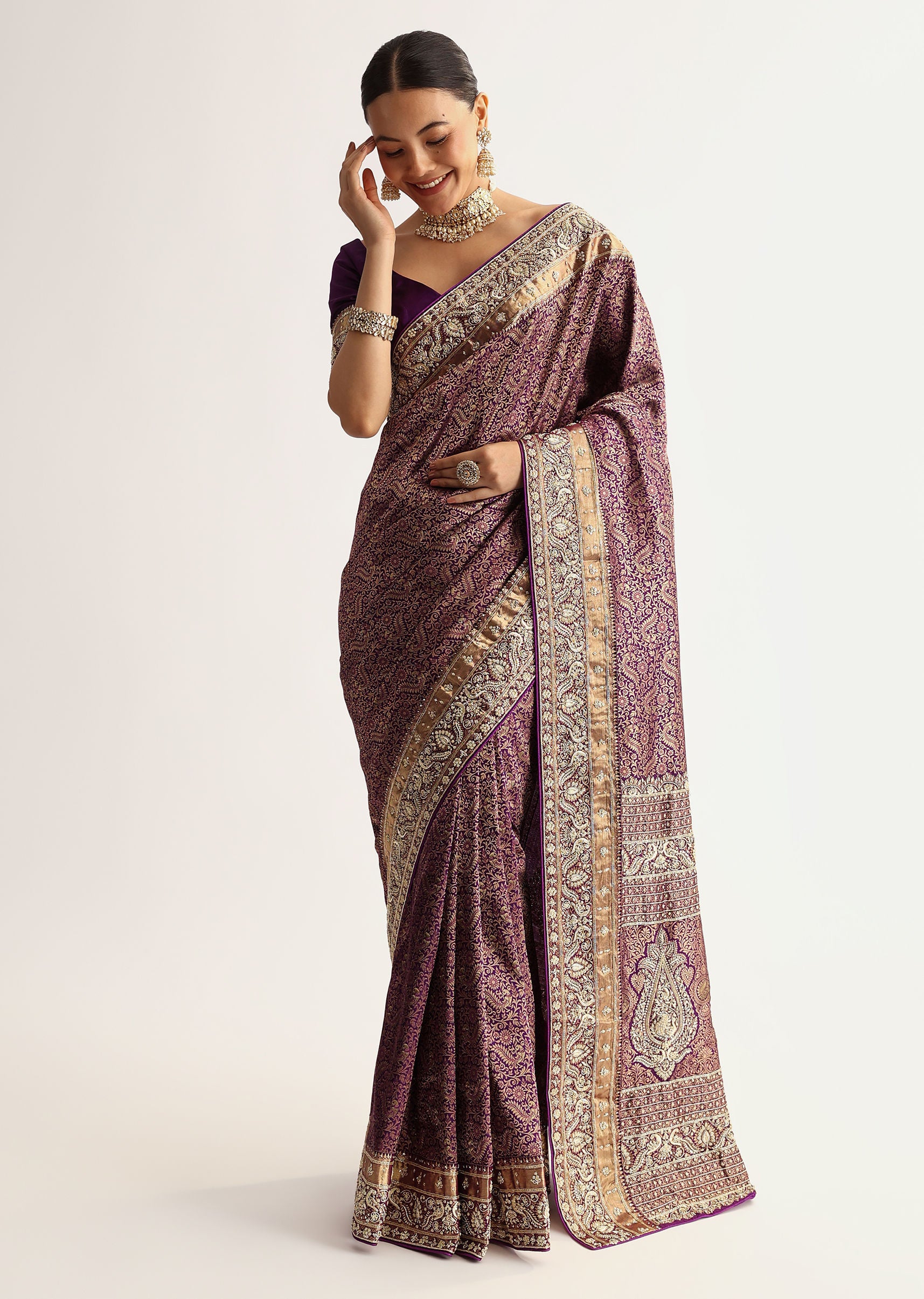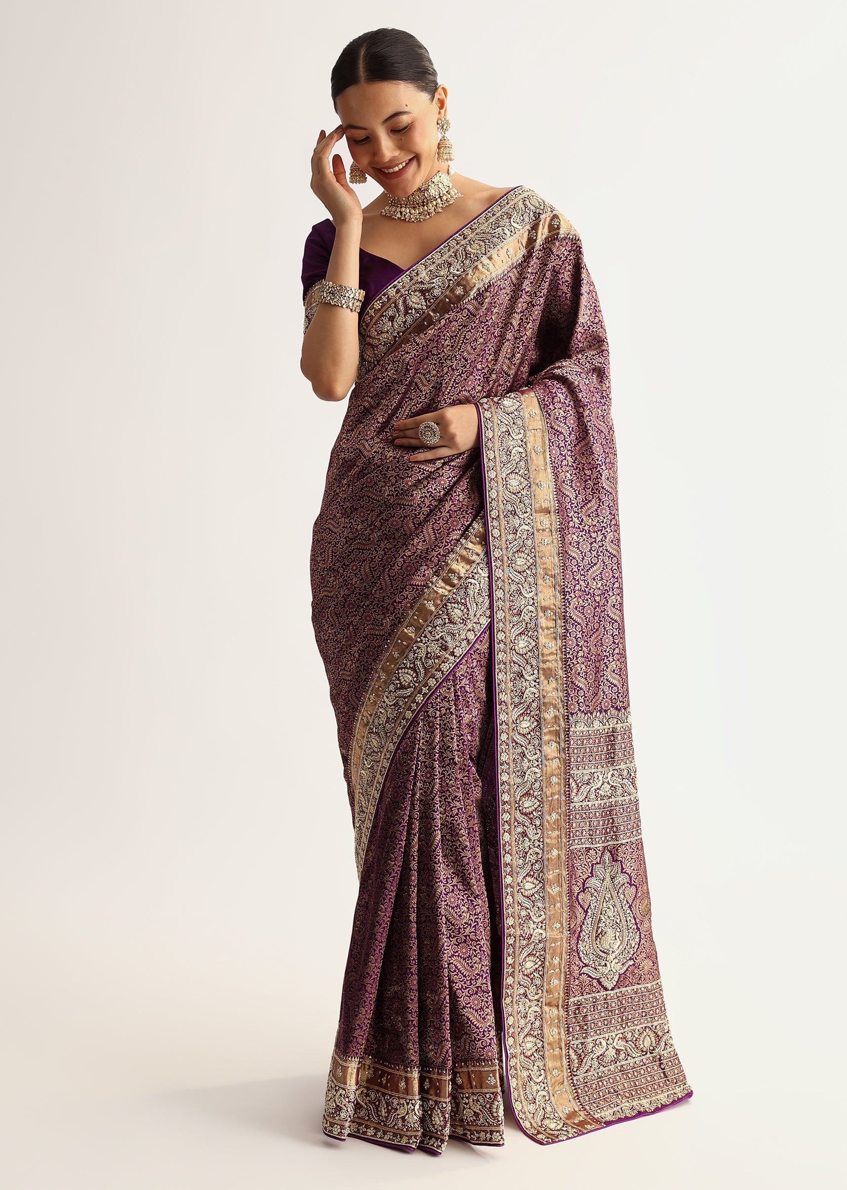 This rust pink tissue saree is richly detailed with zardosi, cutdana, sequins, and beads. Romantic hues enhance its traditional appeal. The blouse mirrors the saree’s elaborate work. Ideal for festive wear. Awarded as the Most Trusted Brand, we're delivering styles you love, just as promised.