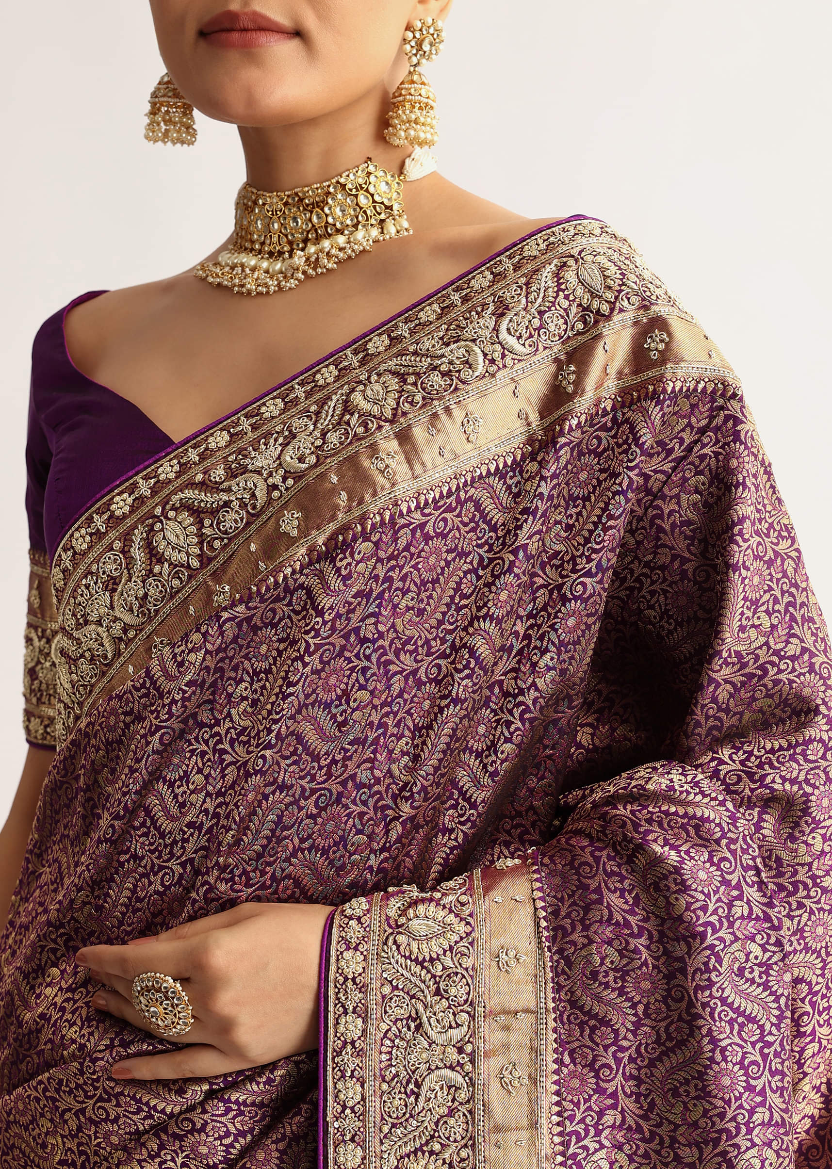 This rust pink tissue saree is richly detailed with zardosi, cutdana, sequins, and beads. Romantic hues enhance its traditional appeal. The blouse mirrors the saree’s elaborate work. Ideal for festive... More Product Details