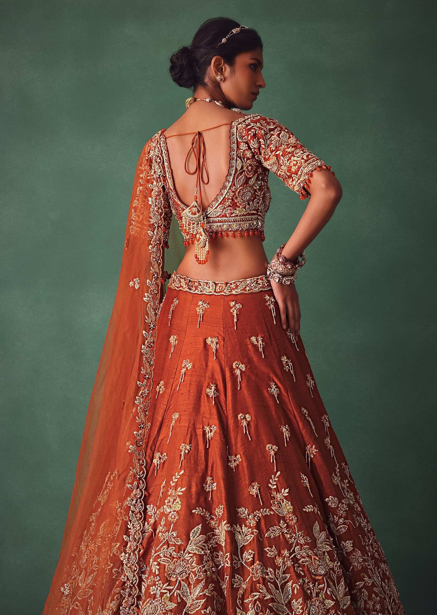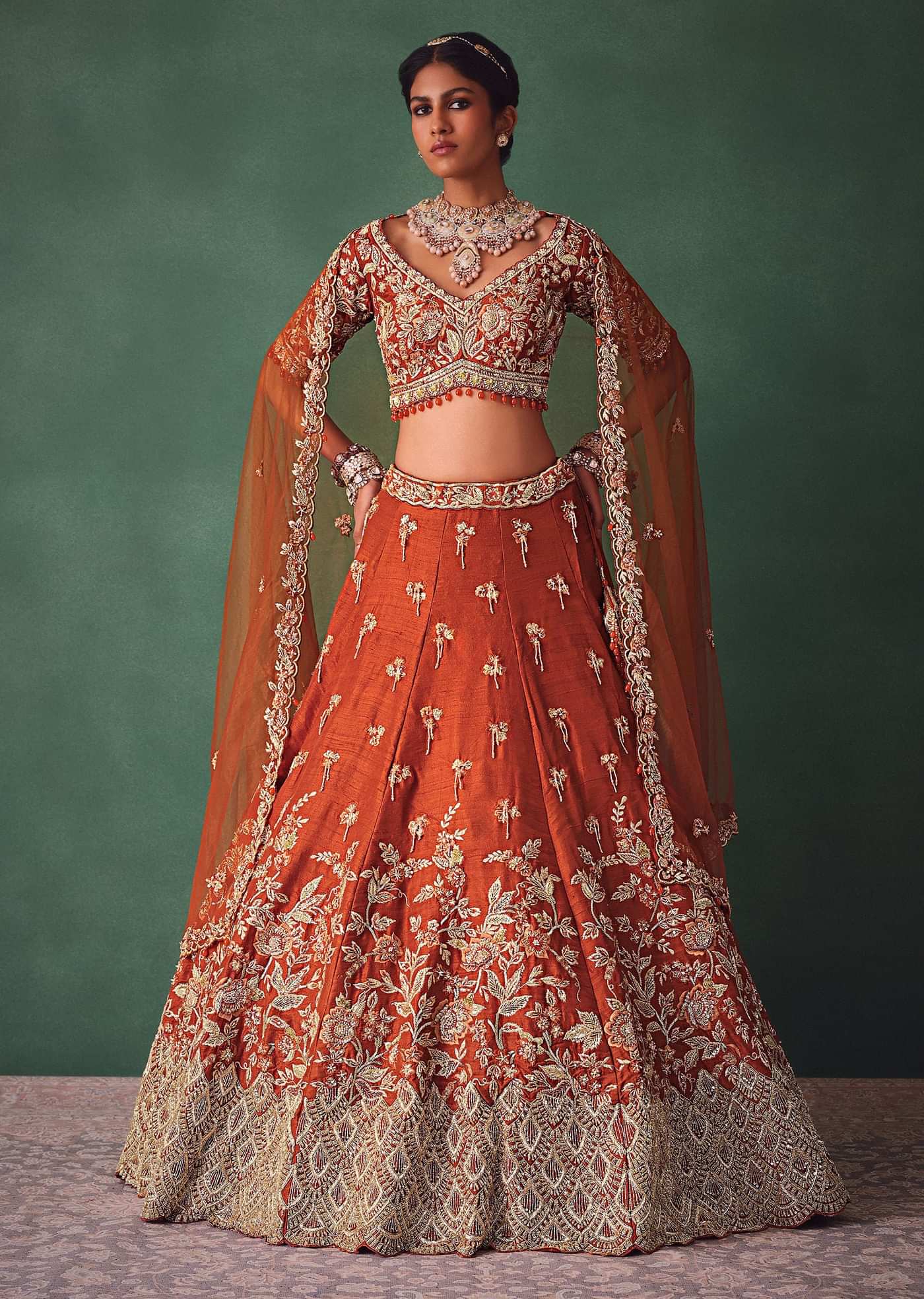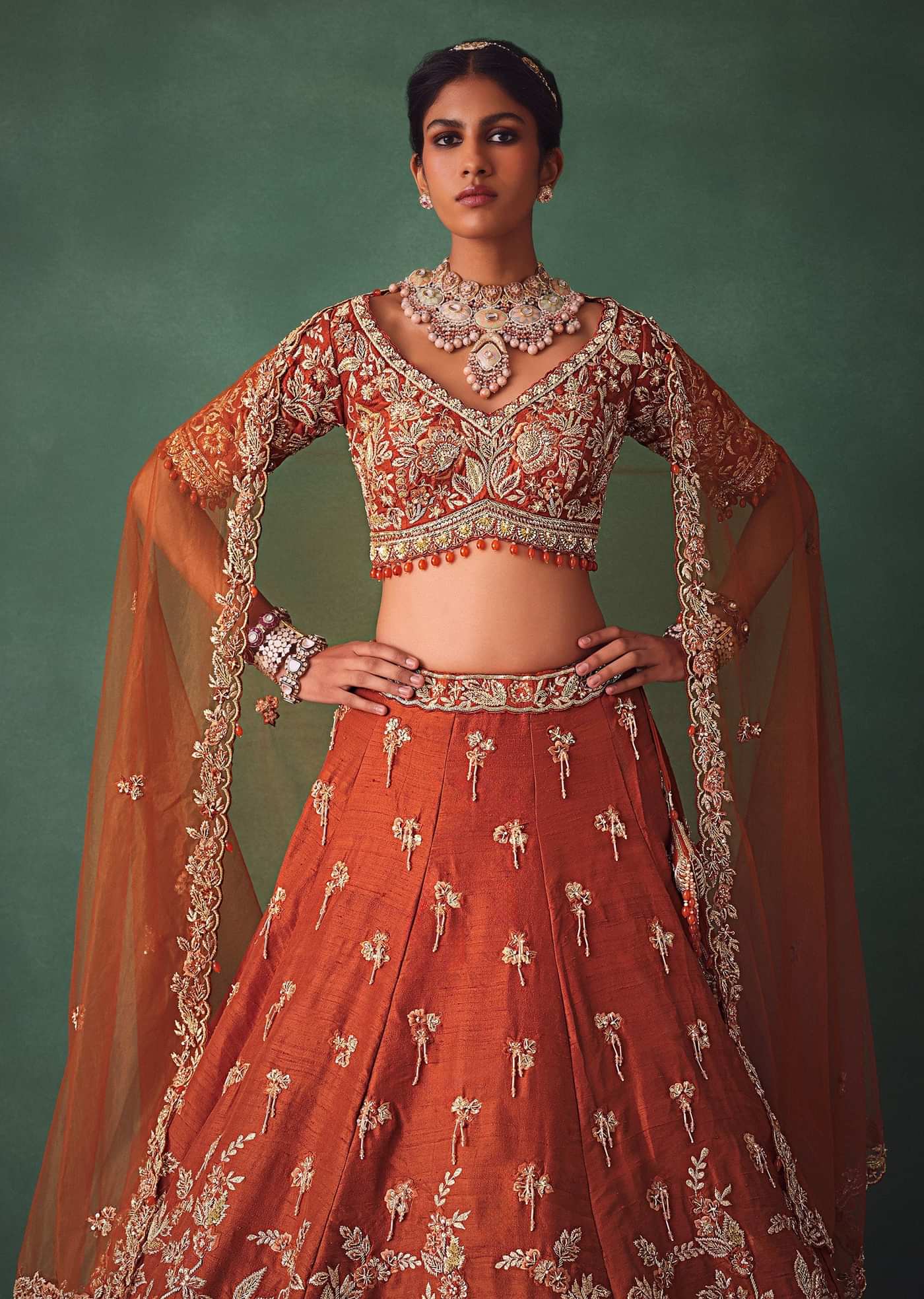 Rust Raw Silk Bridal Kali Lehenga With Embroidered Blouse And Dupatta