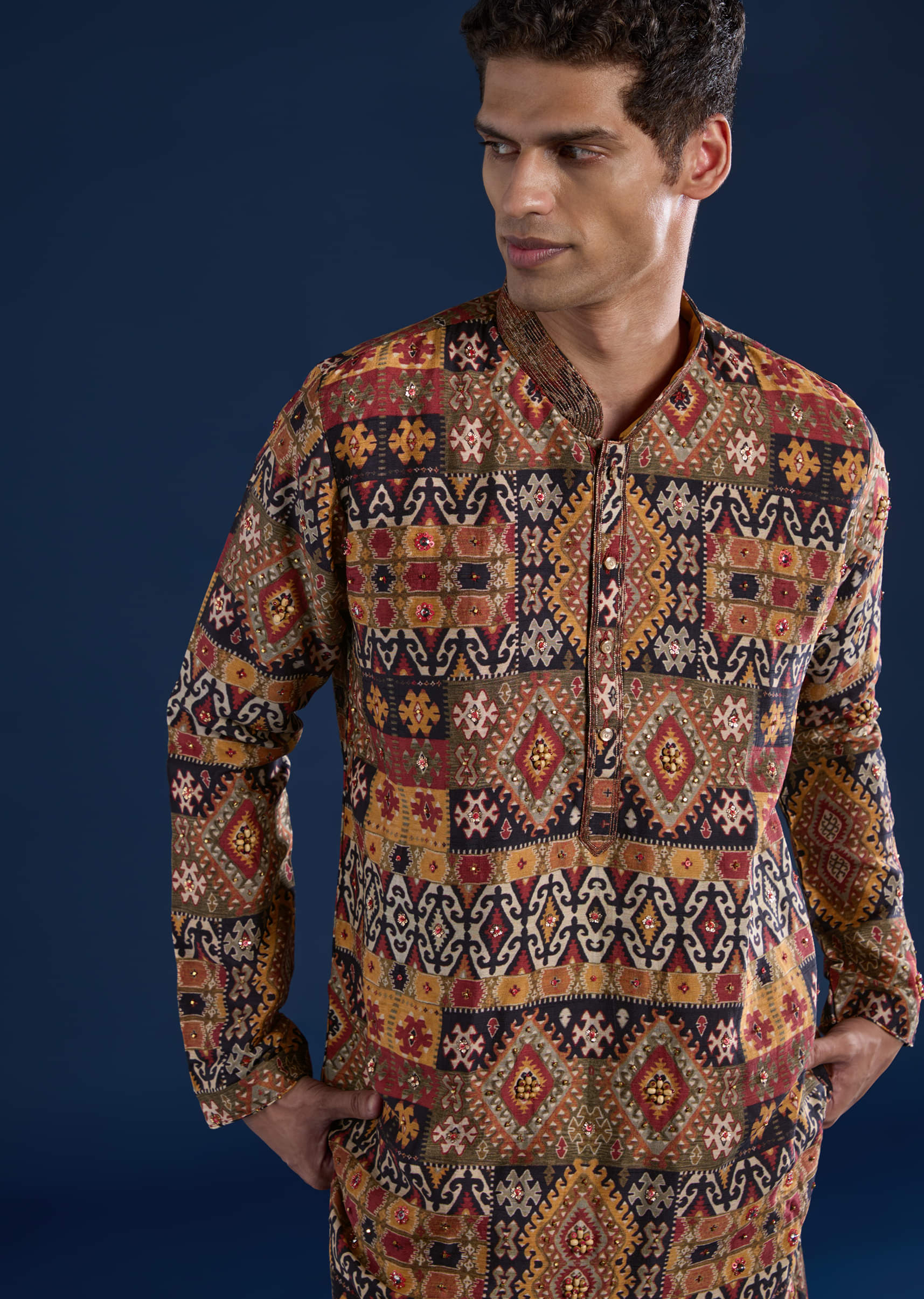 Rust Rawsilk Printed Mens Kurta and Pant Set
