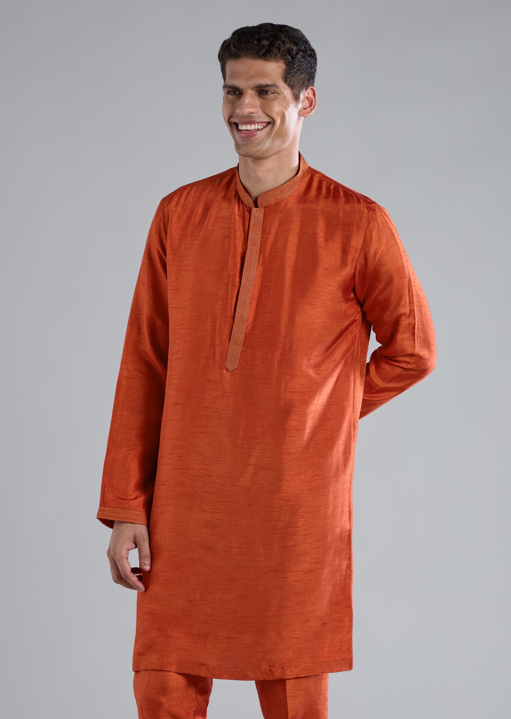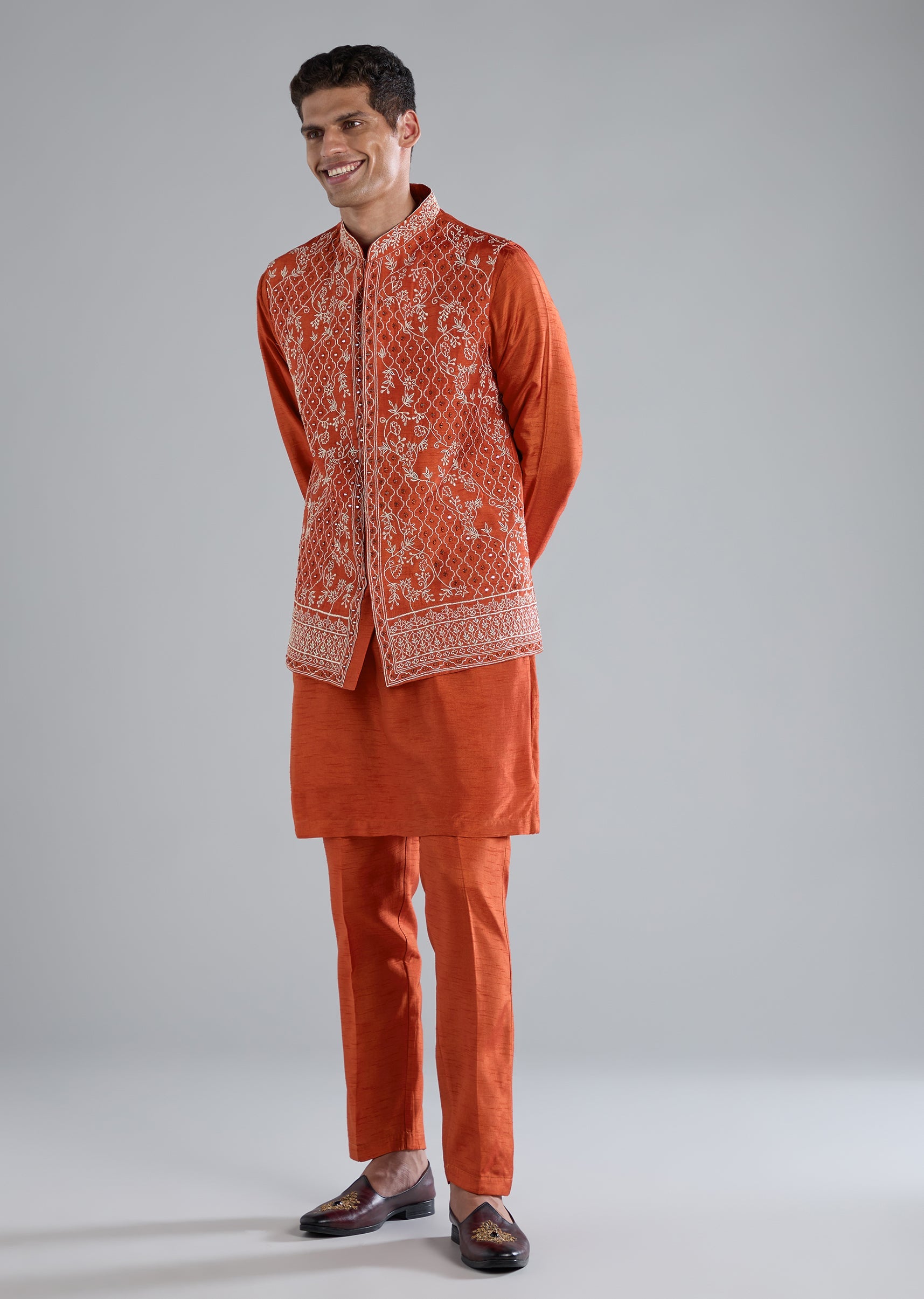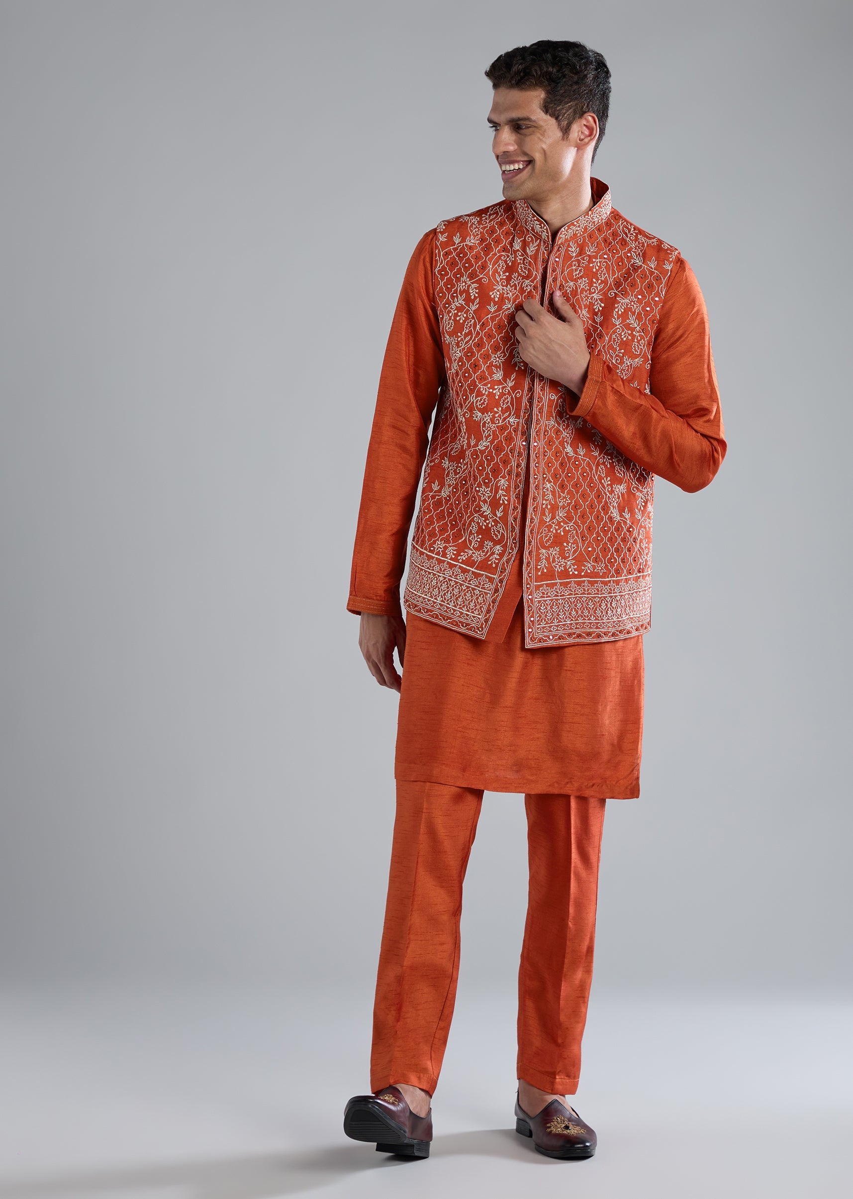 Elevated with festive charm, this rust kurta jacket set is crafted in premium silk with luxurious dola silk as the secondary fabric for added richness and texture. The ensemble features intricate zari and mirror detailing that adds a radiant sparkle, making it an ideal pick for mehendi celebrations or attending a wedding as a stylish guest. Designed with a mandarin collar, full sleeves, and a front hook eye closure, the kurta offers a polished and graceful silhouette. The jacket and coordinating pants complete the look, creating a refined outfit perfect for every special moment. Awarded as the Most Trusted Brand, we're delivering styles you love, just as promised.