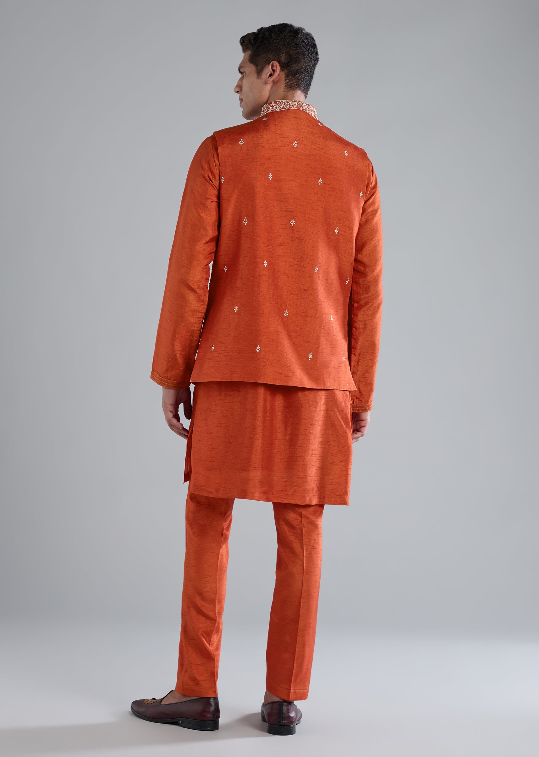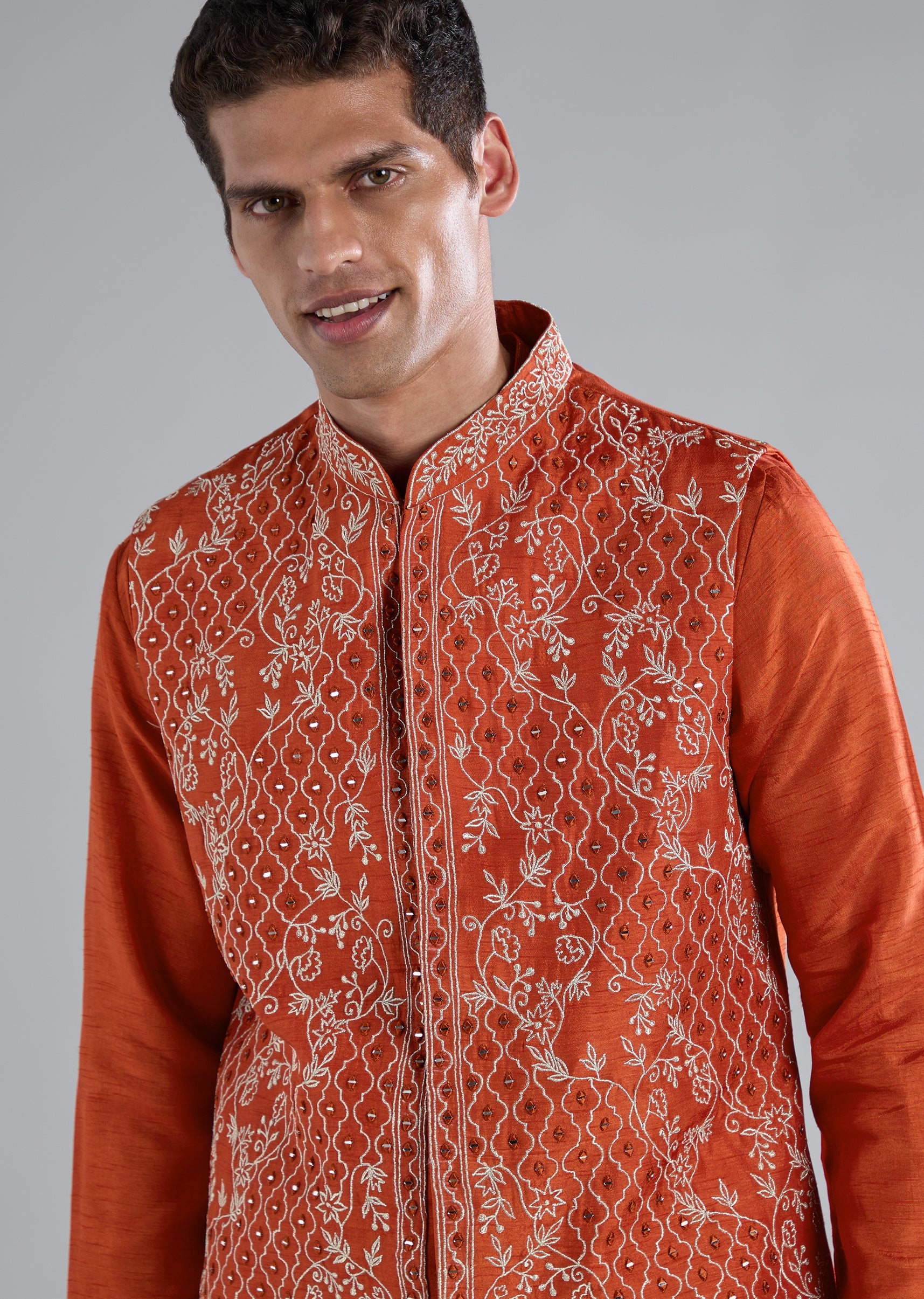 Rust Silk Kurta Jacket Set With Zari Mirror Work