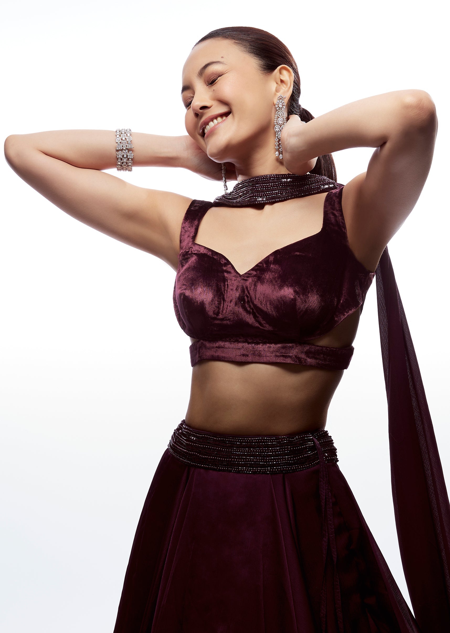 This velvet blouse features a sweetheart neckline with shoulder patti detailing and a back tassel accent. Rich in tone and texture, it’s ideal for wedding evenings and festive events. Awarded... More Product Details