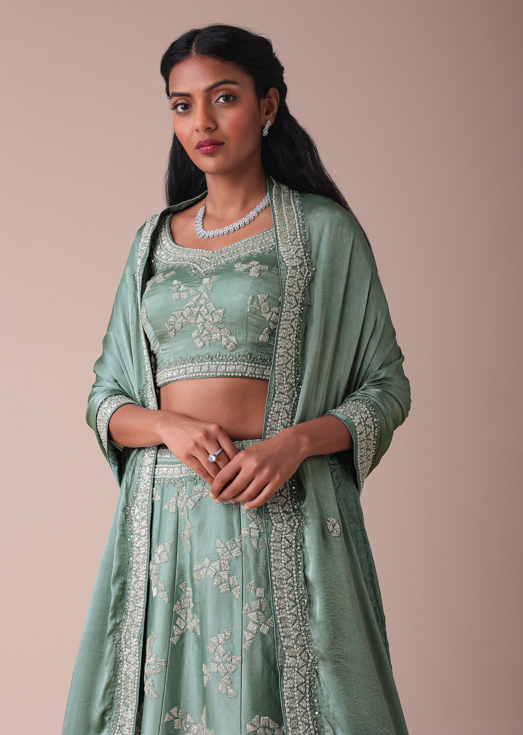 - A gorgeous sage green lehenga set fabricated in cotton silk with cut dana and moti embroidery.