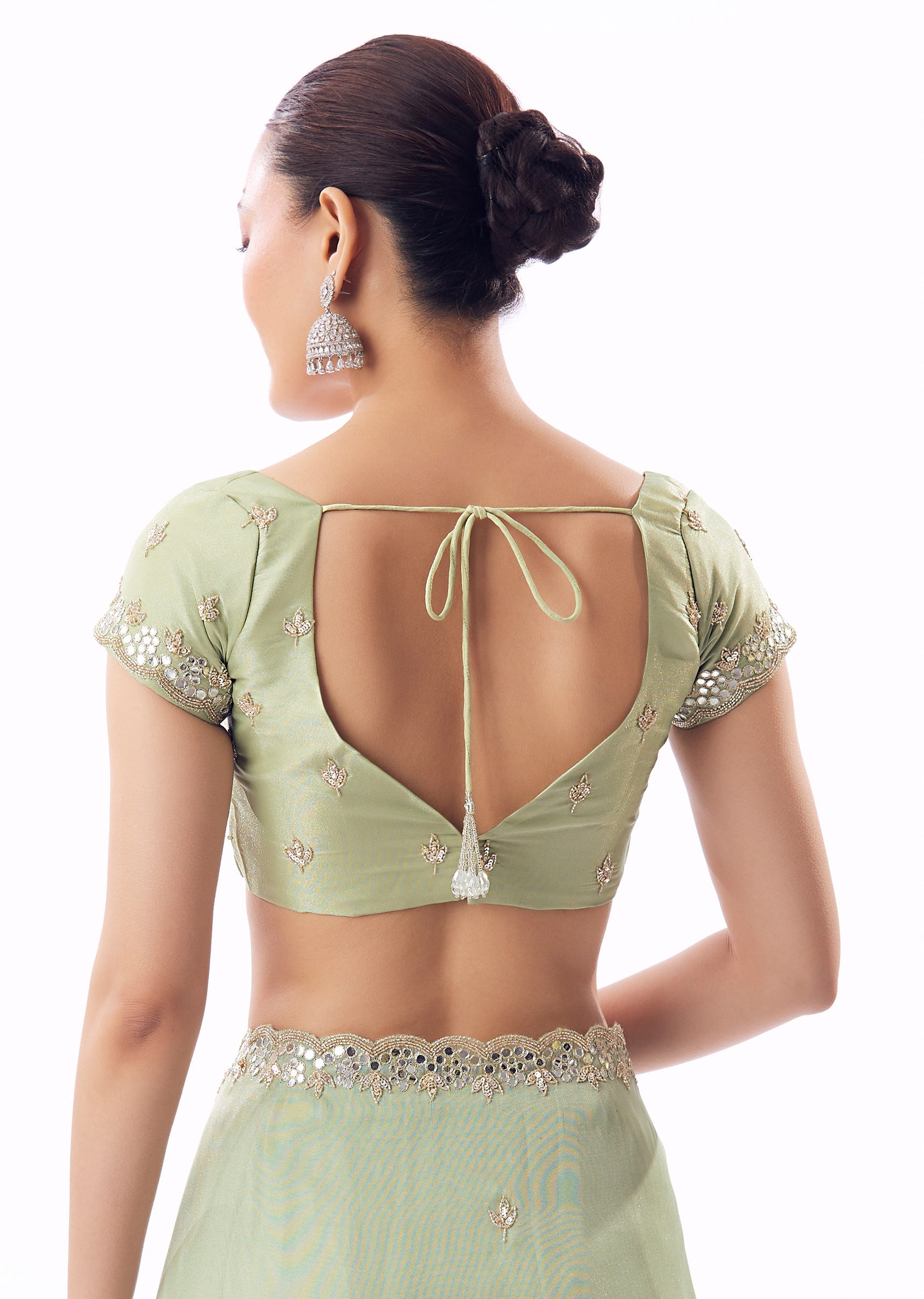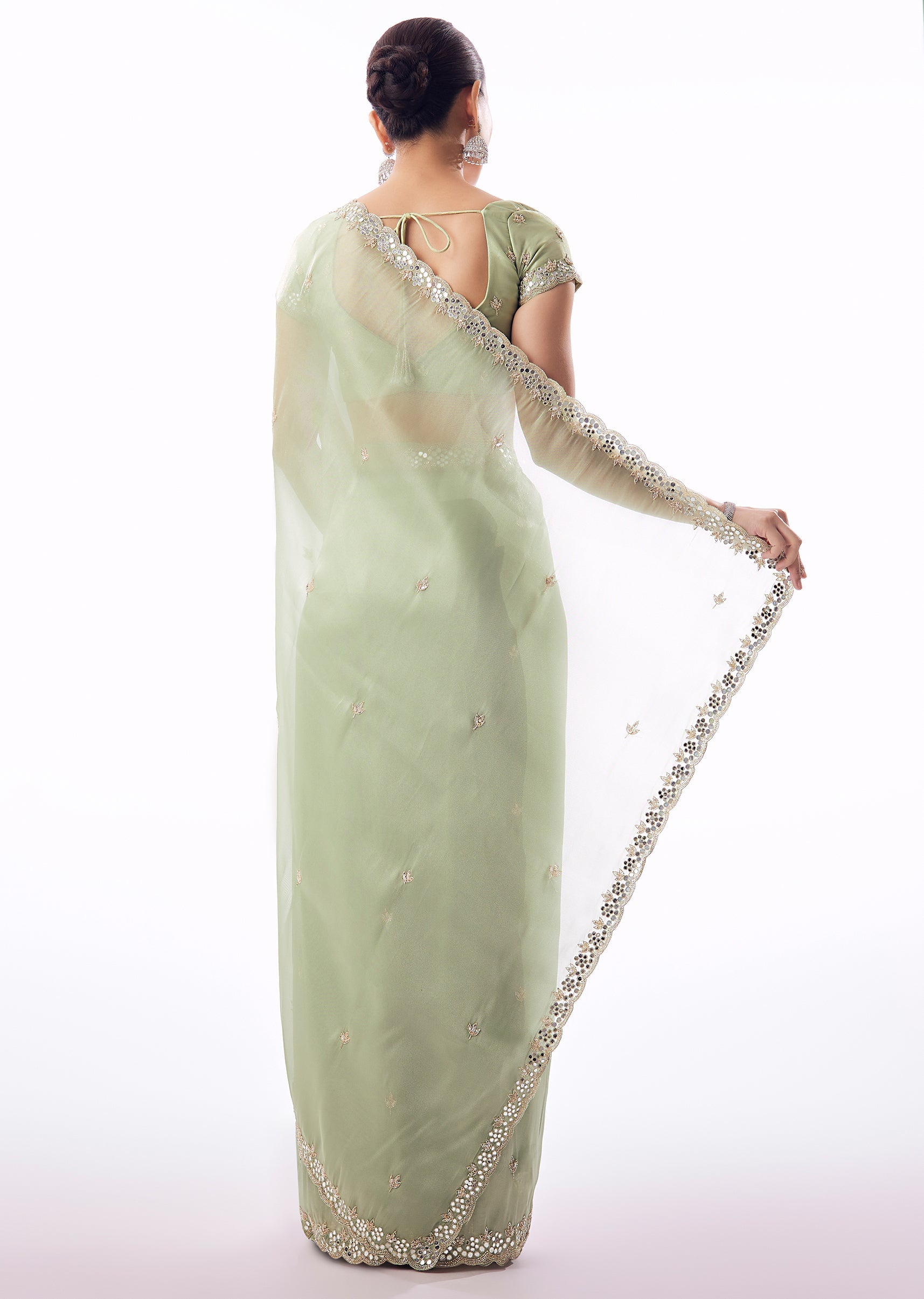 Sage Green Tissue Saree With Scallop Border And Cutdana Sequin Mirror Embroidery