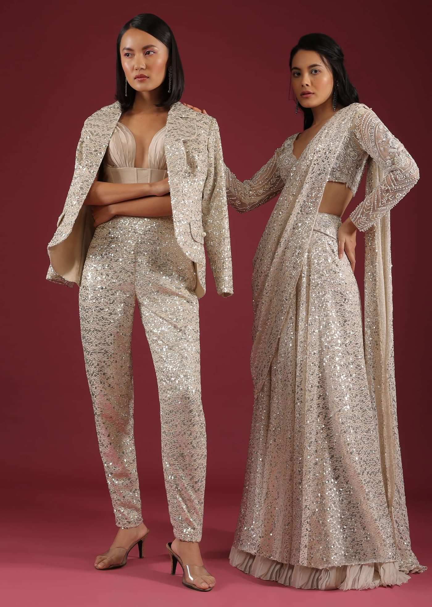 • Sandshell cream palazzo saree in sequins embroidery.