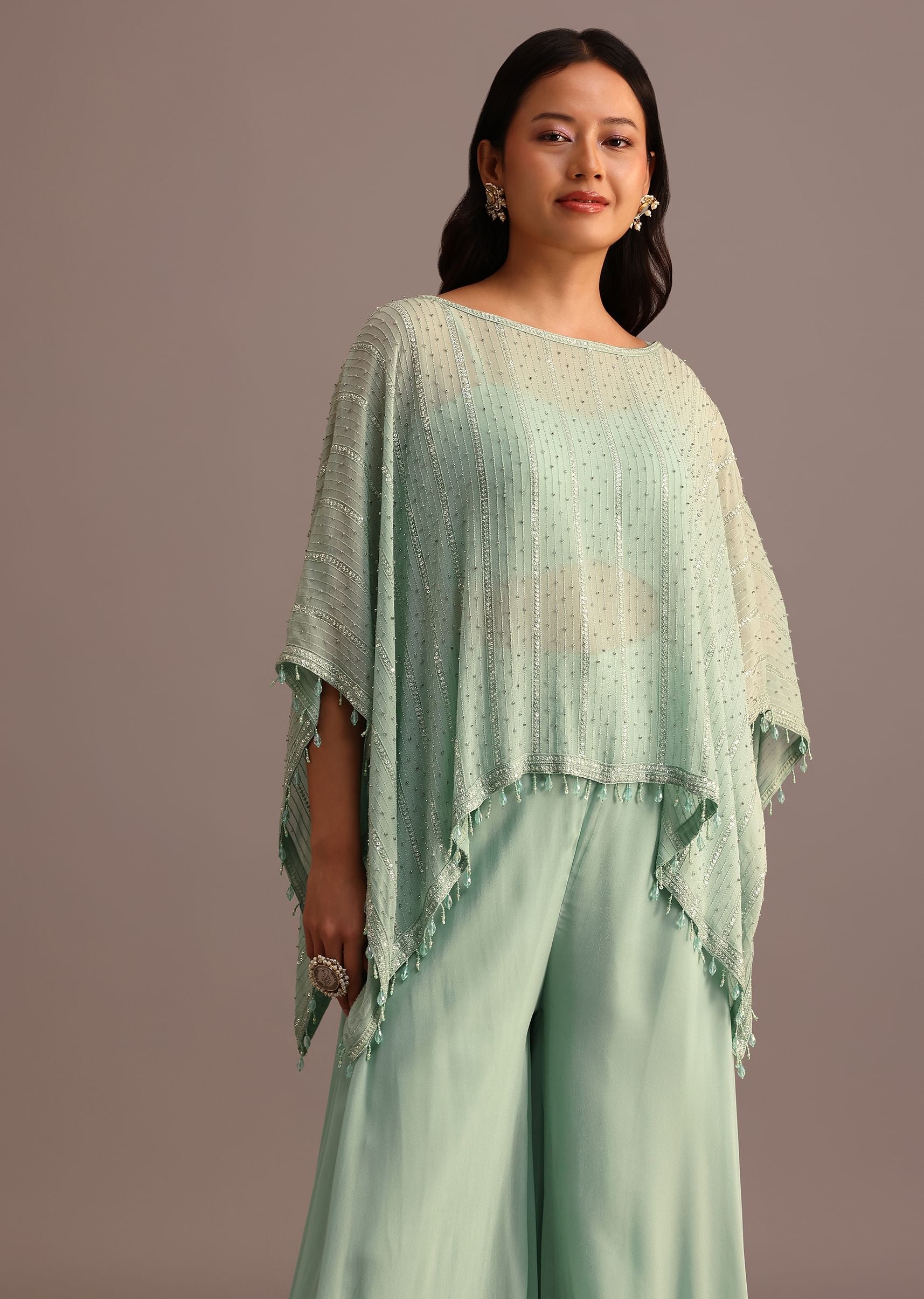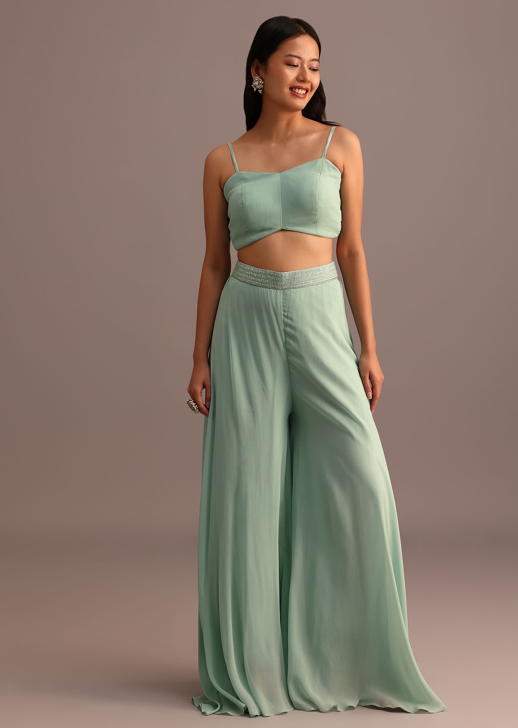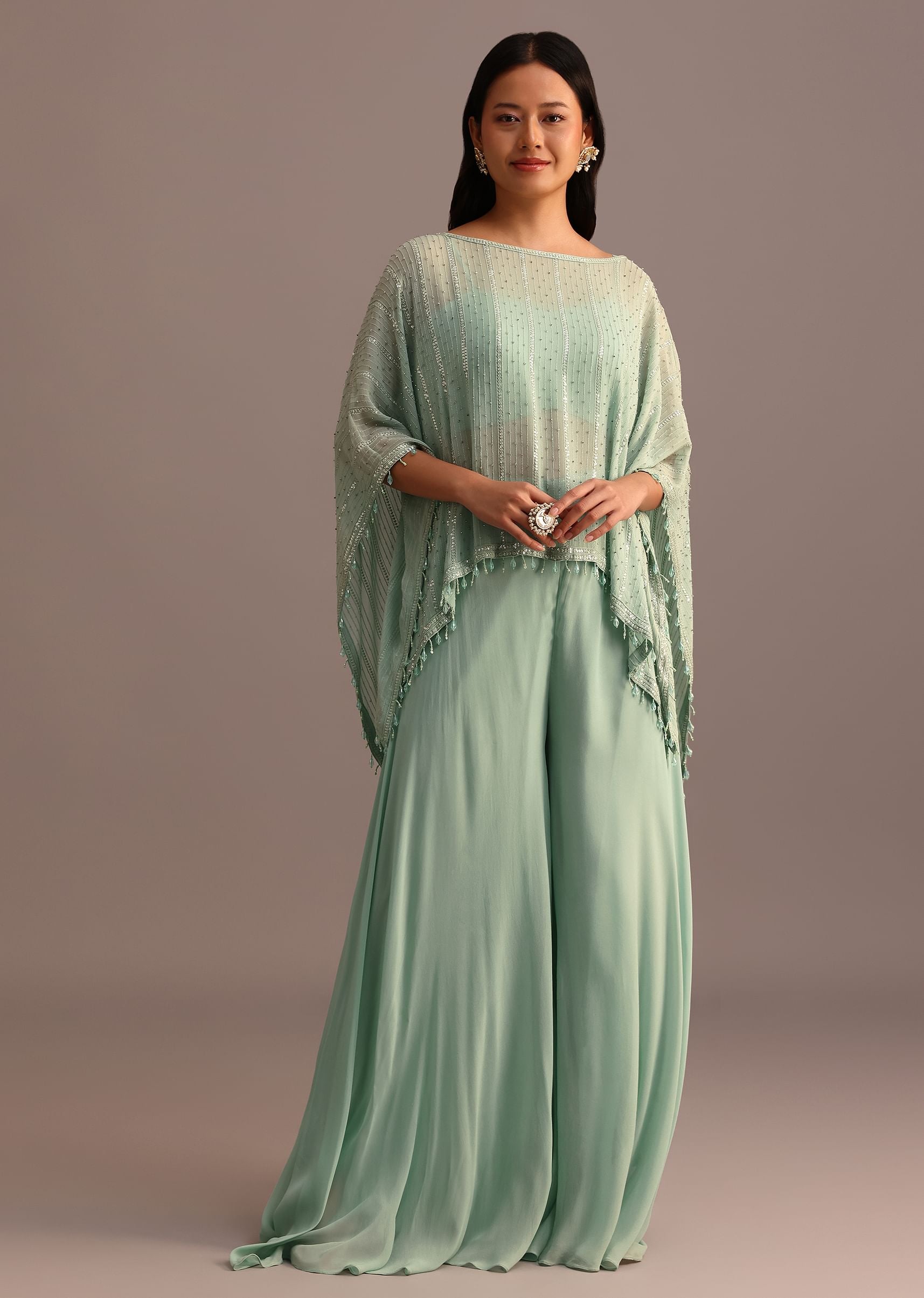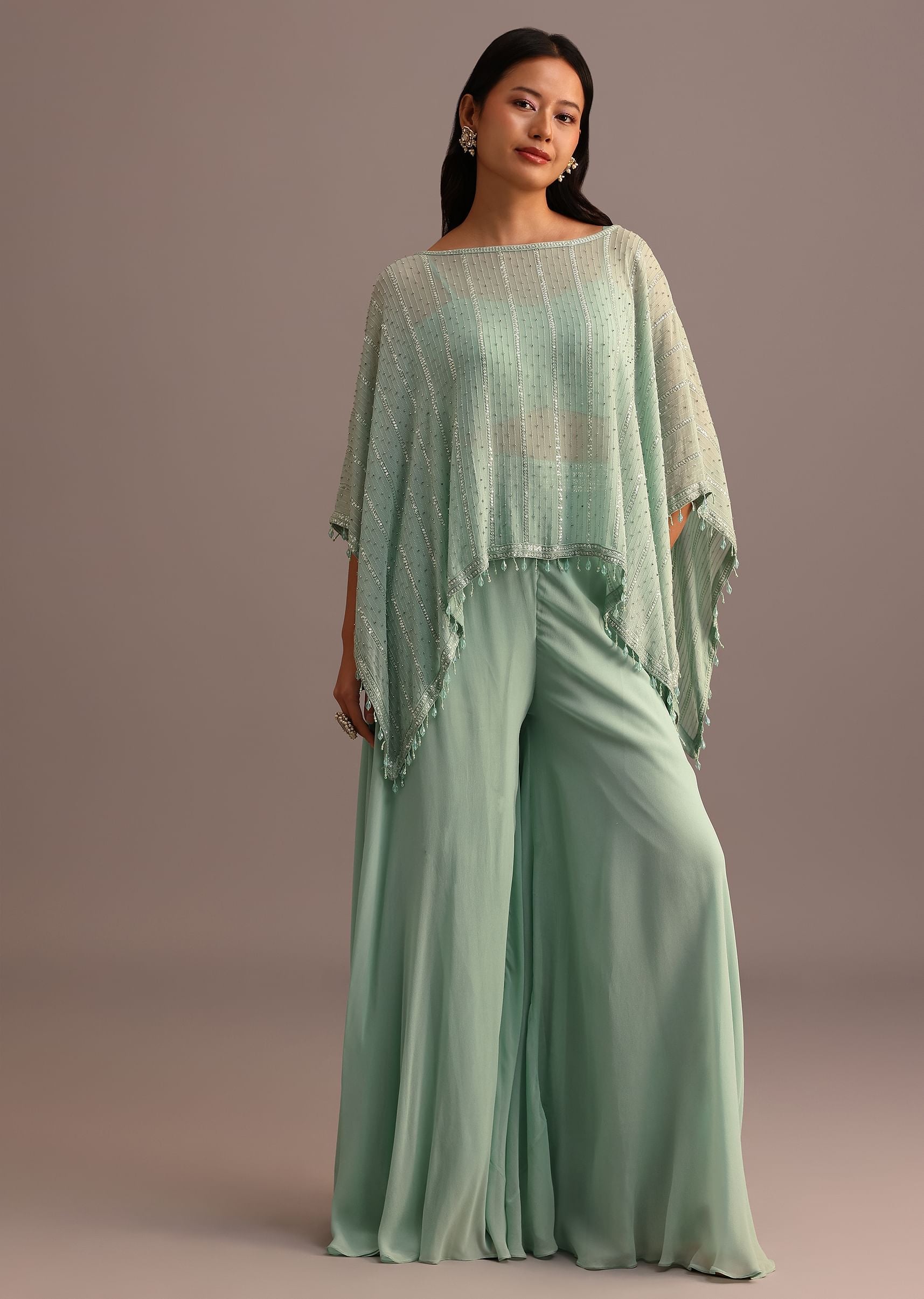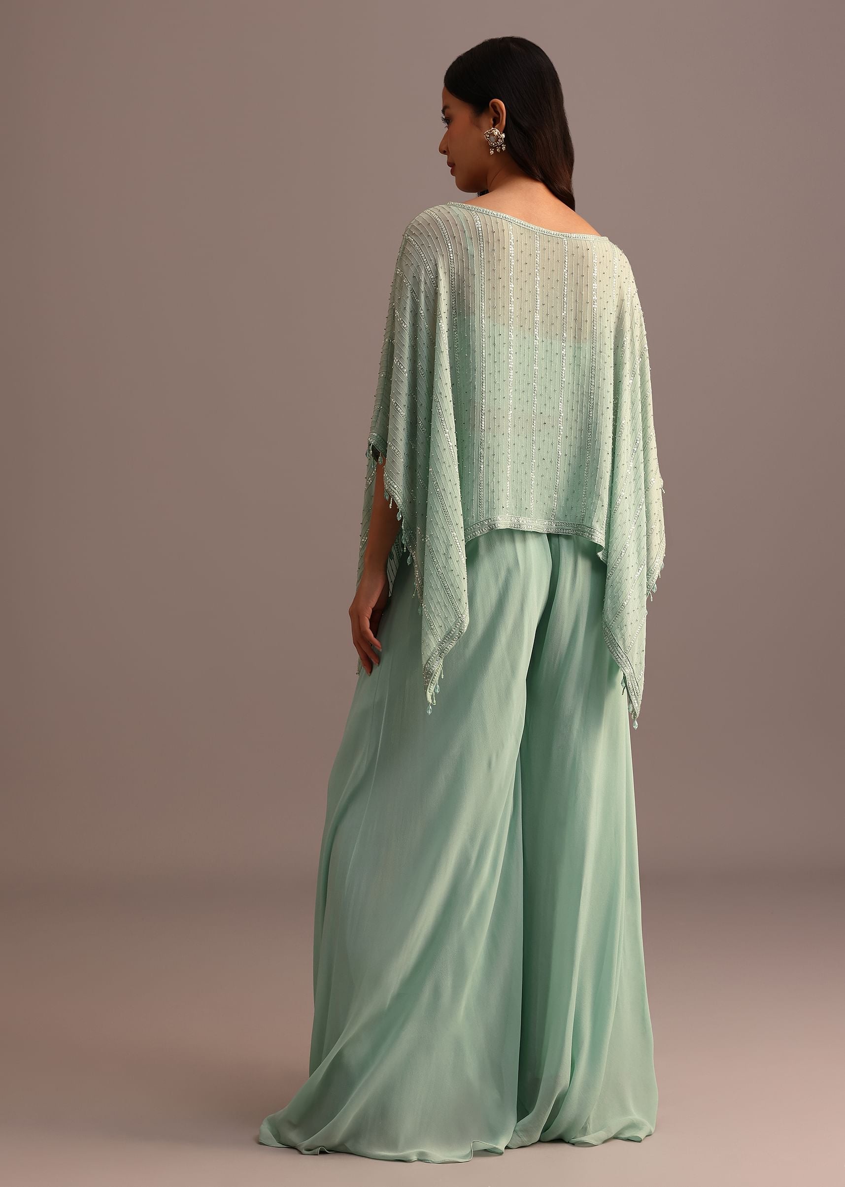 Sea Green Croptop Palazzo Set With Sequins Work Cape