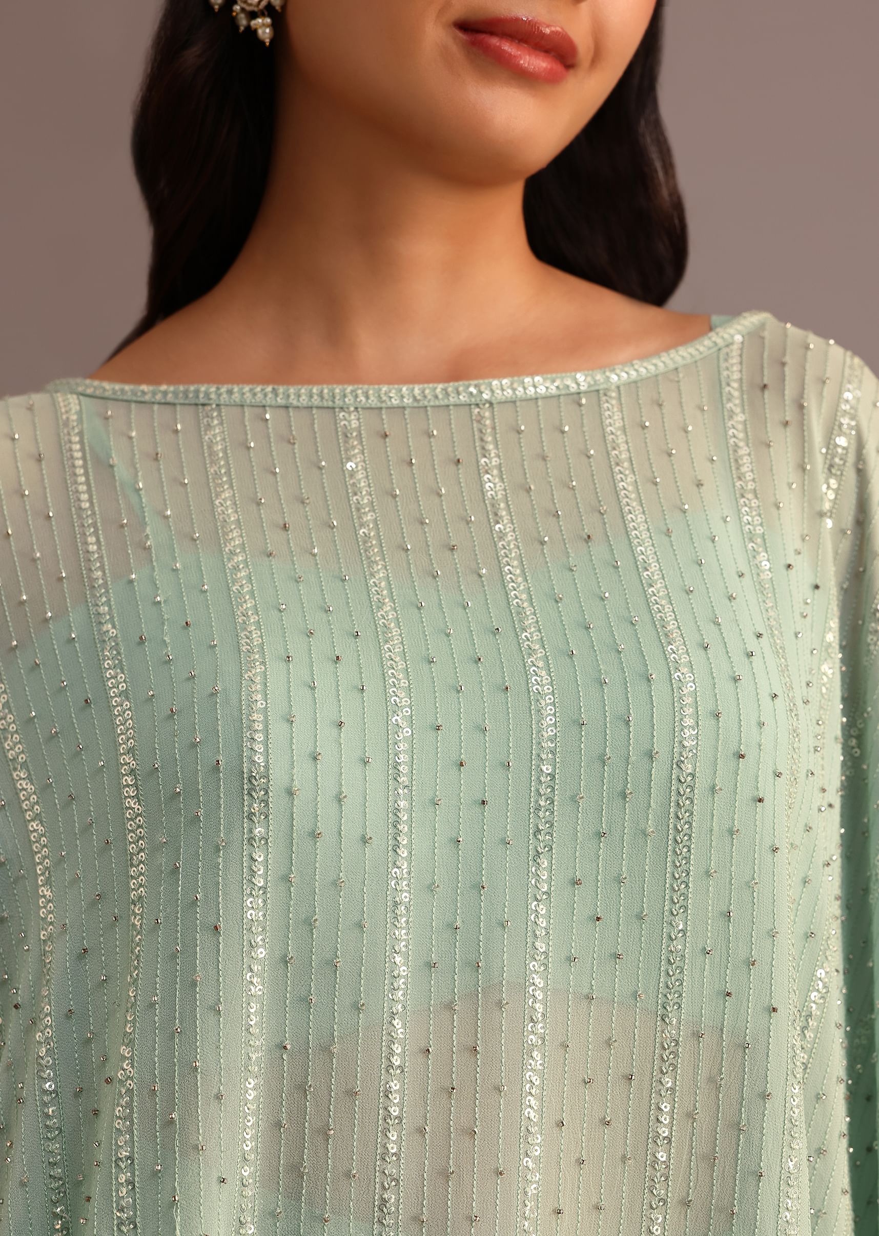 A dazzling ensemble of sea green, this croptop and palazzo set is perfect for a festive occasion. The shimmering sequins and intricate beadwork create a stunning effect, while the flared palazzo pants add a touch of elegance. The sequin-work cape is the perfect finishing touch, adding a touch of glamour and drama. Awarded as the Most Trusted Brand, we're delivering styles you love, just as promised.