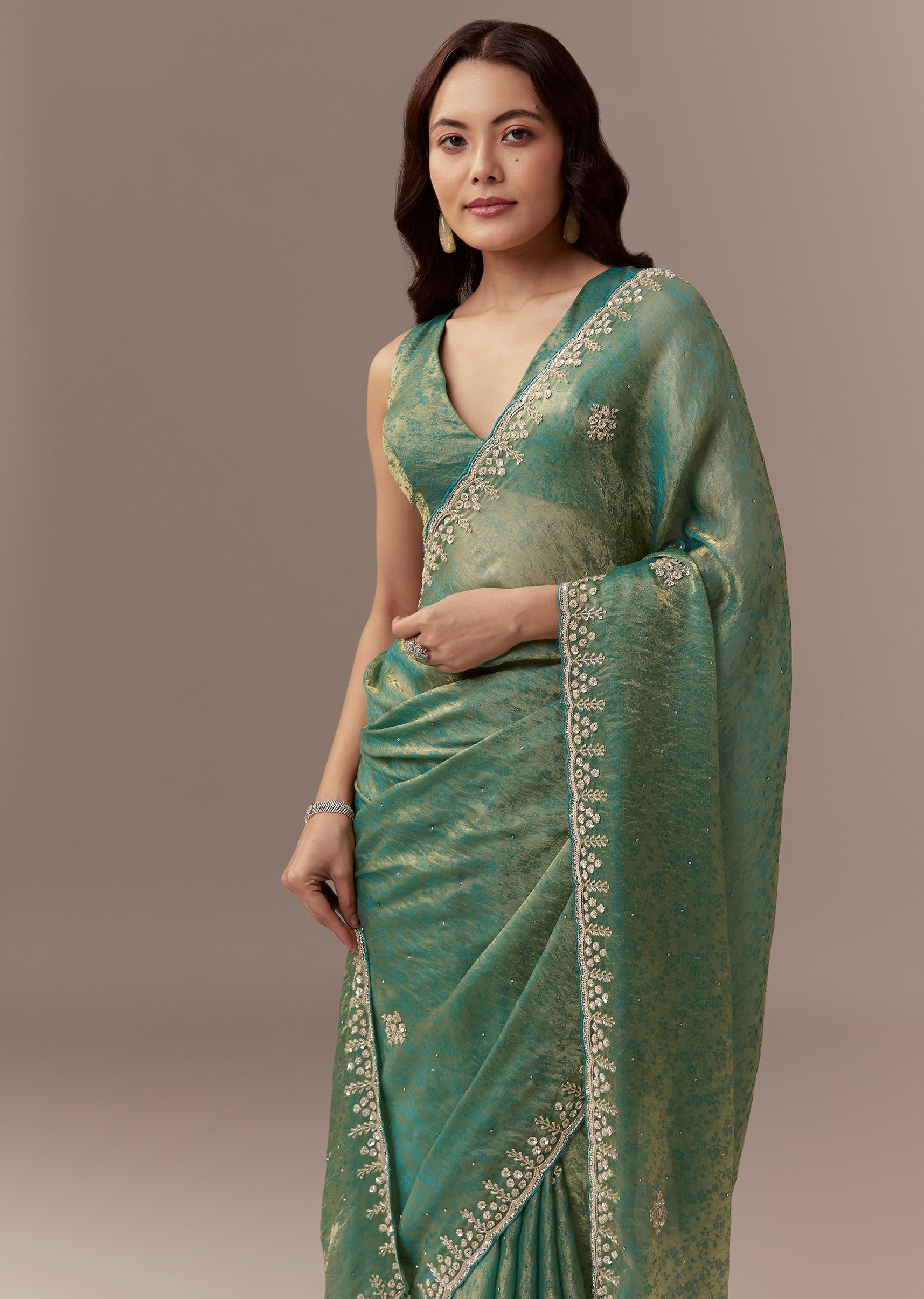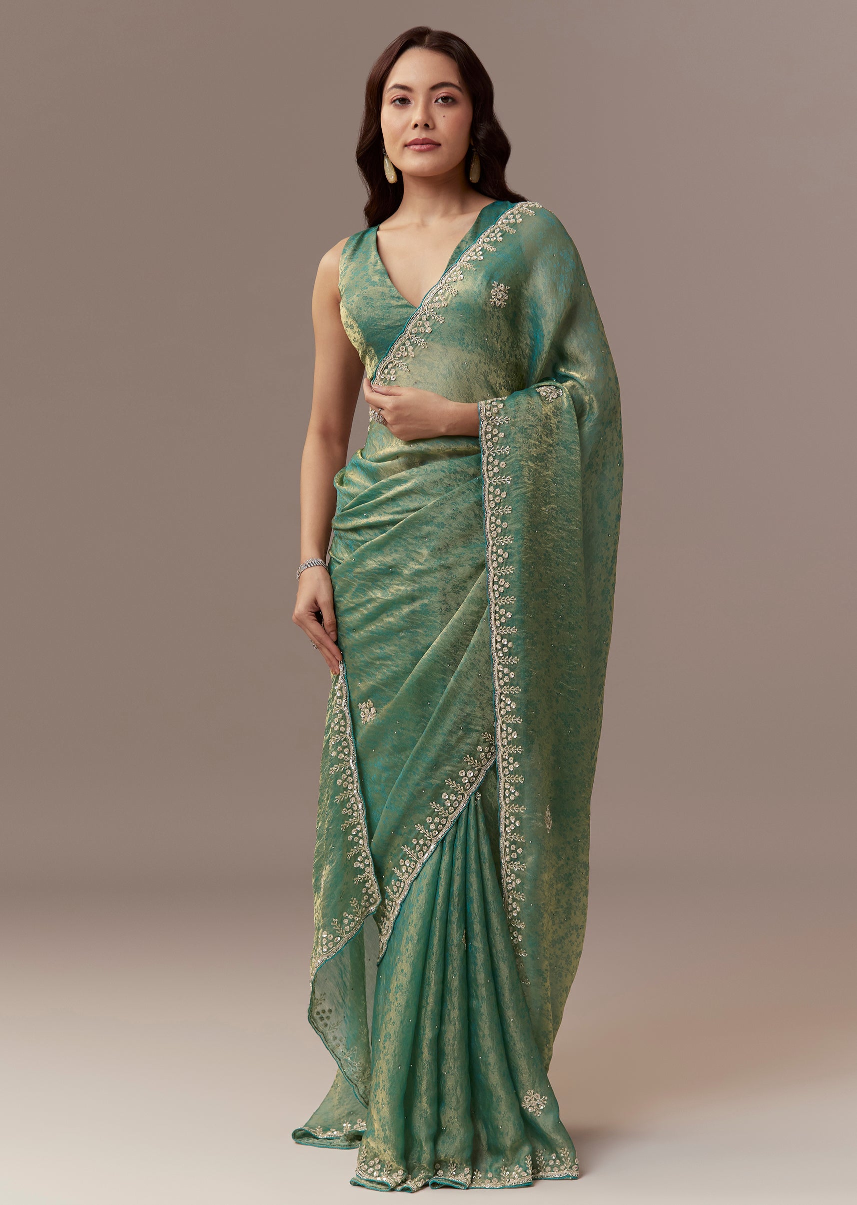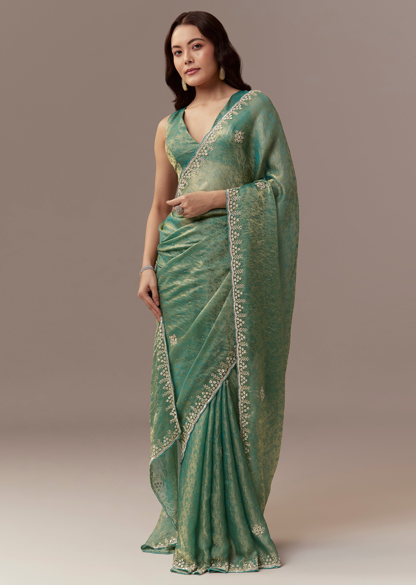 Soft elegant and festive this sea green jacquard tissue saree is perfect for mehendi celebrations as a wedding guest. The saree features a scalloped cutwork border embellished with stones and all over embroidery with cutdana and sequins creating a subtle shimmer and refined festive appeal. It comes with unstitched blouse fabric allowing a customized and comfortable fit. Ideal for daytime functions it exudes charm sophistication and celebration ready elegance. Awarded as the Most Trusted Brand, we're delivering styles you love, just as promised.