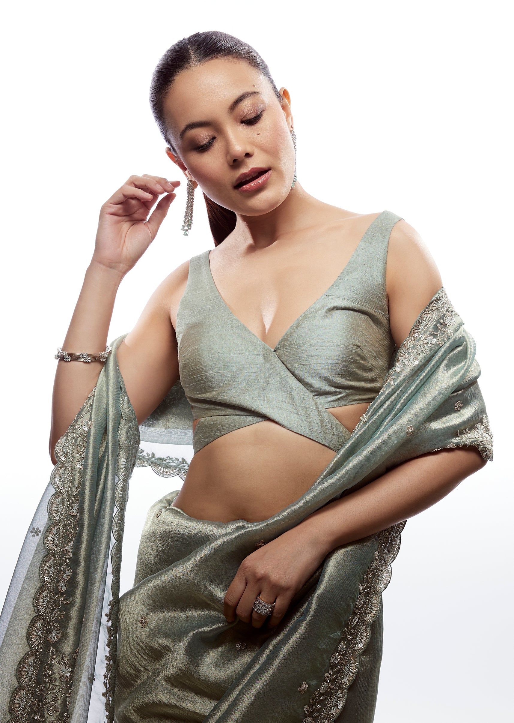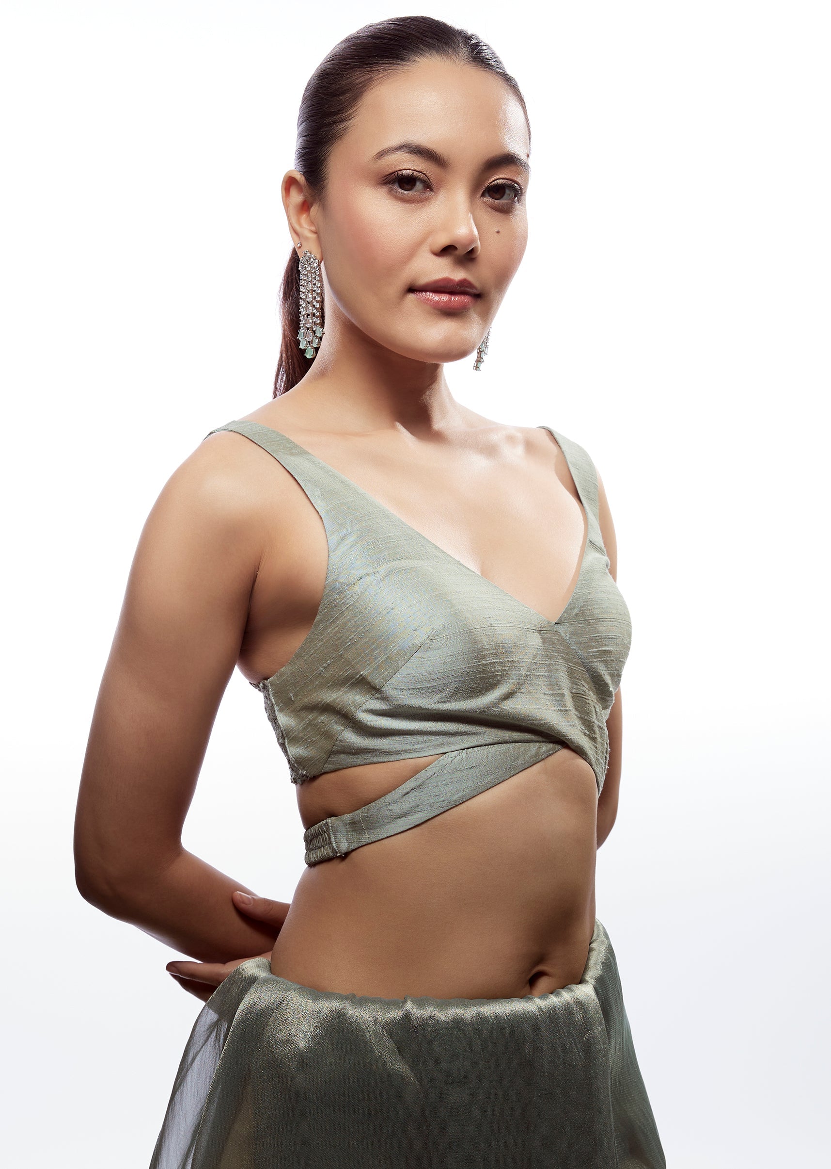 Sea Green Raw Silk V Neck Blouse
