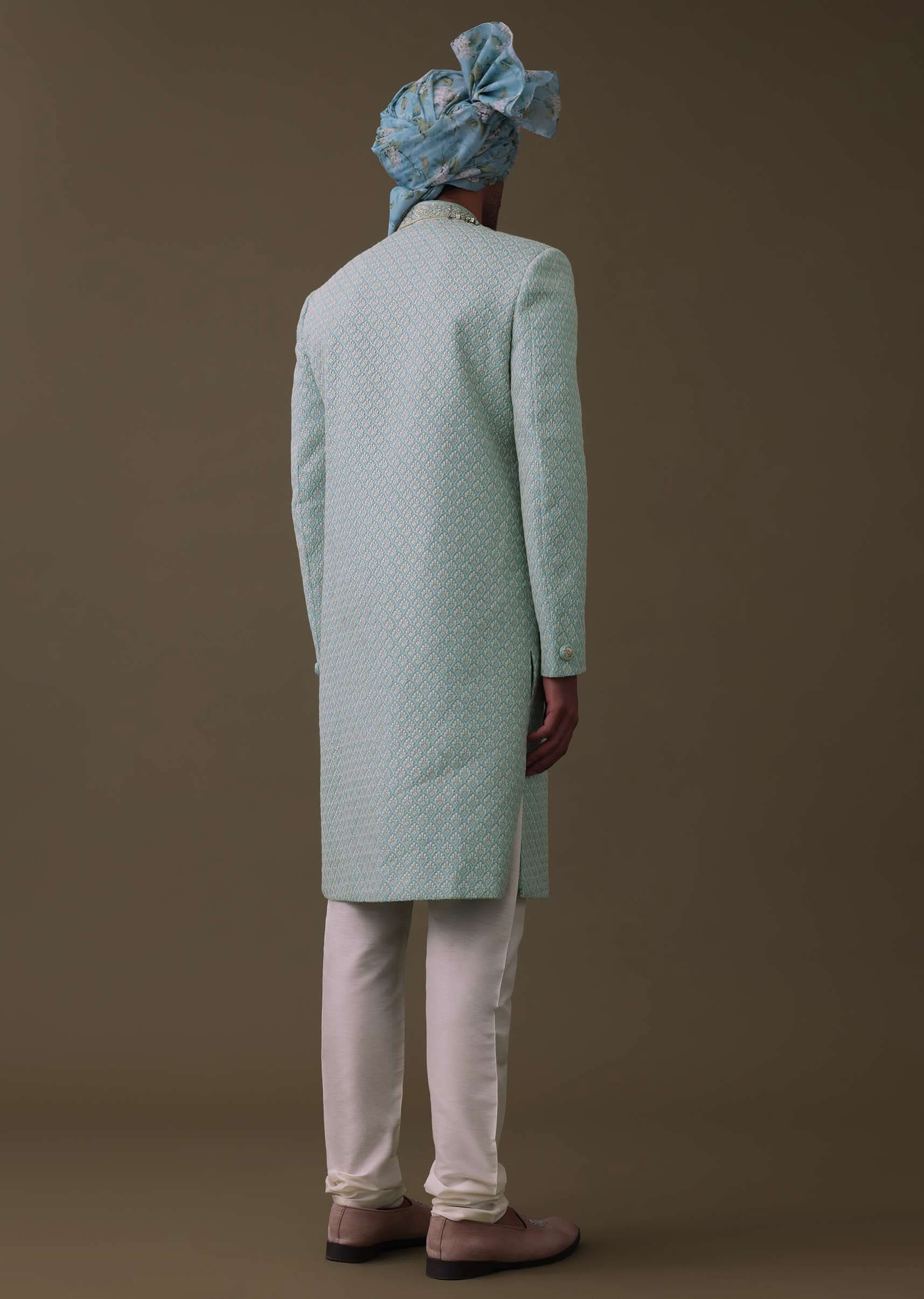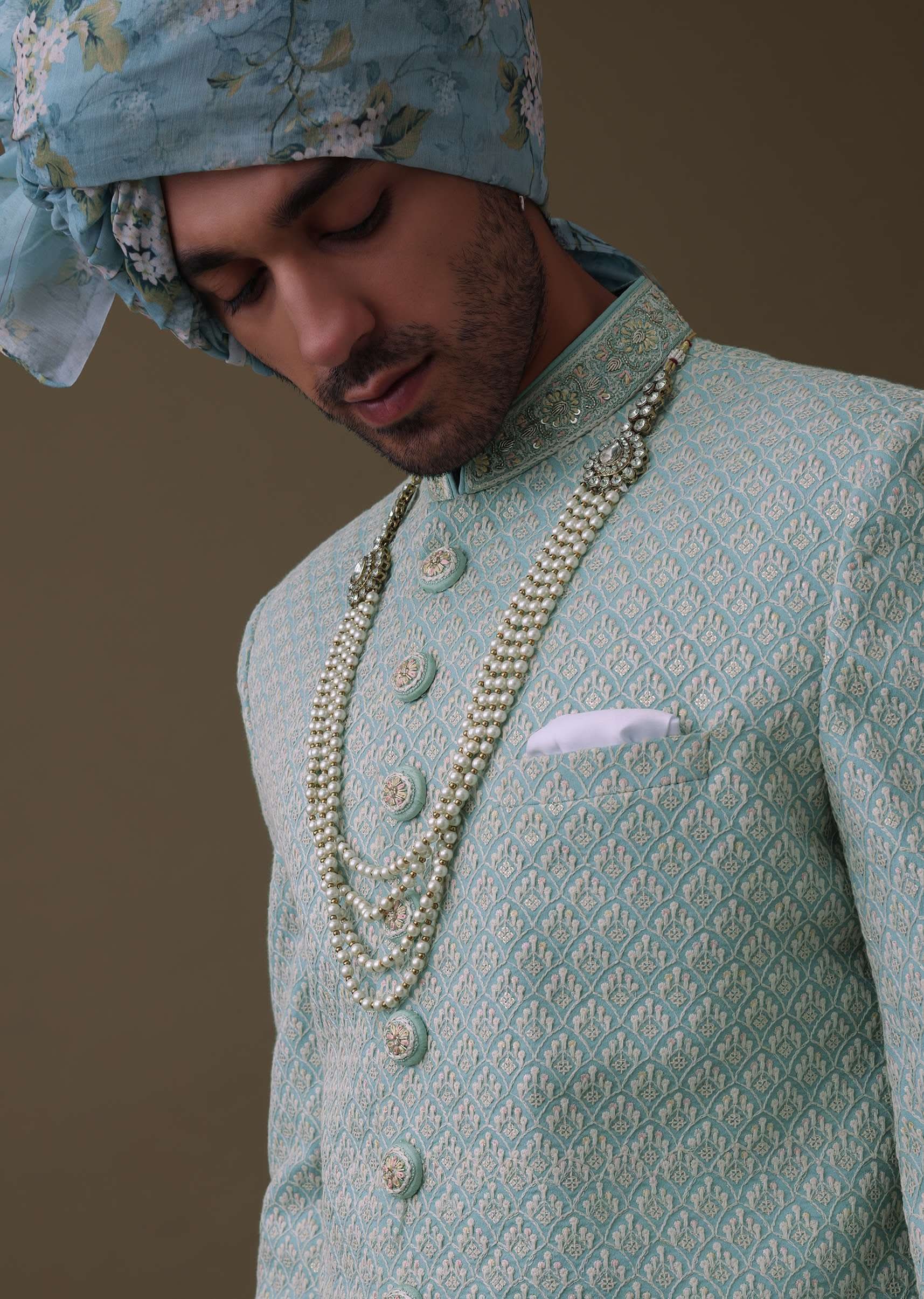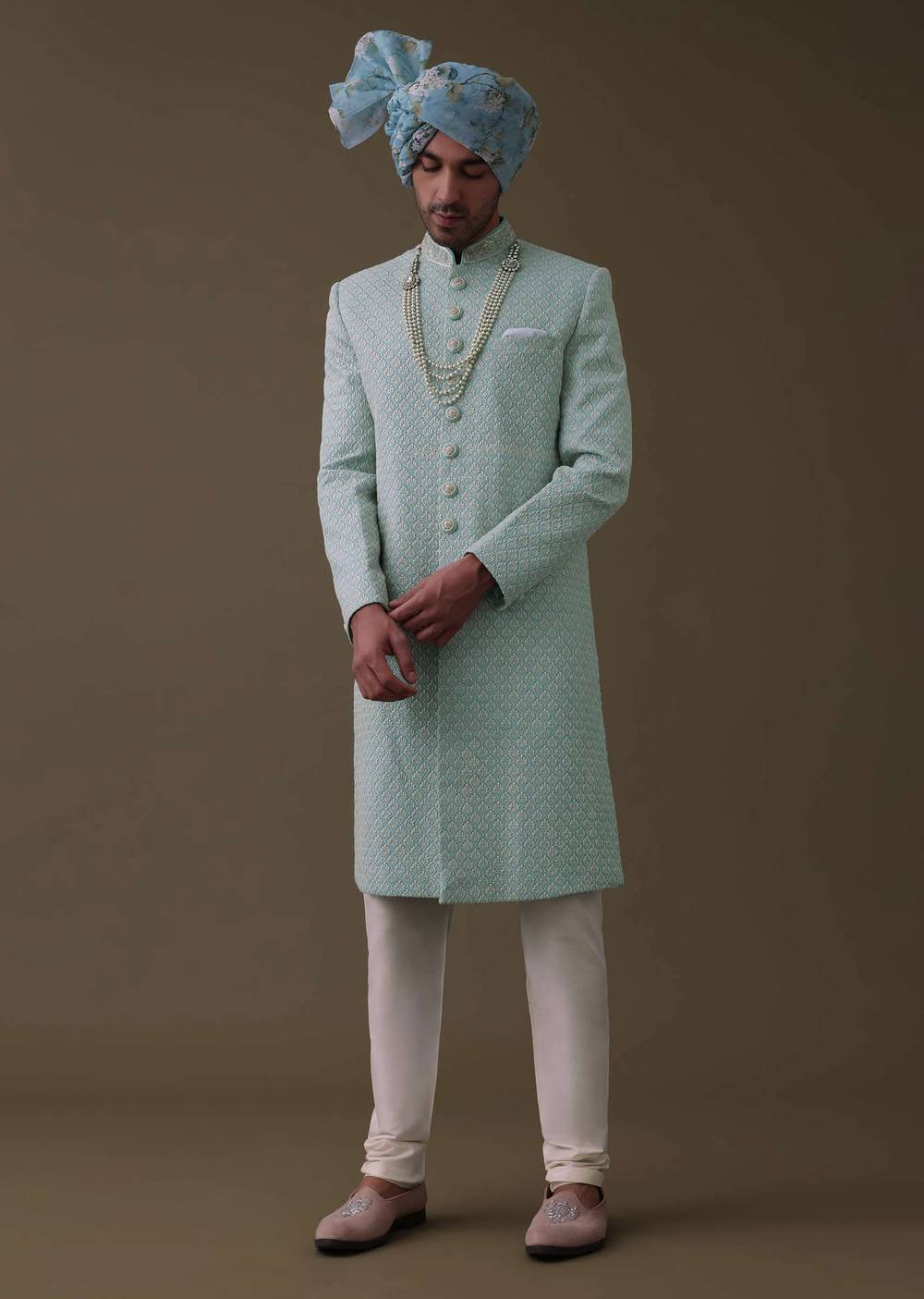 Sea Green Sherwani Set In Silk With Lucknowi Embroidery