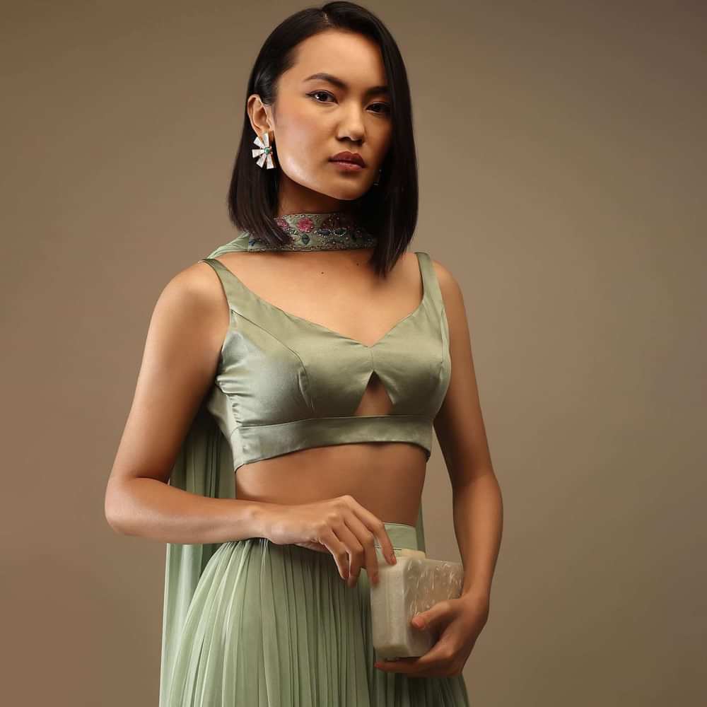 - Pair it up with a lehenga, chandelier earrings, and a box purse for an evening ball.