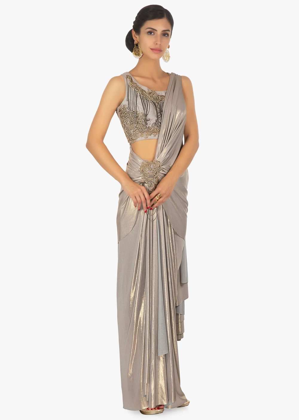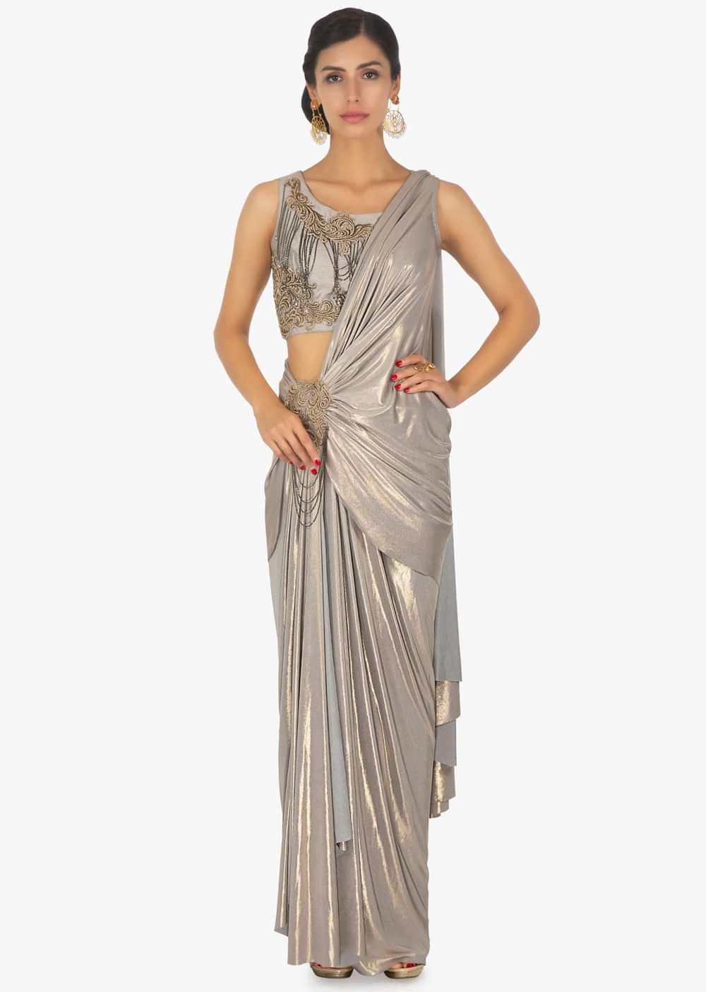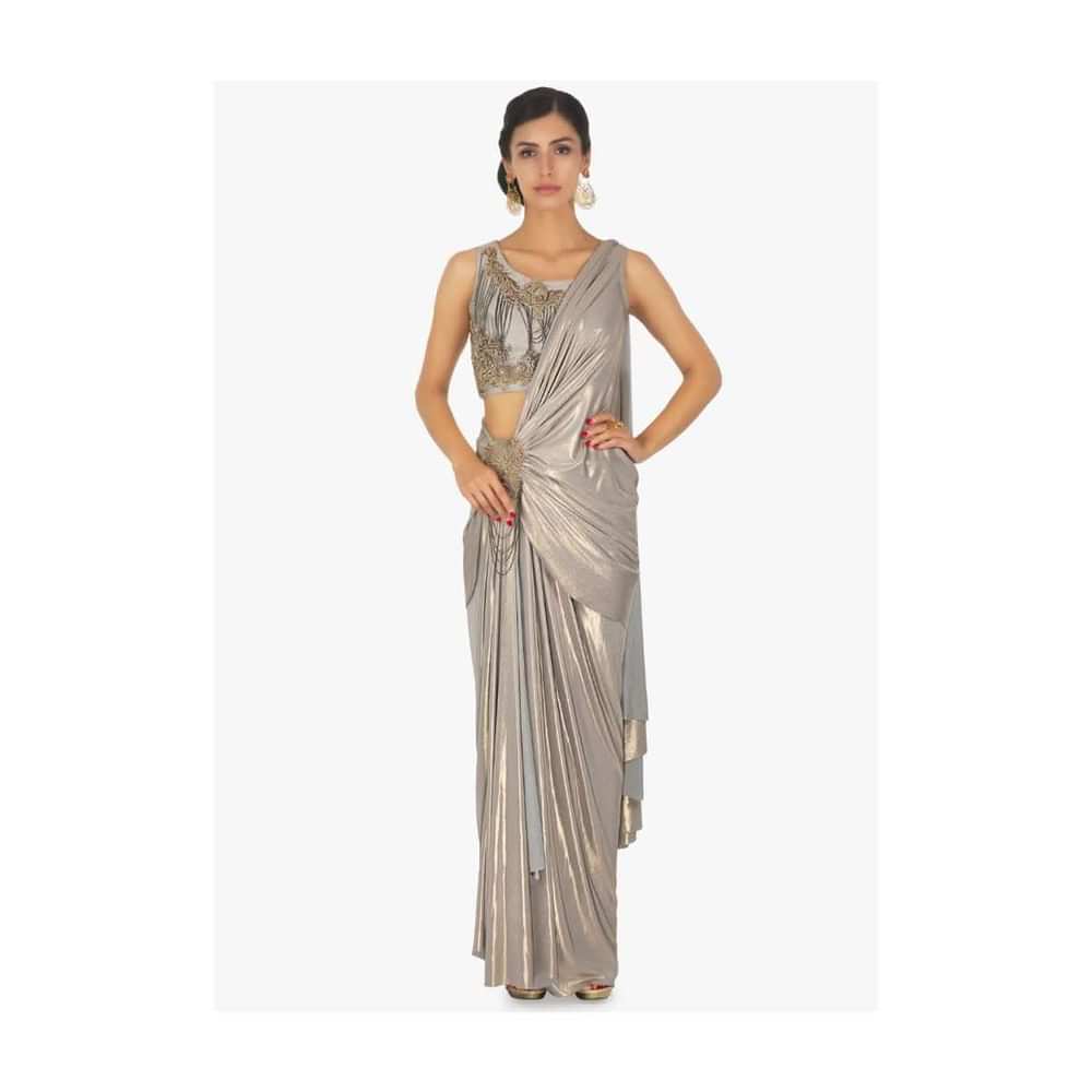 Shimmer Lycra saree skirt with pre stitched pallo in zari patch with chain dangler only on Kalki