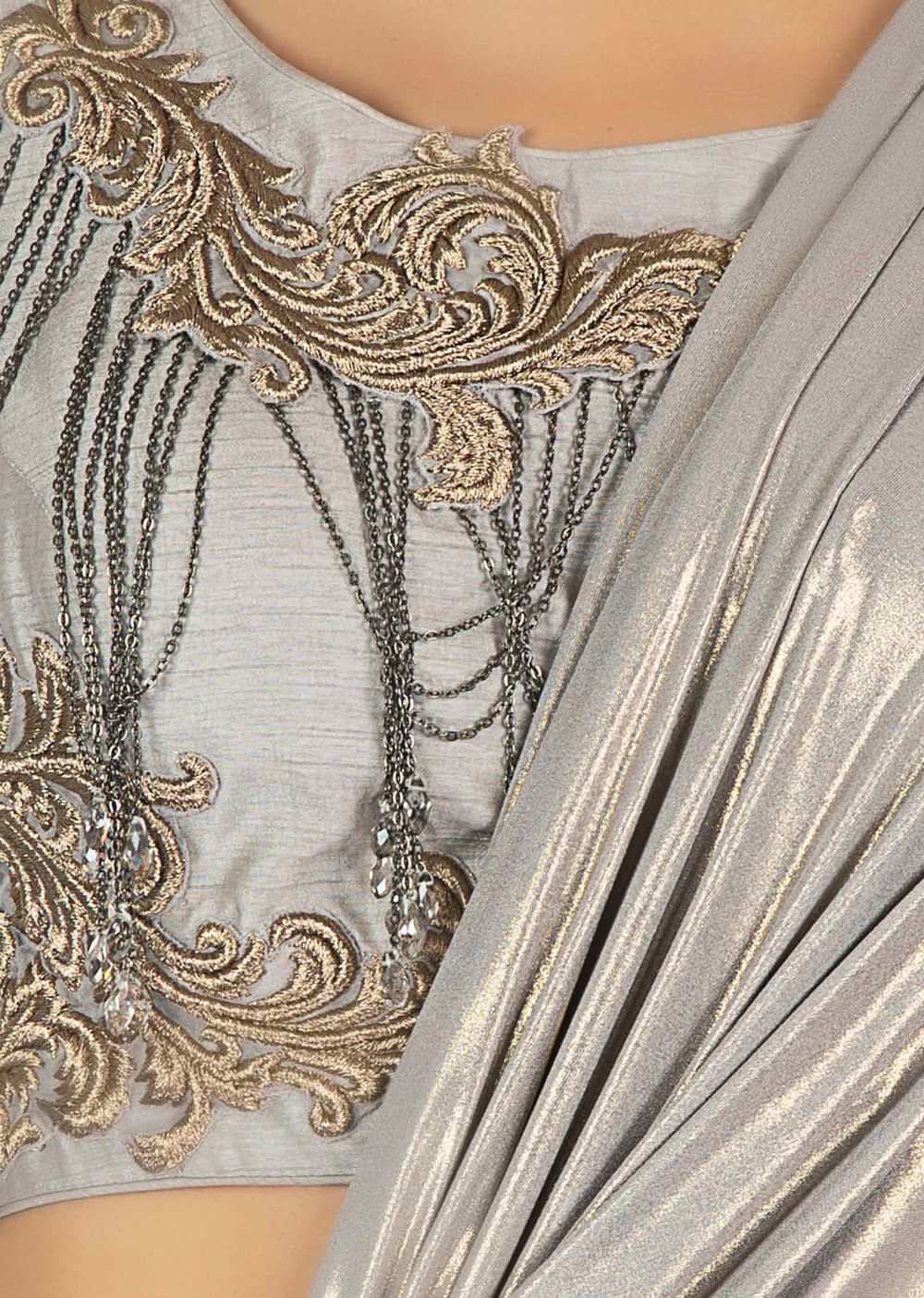 - Grey raw silk blouse in zari patch work all over along with chain tassel.