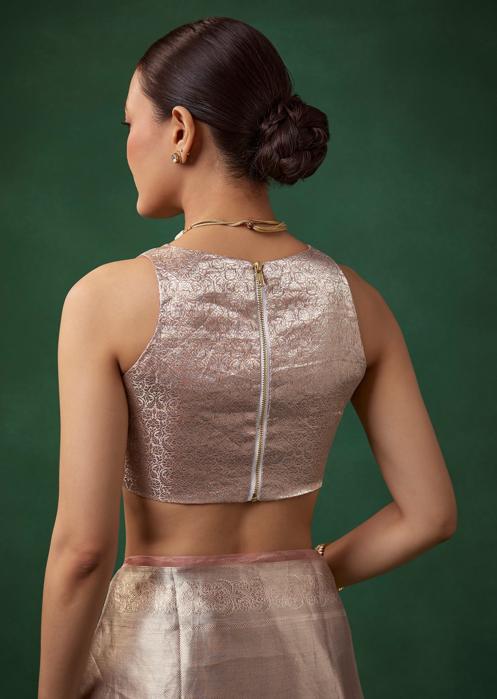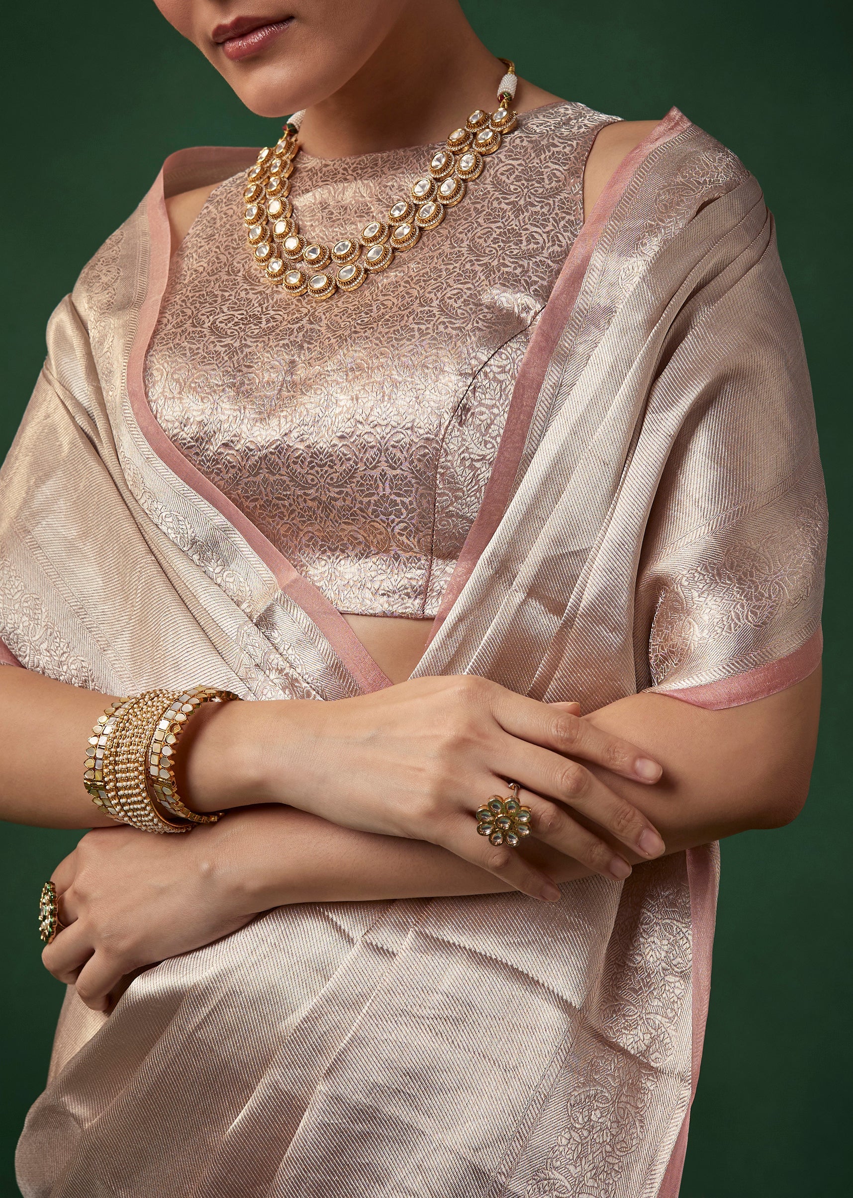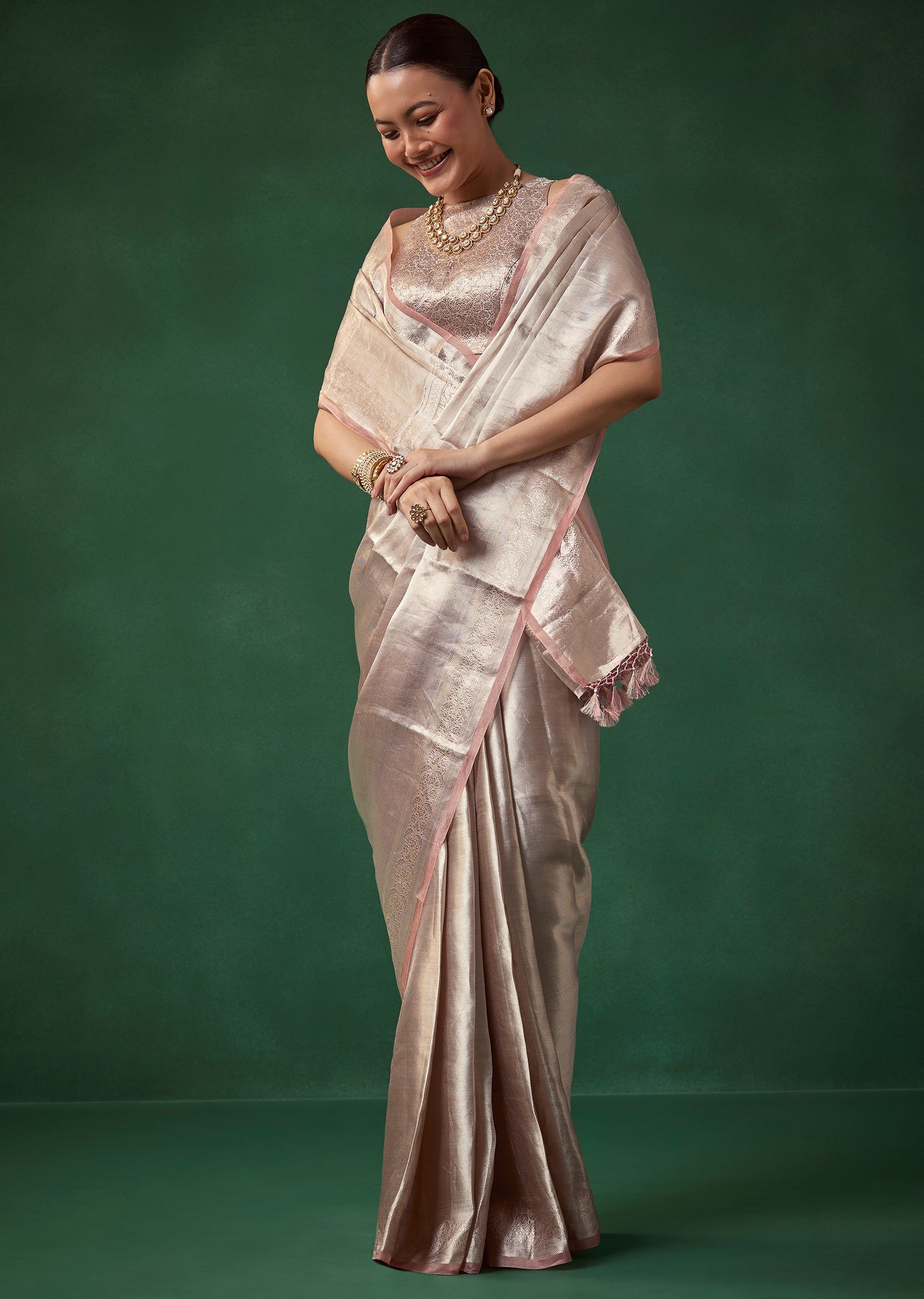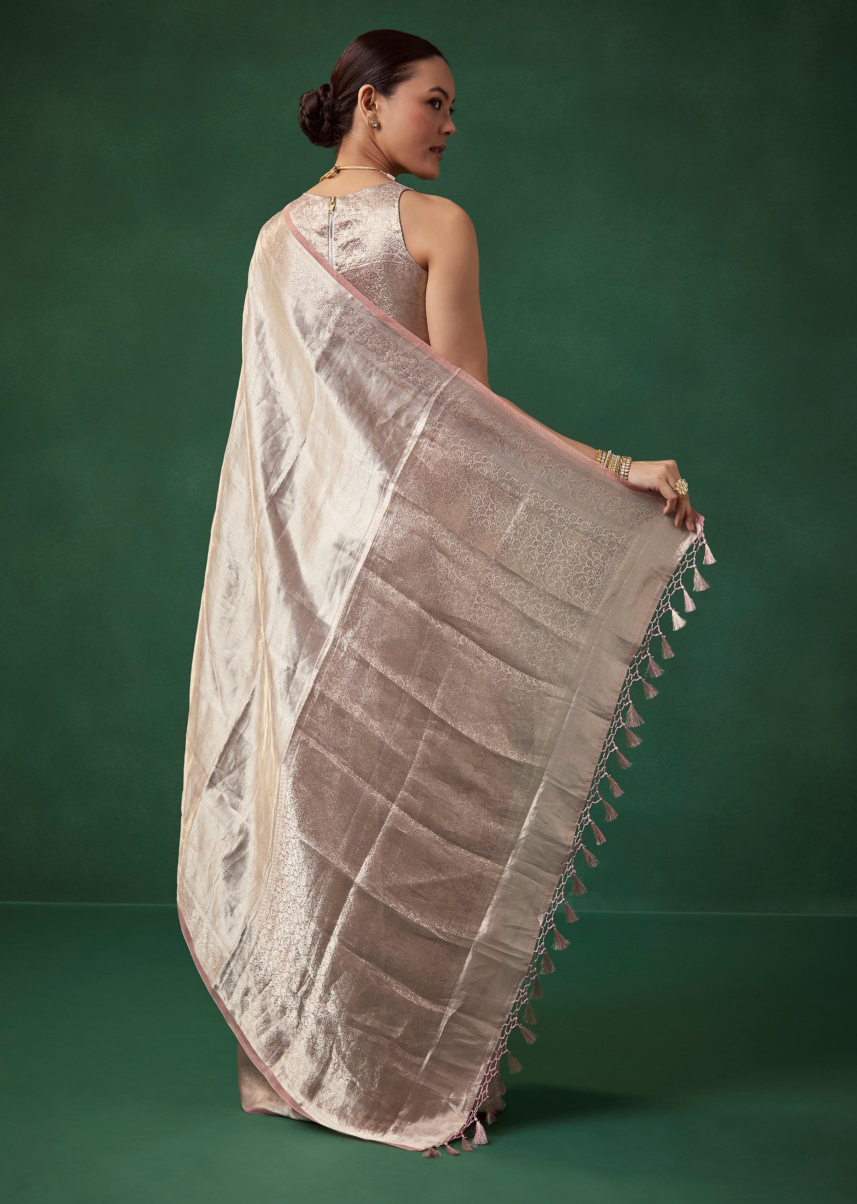 Fit Tips:Keep the pleats smooth for a refined drape and choose a structured blouse to balance the saree’s lightweight tissue texture.