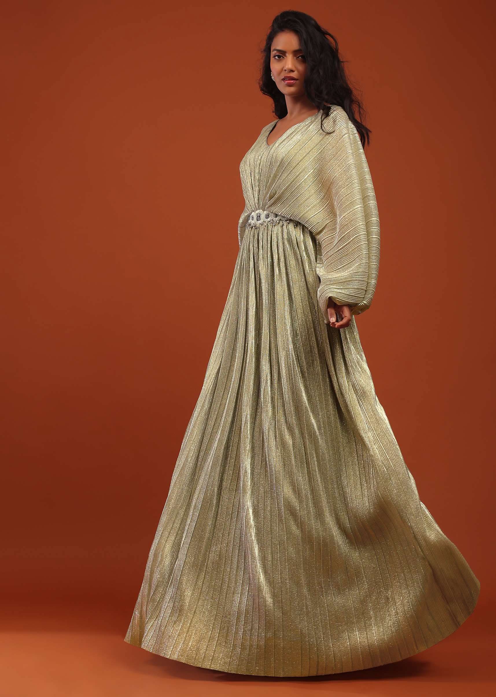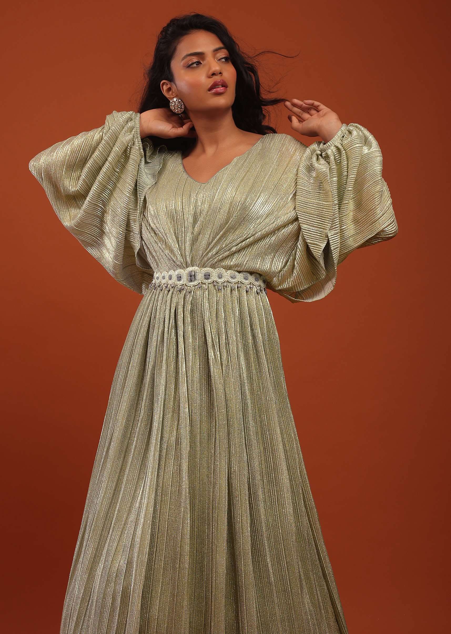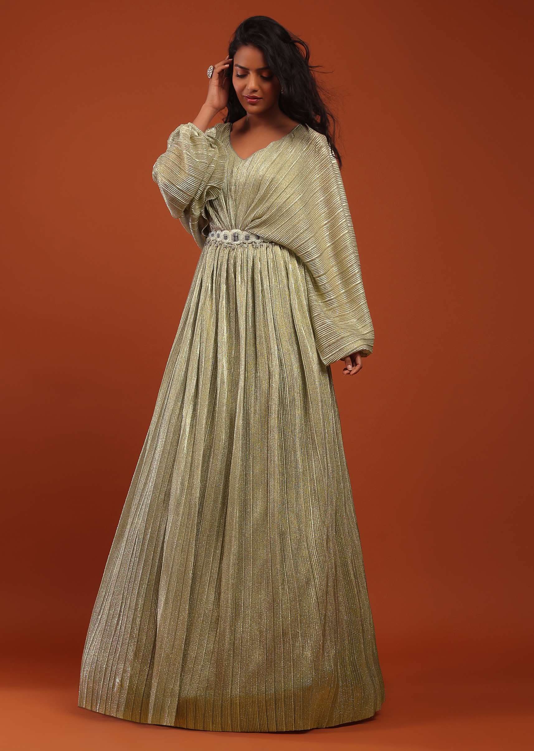 Silver Crushed Kaftan Gown With An Embellished Waistbelt