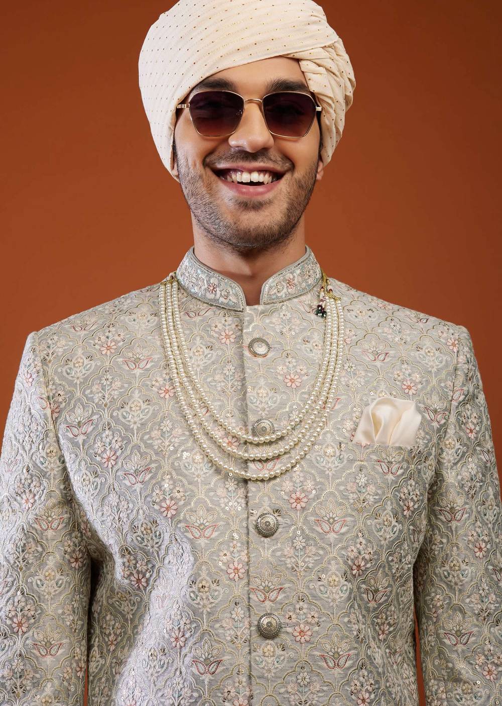 - Charming Silver Sherwani Set fabricated in tussar silk.