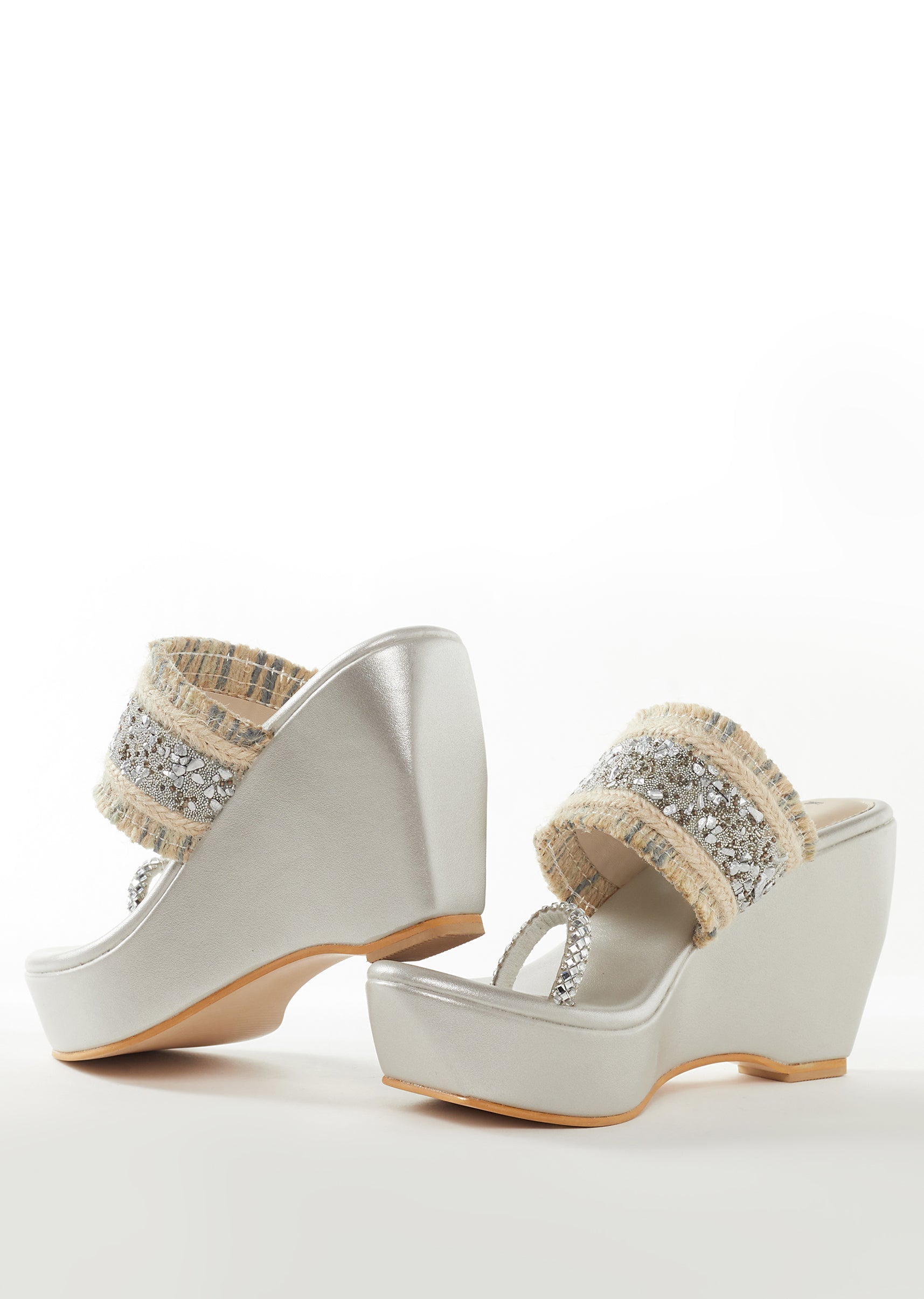 Designed for festive elegance, these silver footwear pieces bring a refined shimmer perfect for receptions and wedding celebrations. Crafted in smooth faux leather, the design features embellished detailing that adds... More Product Details