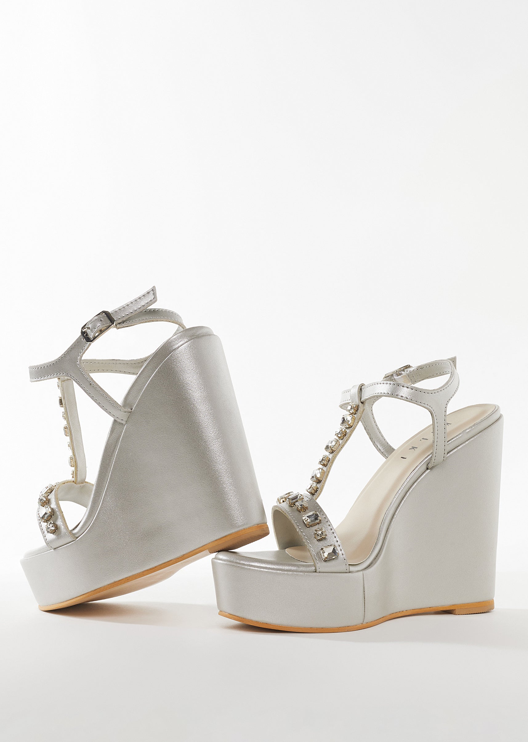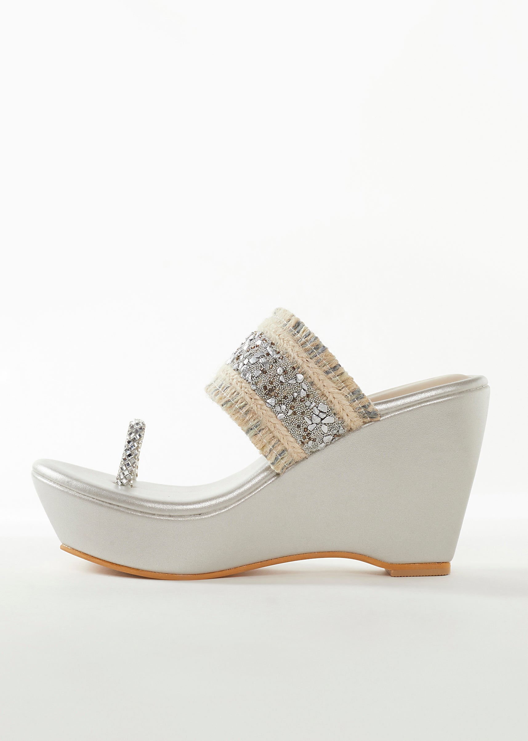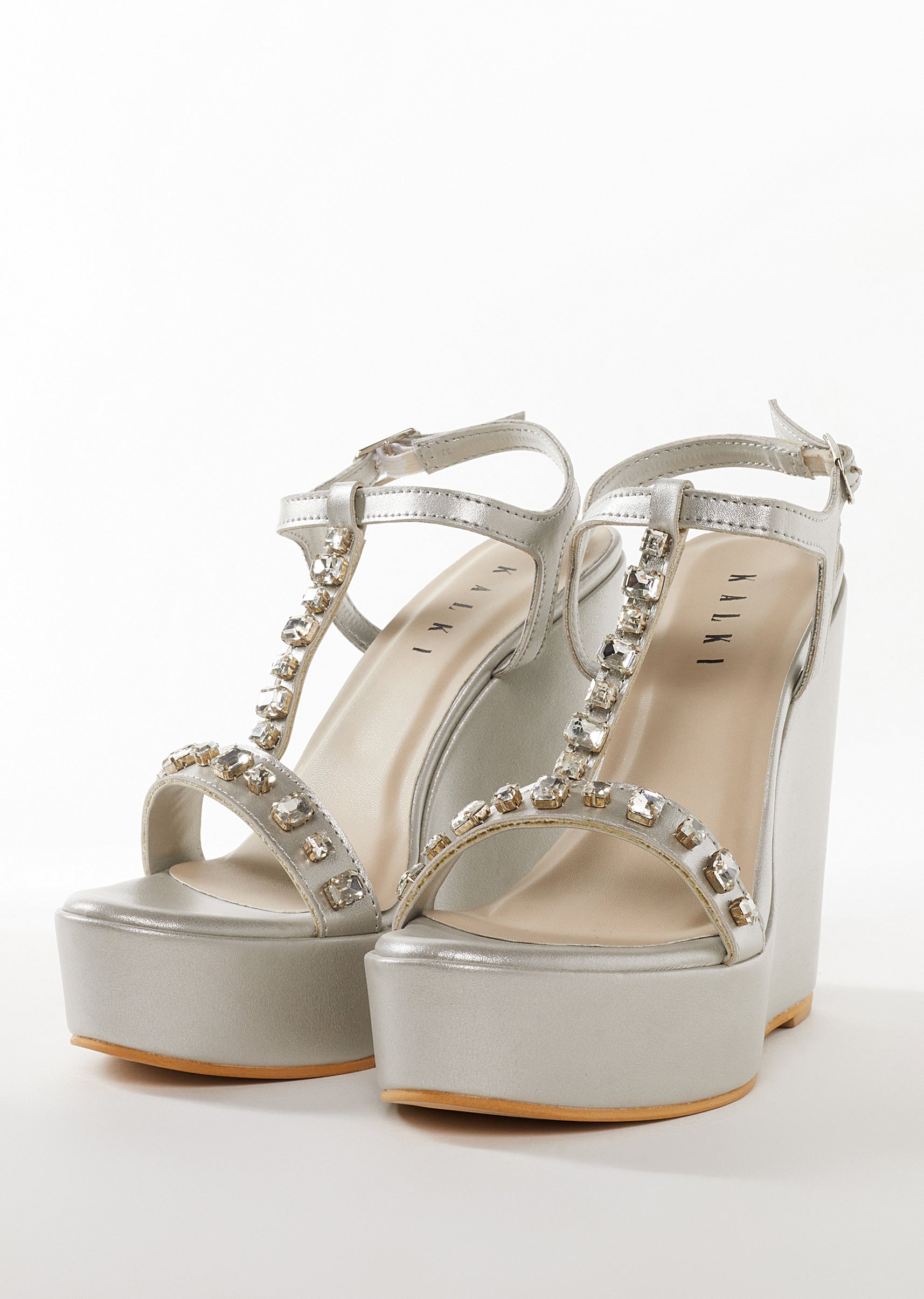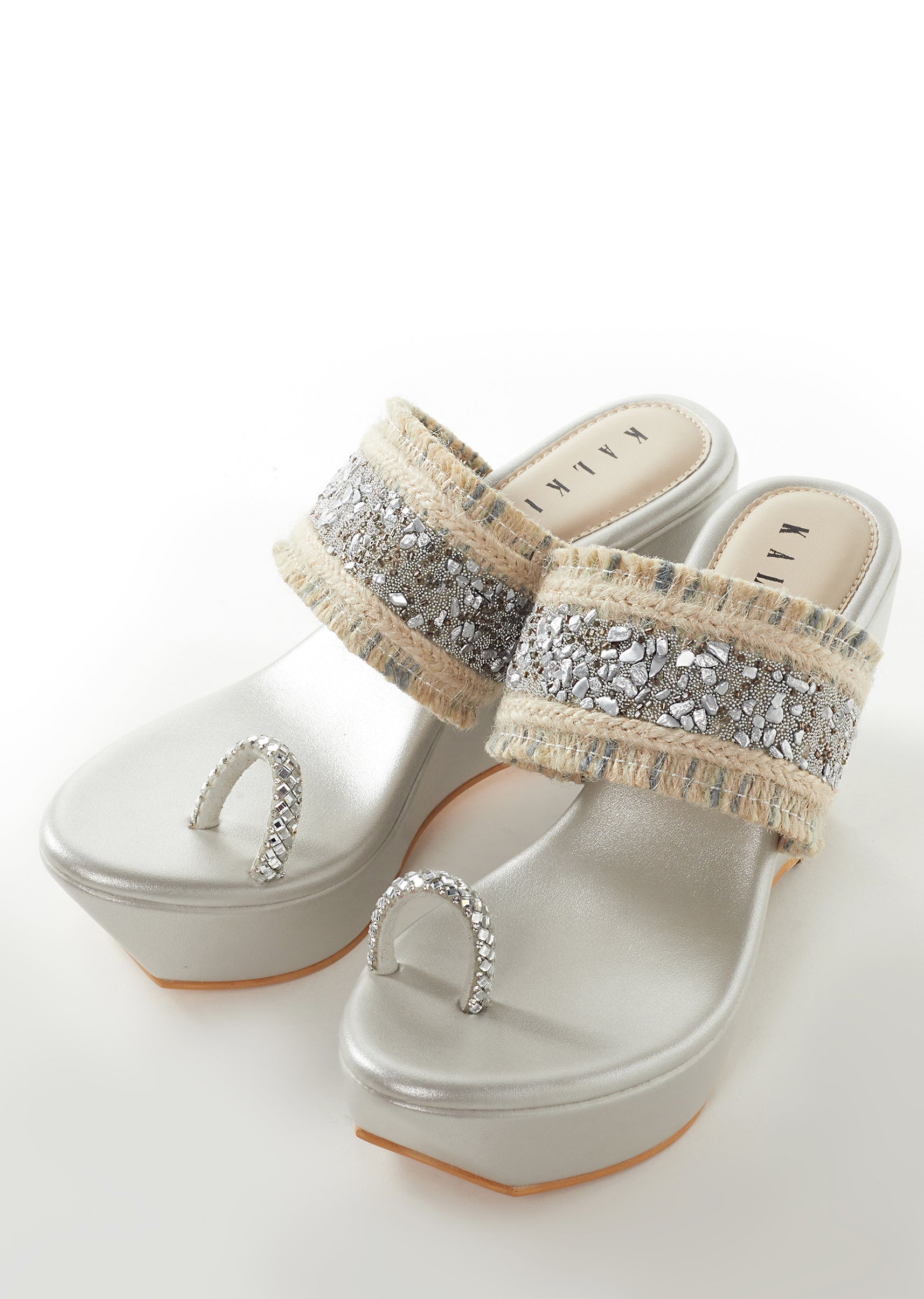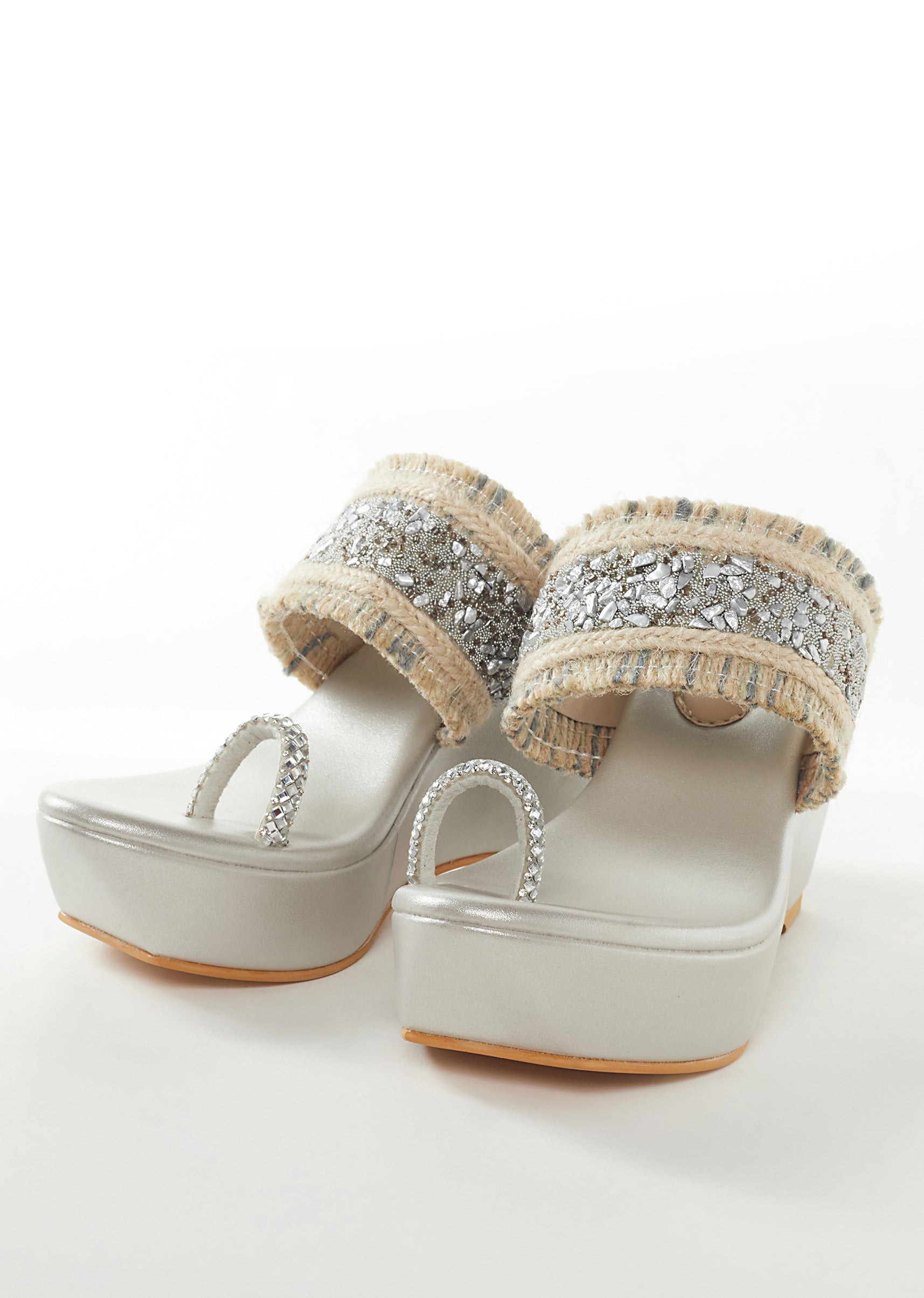 Silver Faux Leather Womens Footwear With Embellished Detail Work
