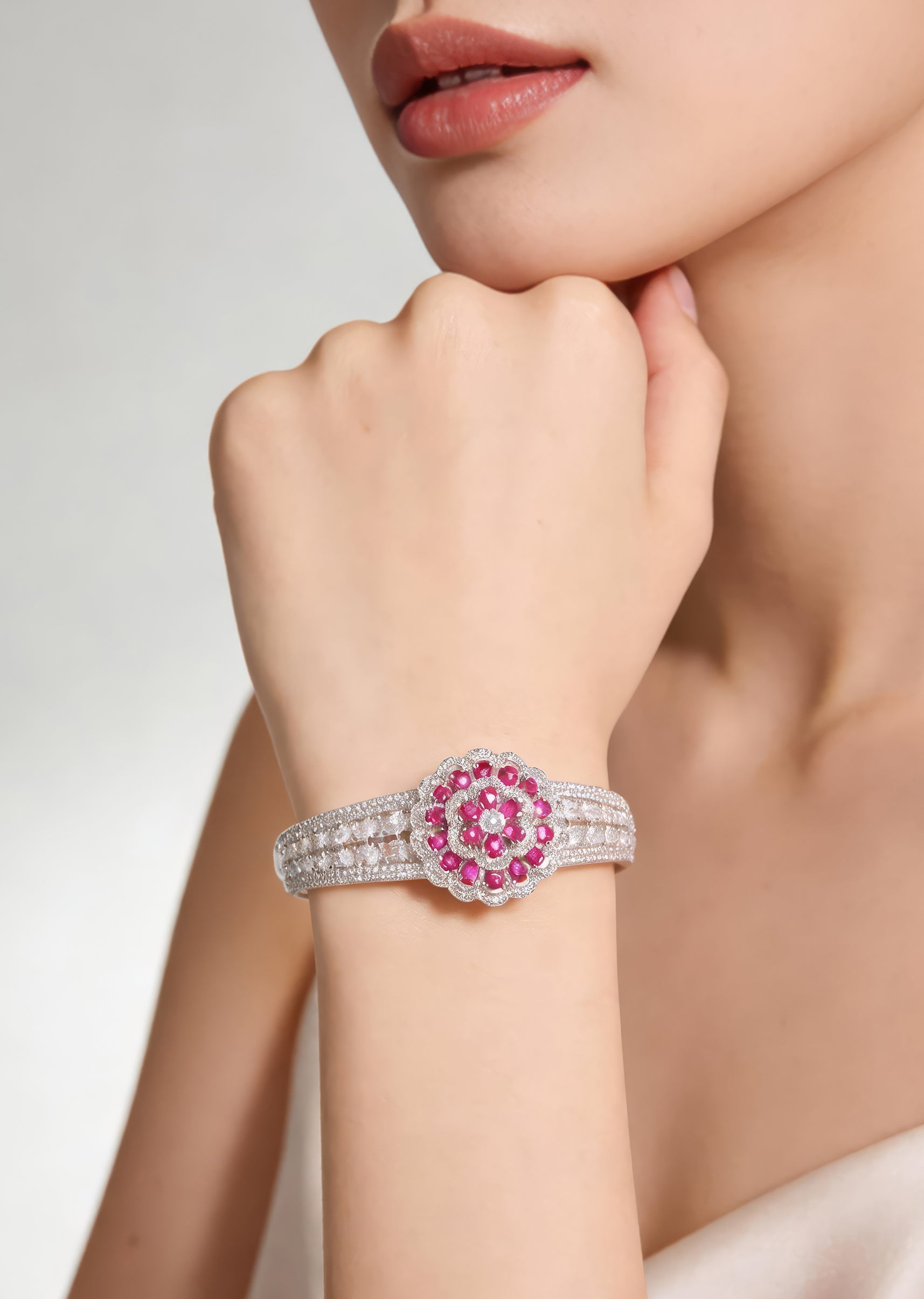 Silver Finish Bracelet In Mix Metal With Elegant Floral Style And Rani Pink Simulated Rubies And Cubic Zirconia Accents