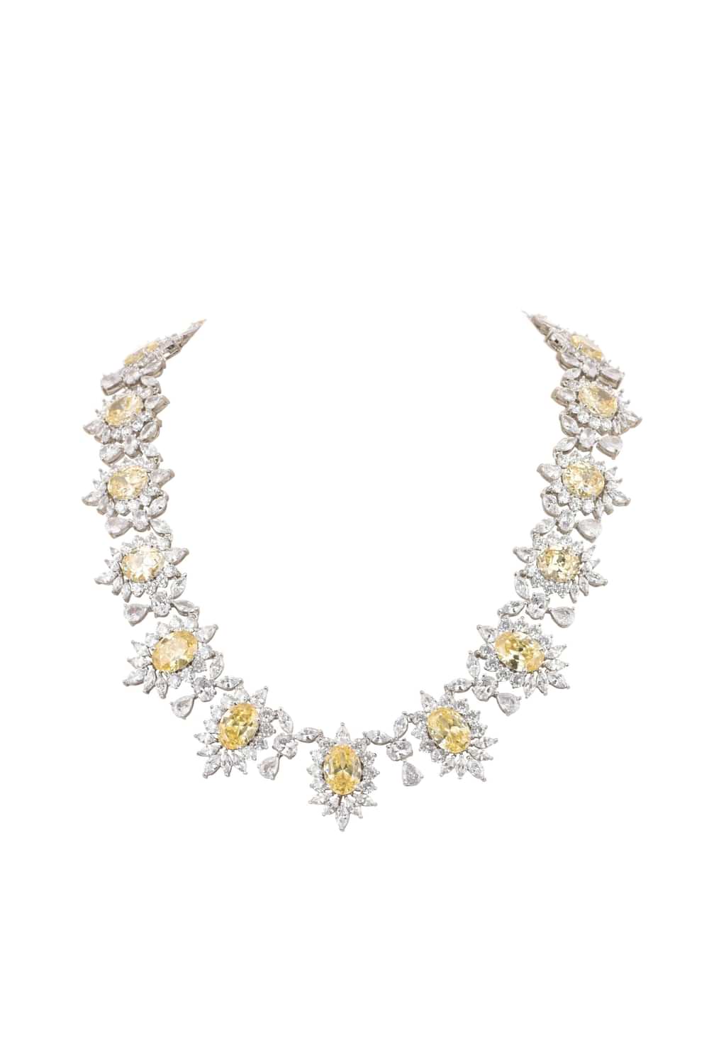 - Featuring an Elizabethan-style necklace adorned with oval yellow stones and faux diamonds that add an opulent charm.