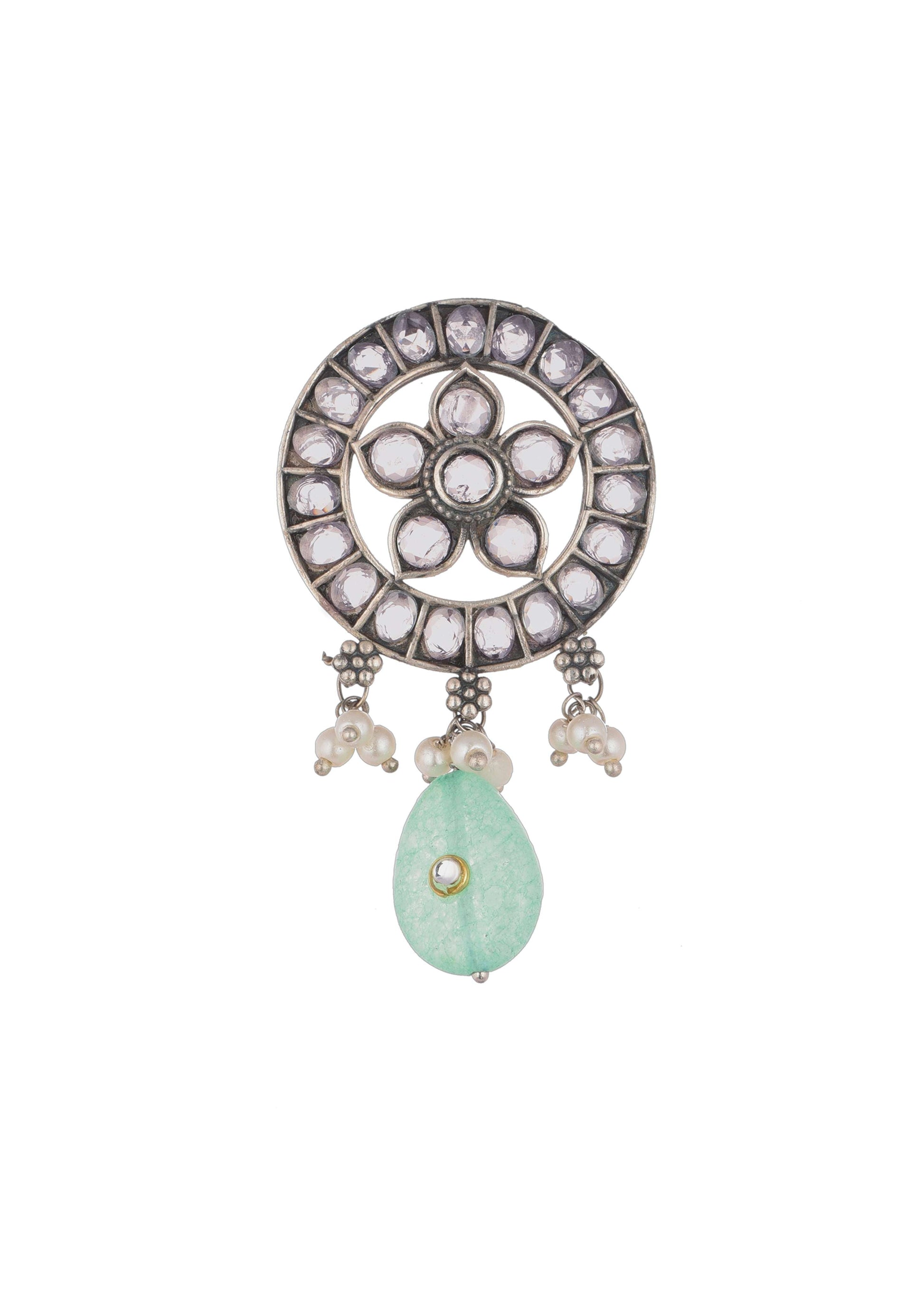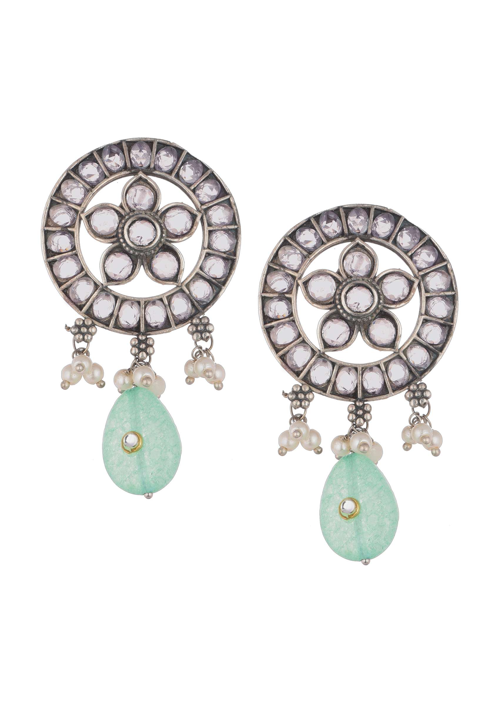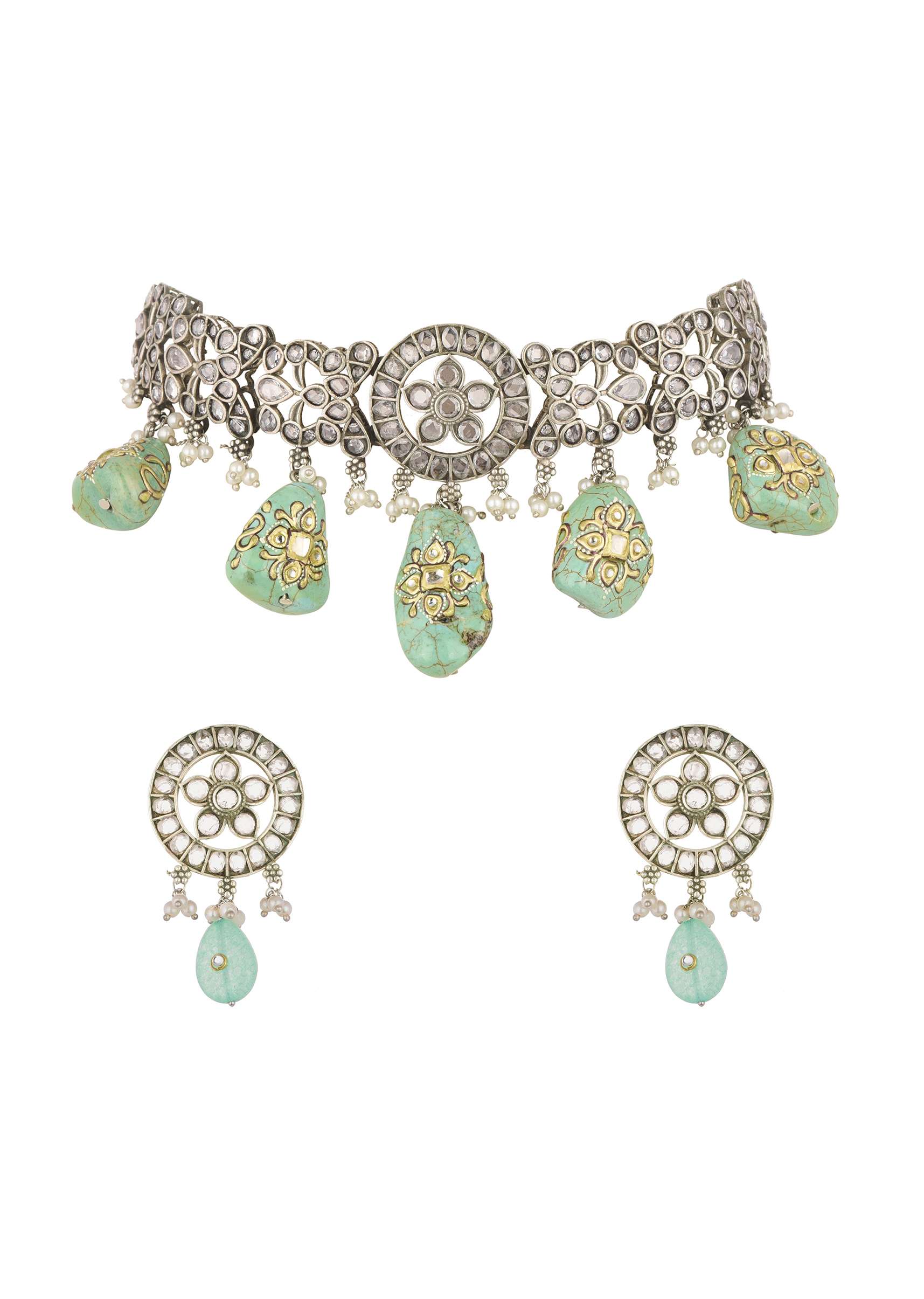 - Elevate your style with our oxidised necklace set adorned with exquisite aqua blue engraved stones.