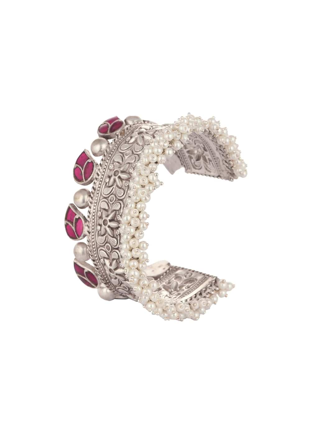 - Adorned with intricate meenakari work and a captivating pink stones this kada exudes elegance and sophistication.