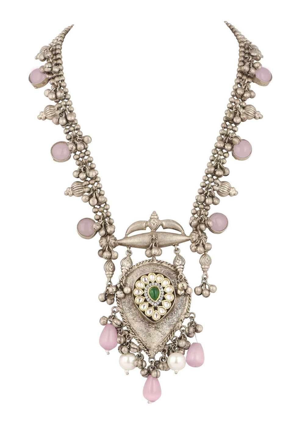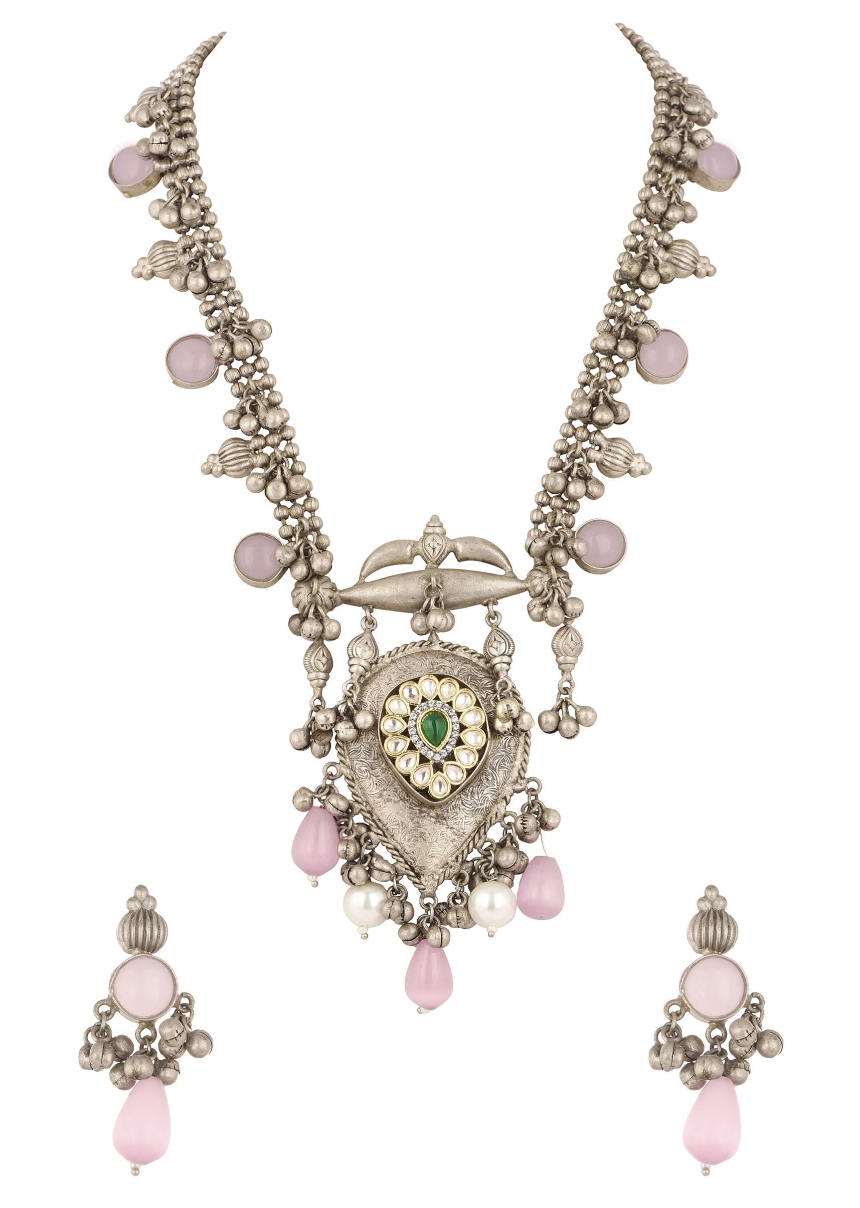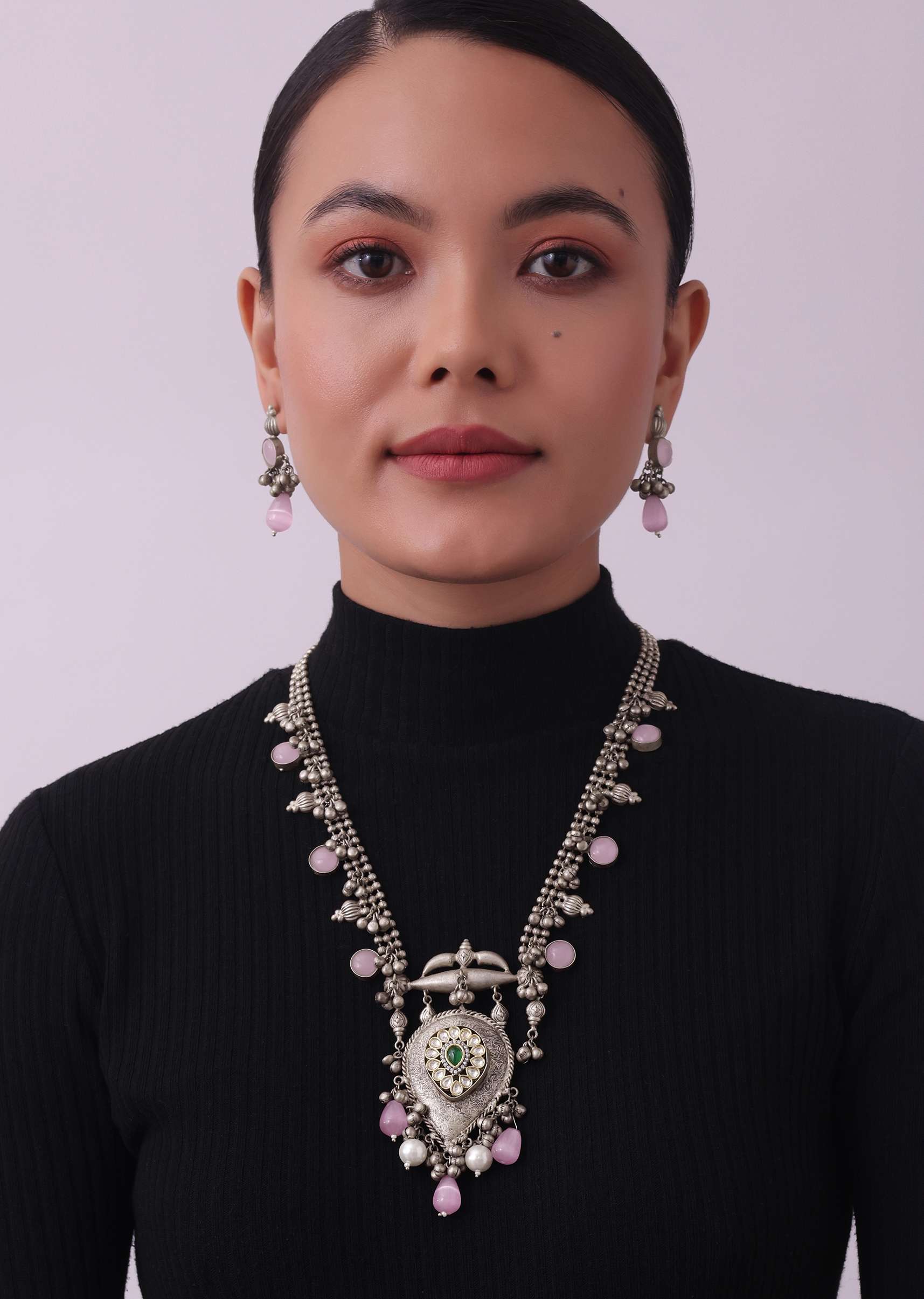 - Unleash your inner fashionista with our stunning silver finish oxidised long necklace set in a captivating fusion style.
