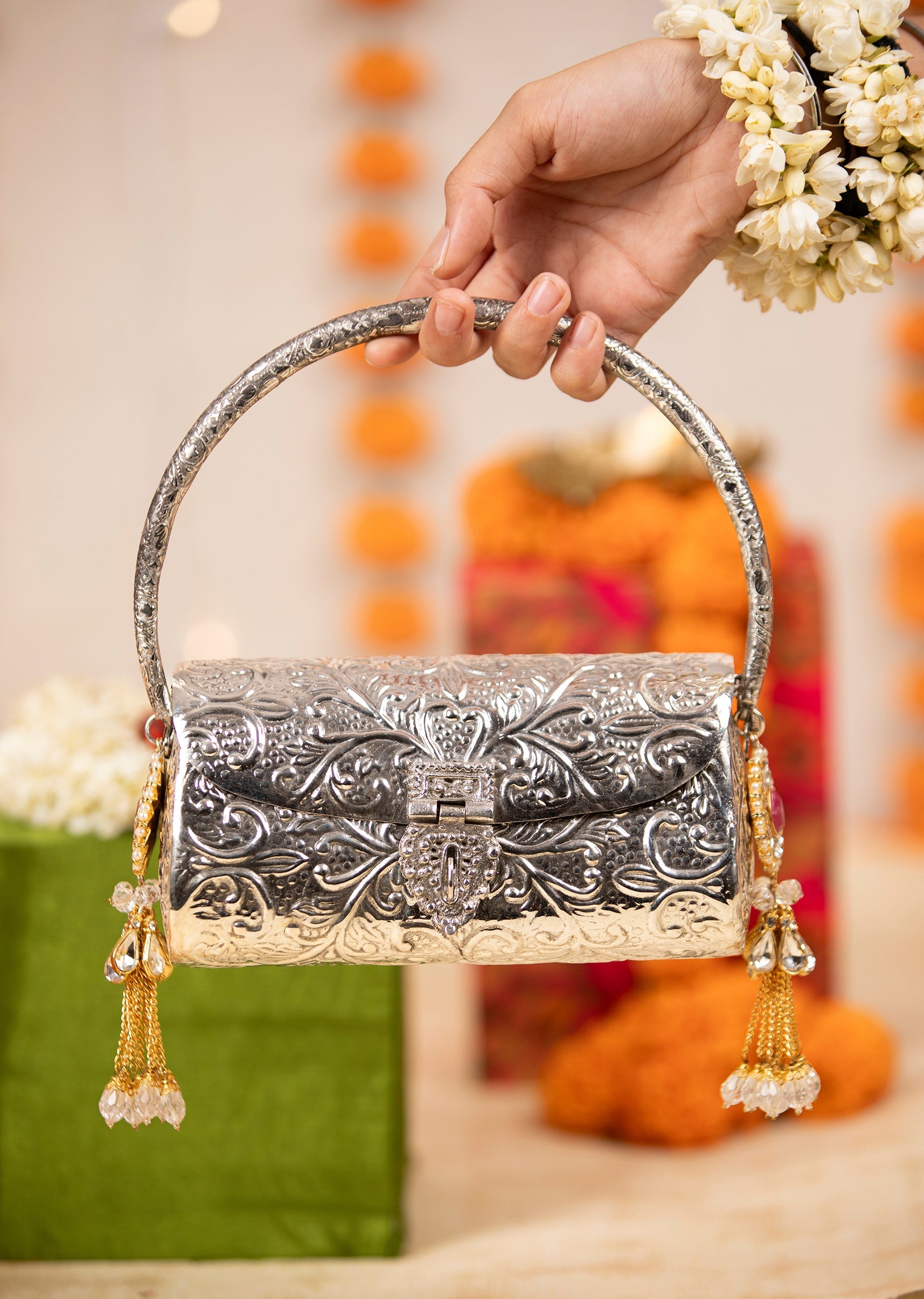 Turn every entrance into a moment with this silver metal bag, featuring bold floral embossed textures that shimmer beautifully under the light. Its sculpted surface adds a touch of modern elegance, perfect for weddings, festive nights, and chic celebrations. Compact yet striking, it brings effortless sophistication to any special-occasion look. Awarded as the Most Trusted Brand, we're delivering styles you love, just as promised.