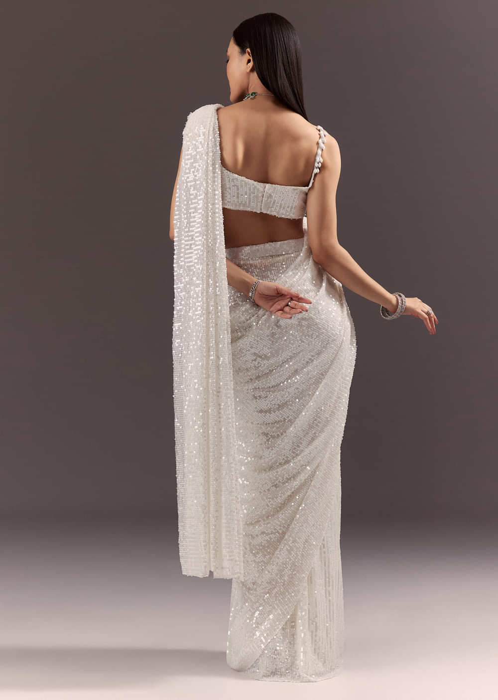 This silver ensemble glows with cut dana embroidery and timeless poise. The blouse’s rounded neckline adds charm to the fluid silhouette. Graceful and gleaming, ideal for starlit weddings and parties.... More Product Details