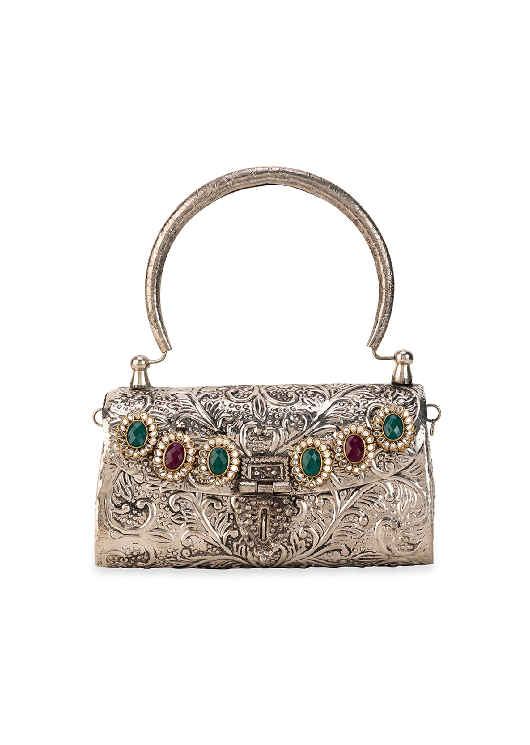Make an unforgettable entrance with this silver metal bag, embellished with jewel-toned stones in emerald green and ruby red, all beautifully framed in delicate pearls. Its intricate craftsmanship and rich... More Product Details