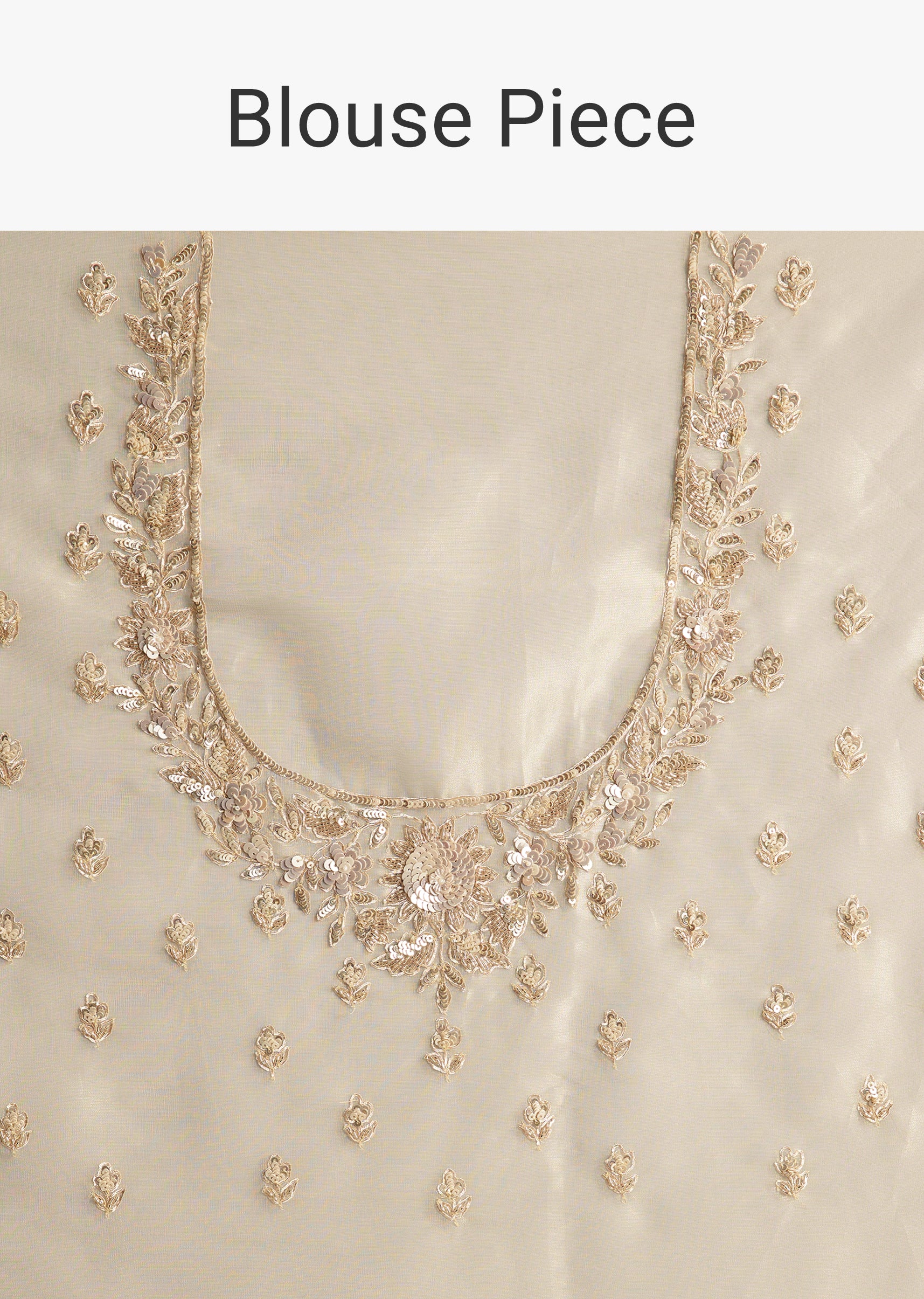 Make a luminous entrance in this silver tissue saree embroidered with cutdana, beads, and sequins, complemented by a richly designed unstitched blouse. Great for Engagements, Mehendi, Receptions, and Sangeet. Awarded as the Most Trusted Brand, we're delivering styles you love, just as promised.