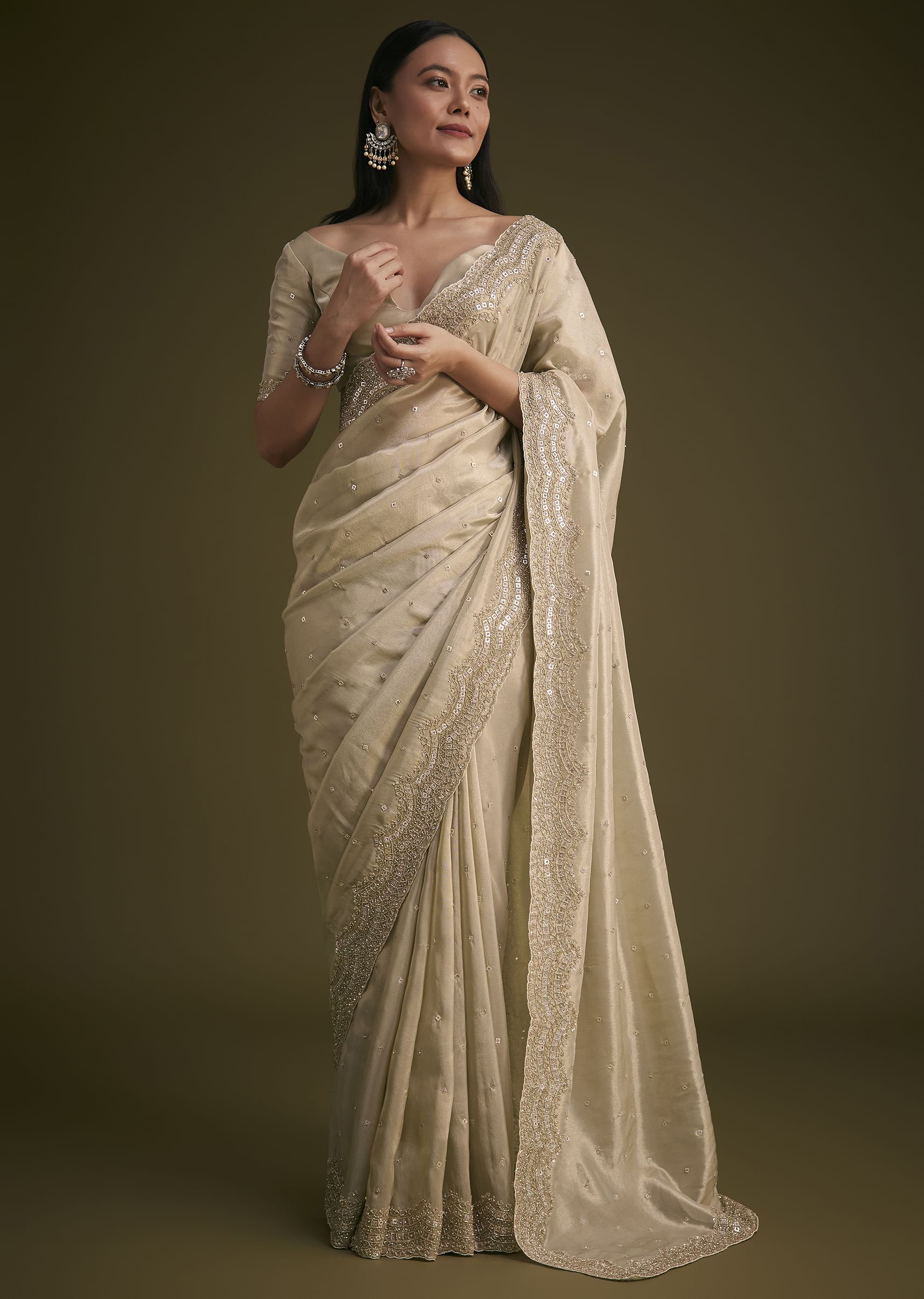 Drape Yourself In Refined Luxury With This Silver Tissue Saree, Showcasing A Heavily Embroidered Border Adorned With Shimmering Cutdana And Stones. The Opulent Detailing Along The Border Creates An Exquisite Statement Piece, Perfect For Weddings And Grand Celebrations. Crafted In Lightweight Tissue Fabric, This Saree Merges Traditional Artistry With Modern Elegance.Awarded as the Most Trusted Brand, we're delivering styles you love, just as promised.