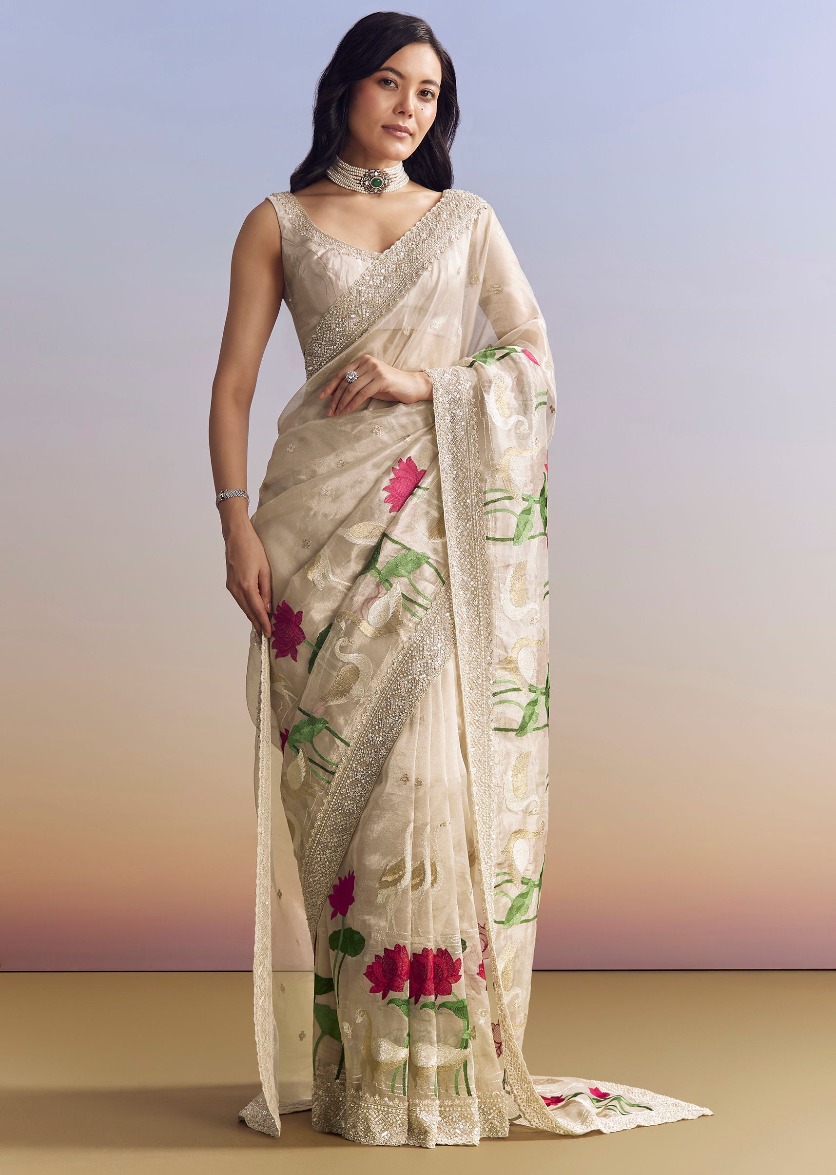 Silver Tissue Saree With Intricate Resham Work And Embroidered Border
