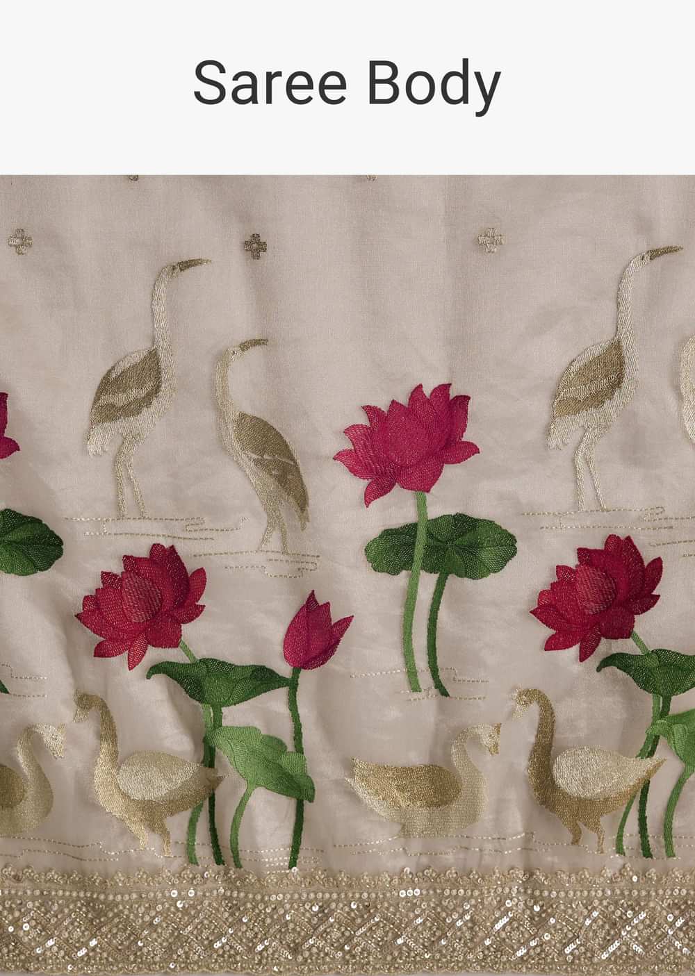 A standout piece for haldi or mehendi, this silver saree features a richly embroidered border and resham-thread motifs of lotus, birds, and leaves throughout. Sequins and beads add festive sparkle.... More Product Details