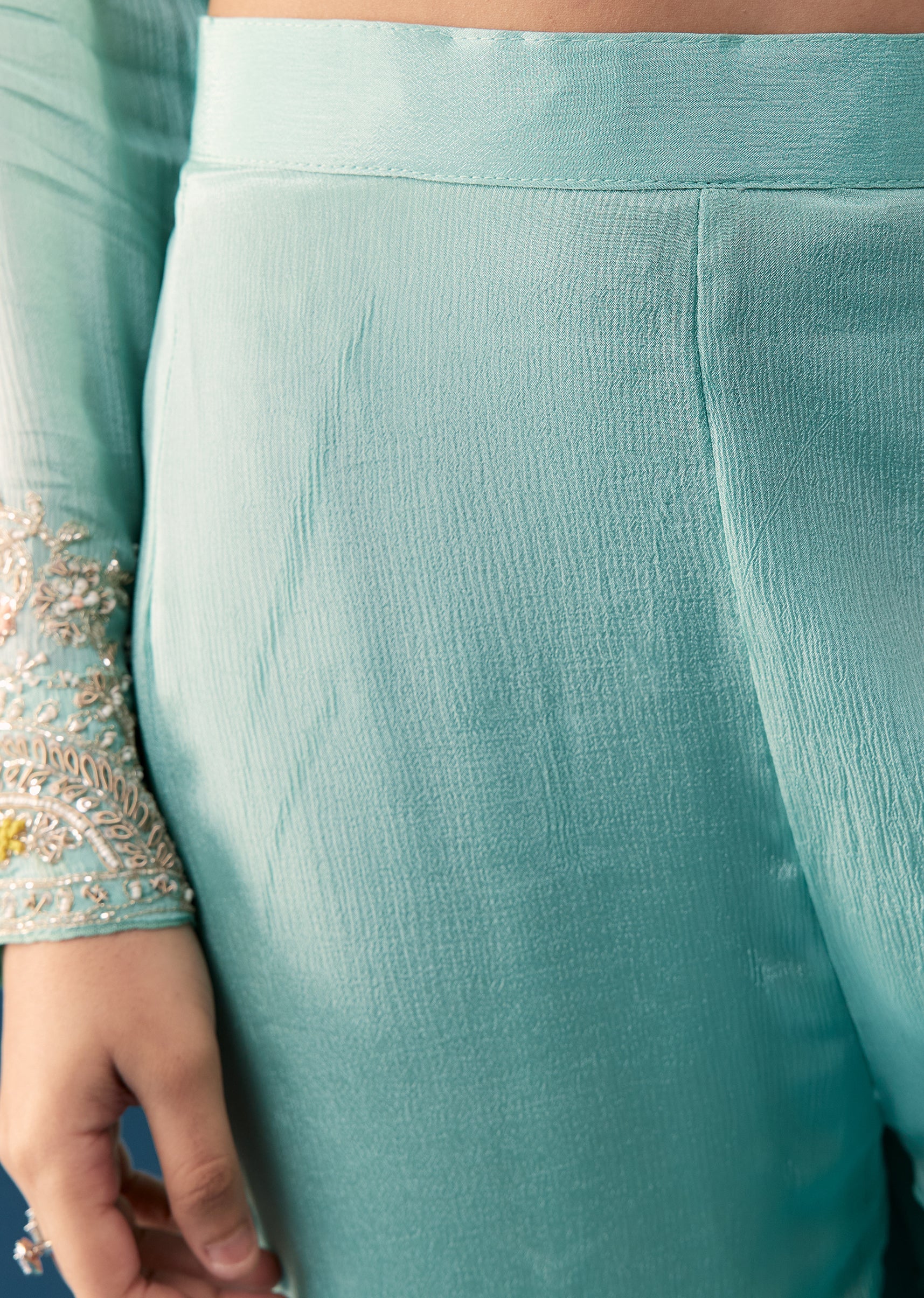 A serene sky blue anarkali suit crafted in soft chinon fabric, this outfit is adorned with intricate embroidery and shimmering moti cut dana work for a delicate, luminous finish. Featuring... More Product Details