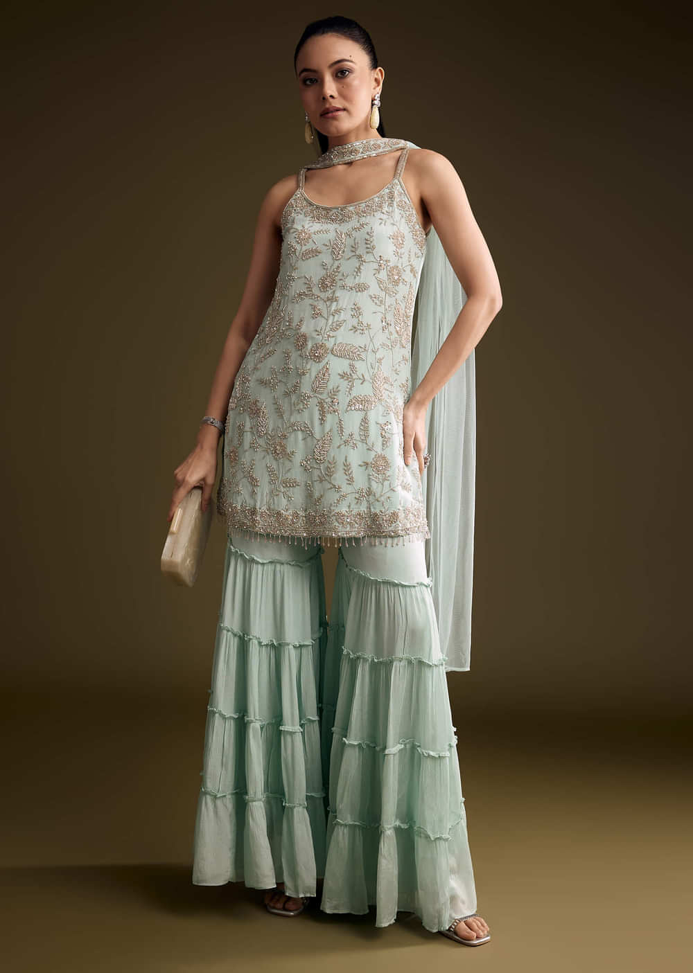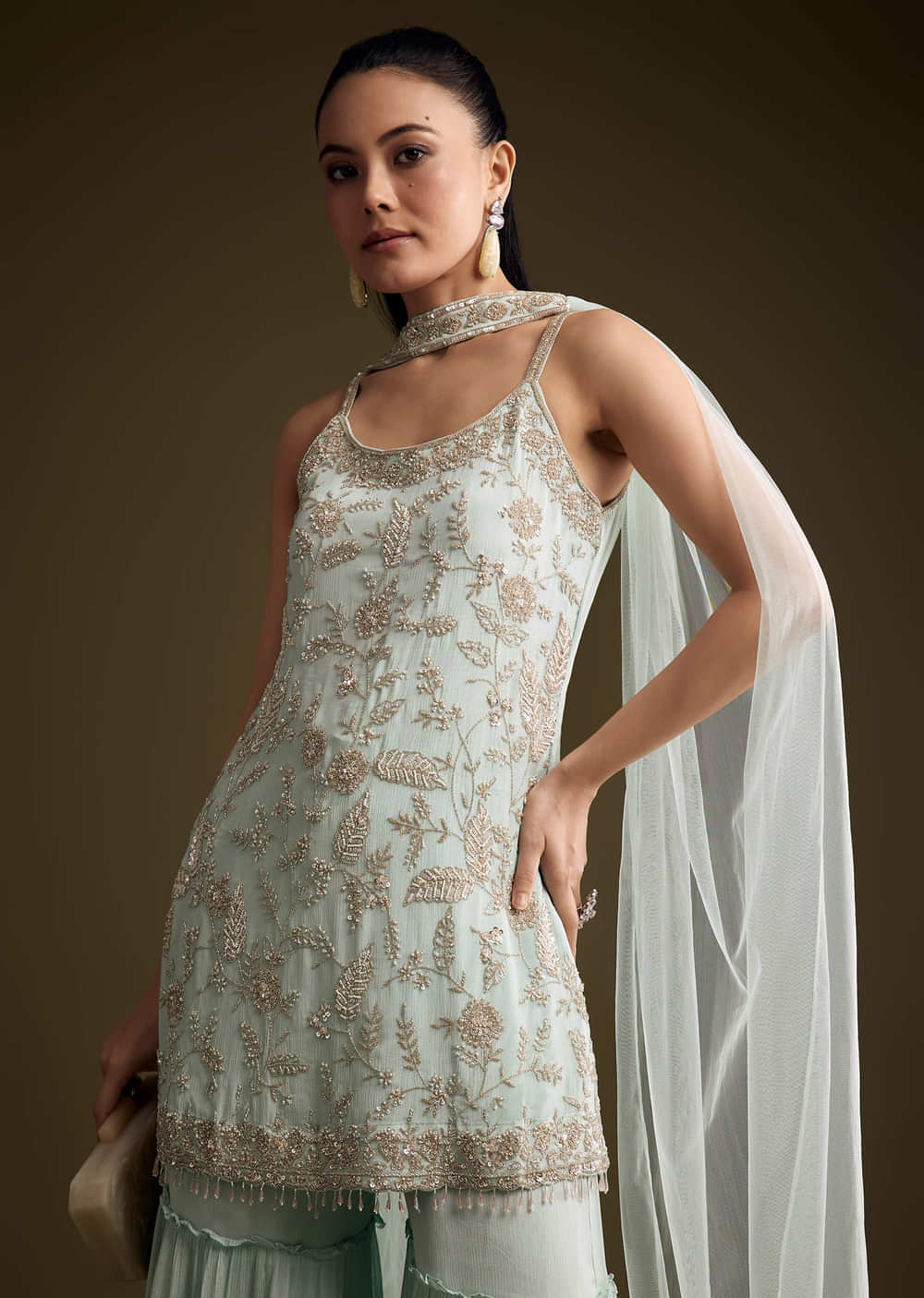 When colour needs to feel airy and bright, this sky blue chinon sharara suit delivers soft drape with a gentle glow. Sequins and moti accents trace the kurta to catch... More Product Details