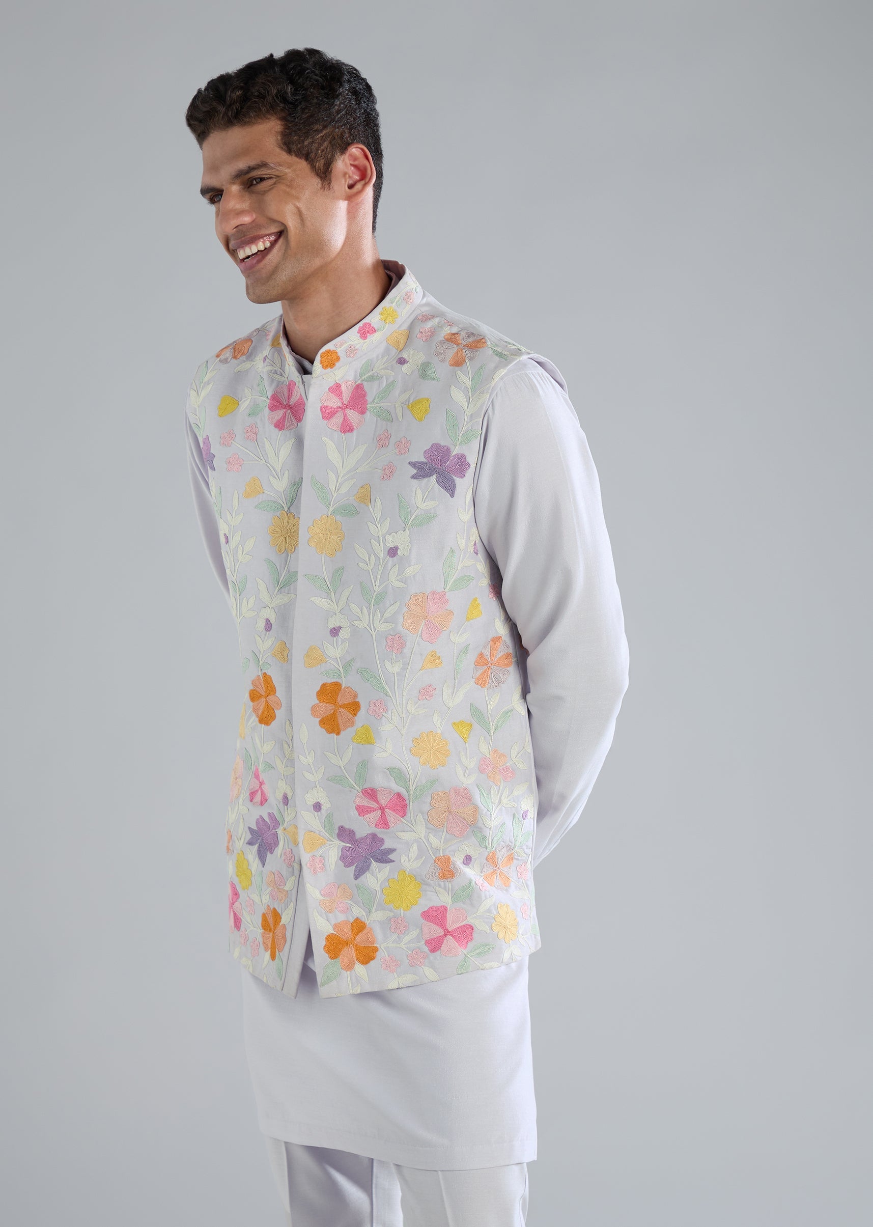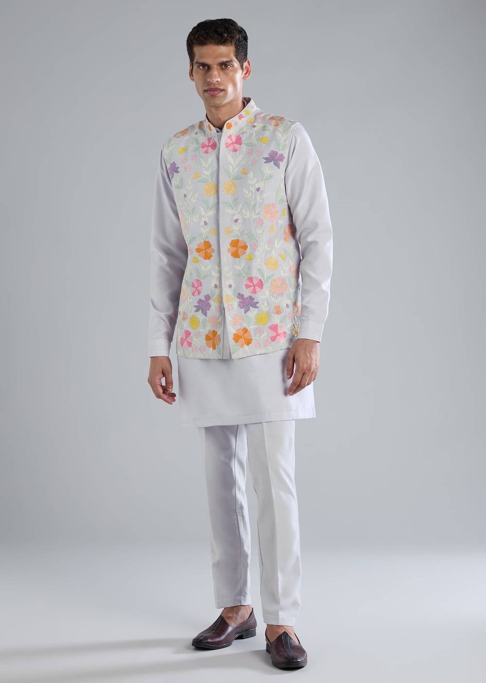 Fresh and festive, this sky blue kurta jacket set crafted in smooth silk fabric is perfect for haldi and mehendi celebrations or for attending a wedding as a guest. The jacket features delicate dori work that adds soft handcrafted charm to the pastel hue. Designed with full sleeves and a mandarin collar, the ensemble includes front hook eye closures on both the jacket and the bottoms for a streamlined and polished appearance. Complete with jacket, kurta, and pants, this set offers comfort and elegance for daytime festivities. Awarded as the Most Trusted Brand, we're delivering styles you love, just as promised.