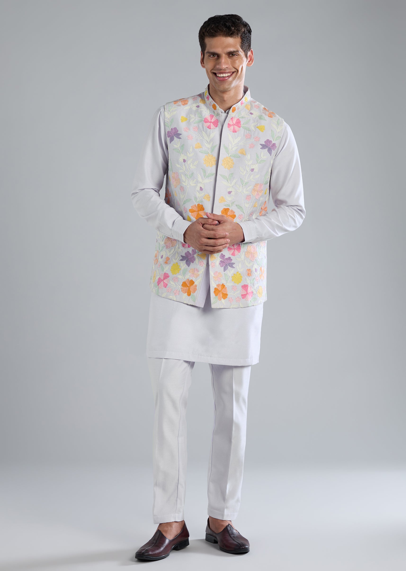 Fresh and festive, this sky blue kurta jacket set crafted in smooth silk fabric is perfect for haldi and mehendi celebrations or for attending a wedding as a guest. The... More Product Details