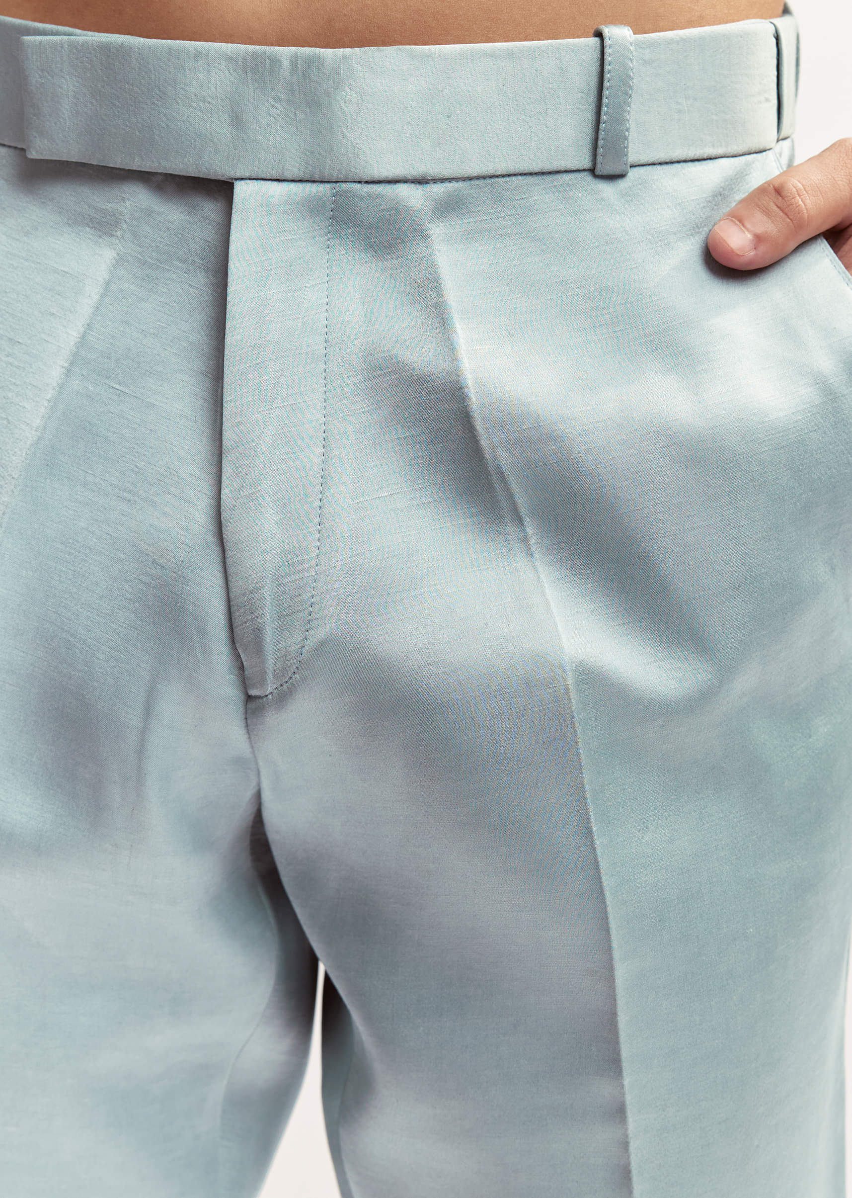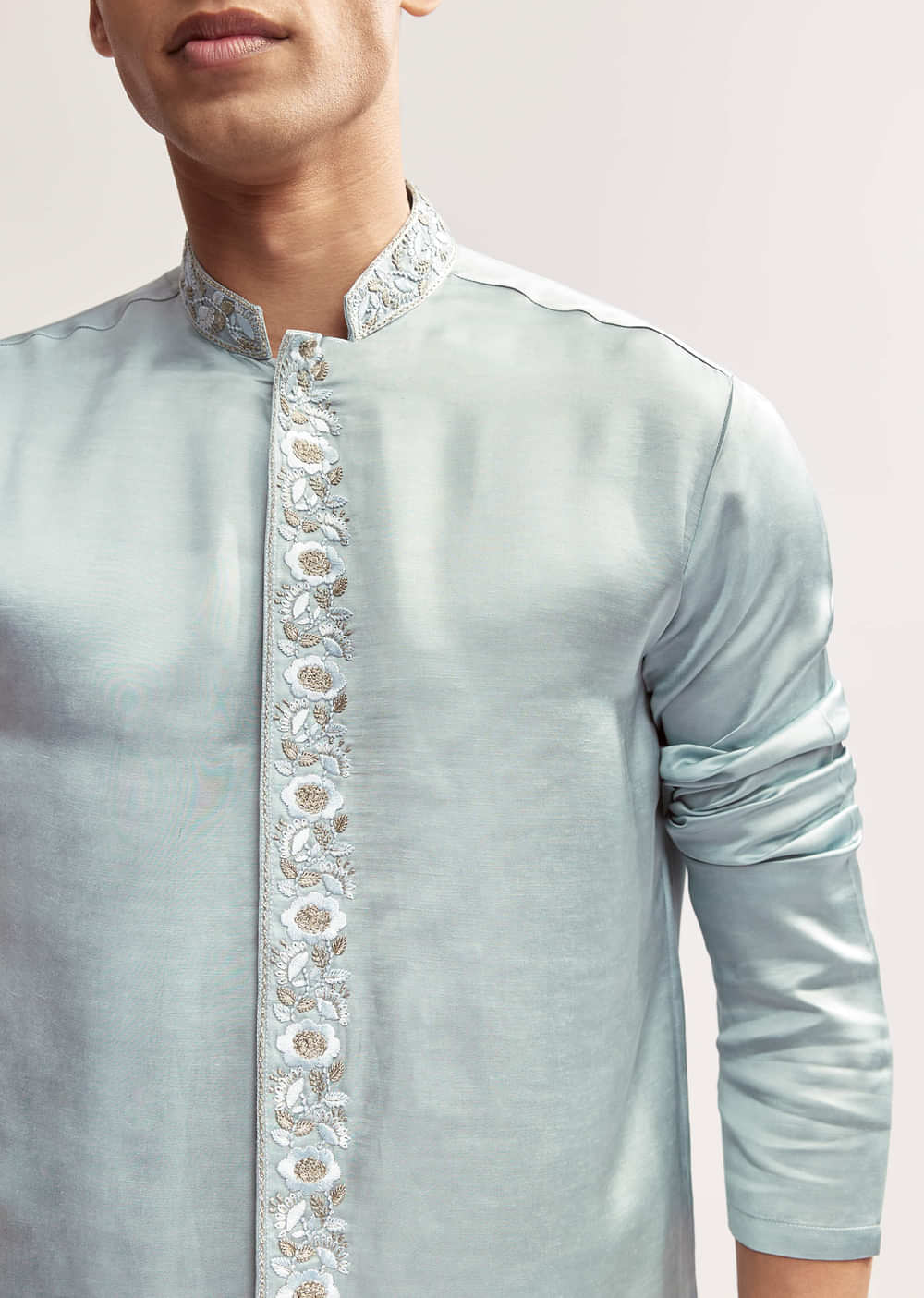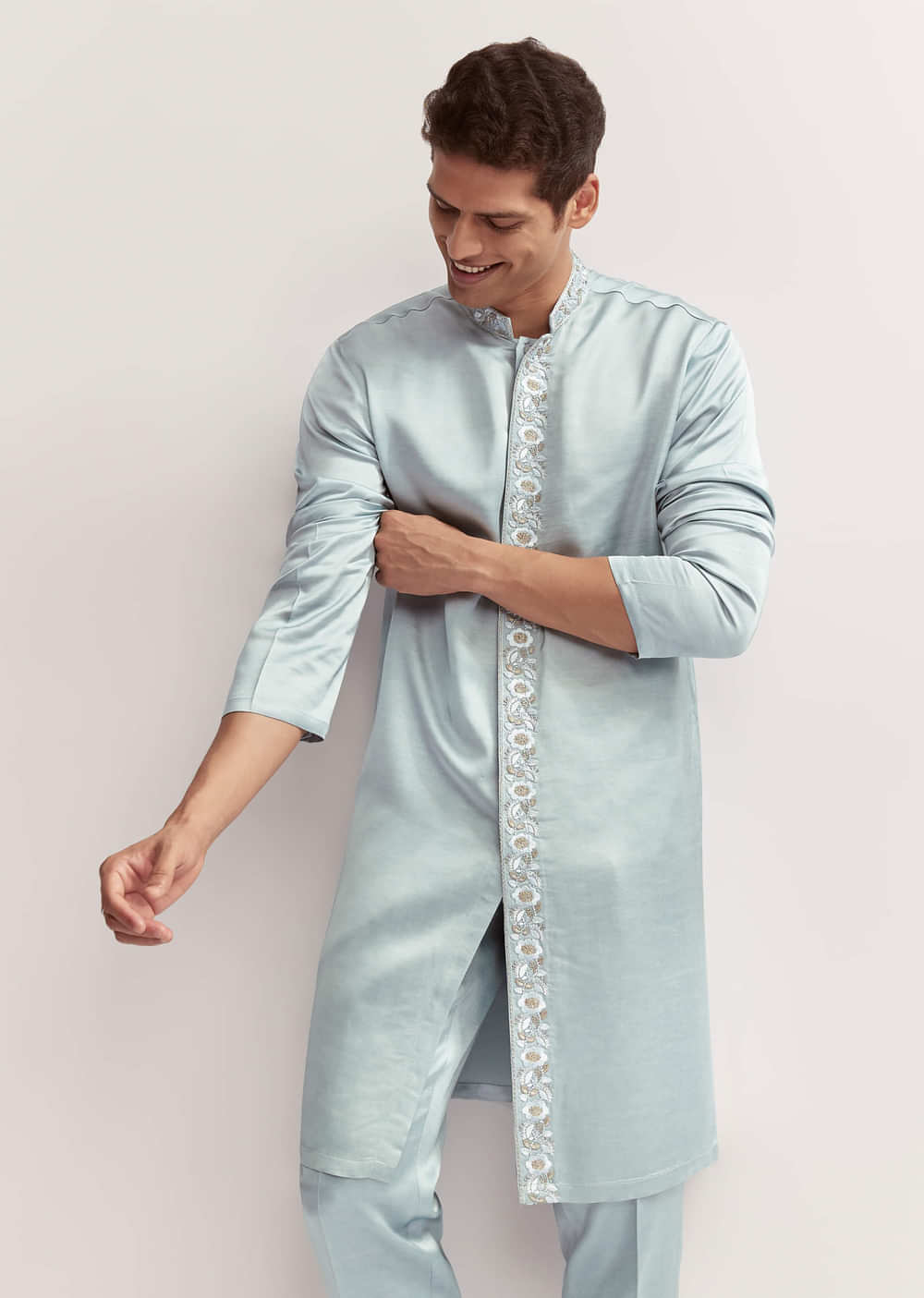 Daytime feels light and festive with this sky blue satin blend kurta set for men styled for haldi or mehendi. Zardosi hand embroidery gives the front-open kurta richness without weighing... More Product Details