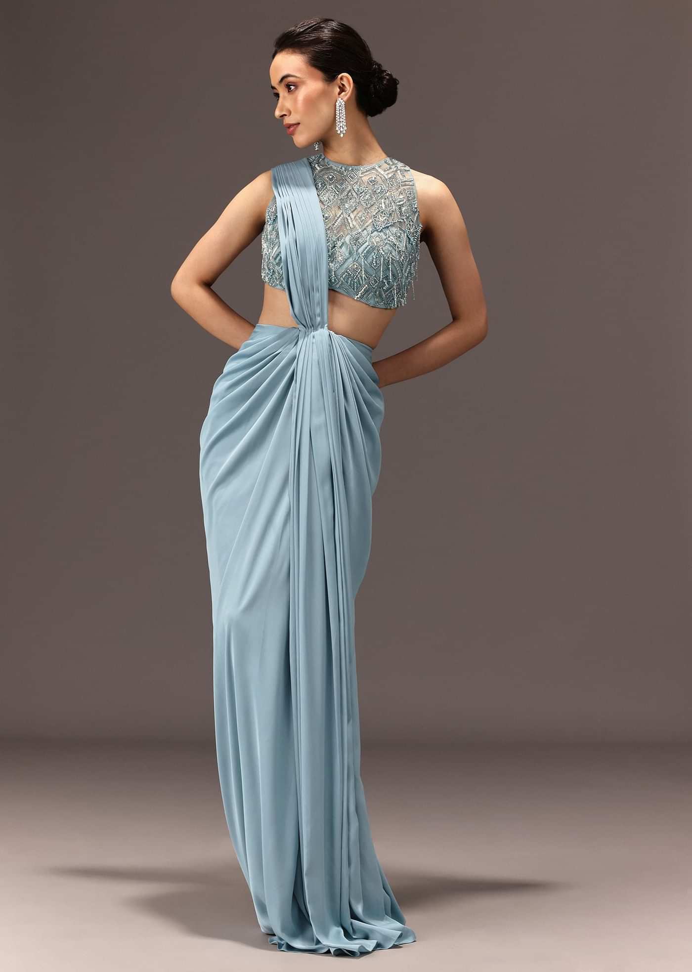 Sparkle and shine in our resplendent semistitched saree that is decked on a serene sky blue hue. Featuring selfonself hand work showcasing gleaming accents of embellishments. Expertly designed with a... More Product Details